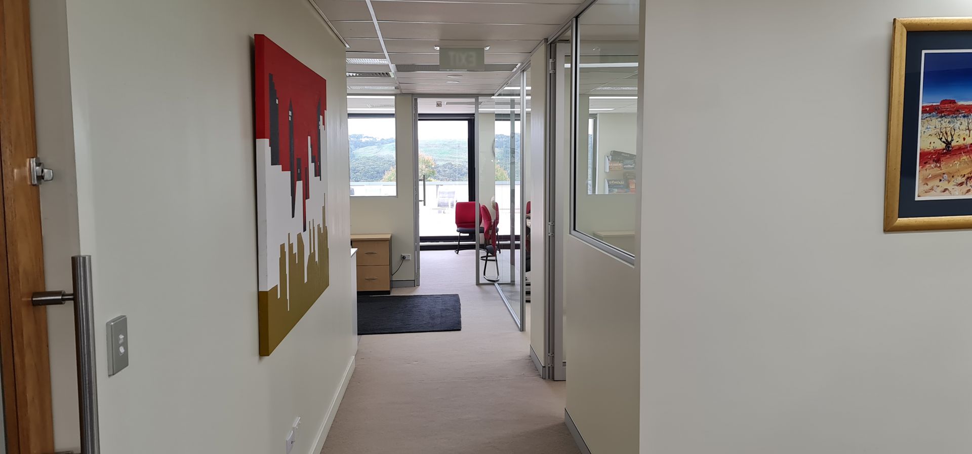 As you enter the fully fitted-out office, you'll be greeted by an abundance of natural light, flooding the space and creating a peaceful ambiance that is perfect for productivity and focus. The floor-to-ceiling windows provide an unobstructed view of the lush national park beyond, making this office space truly one-of-a-kind.
