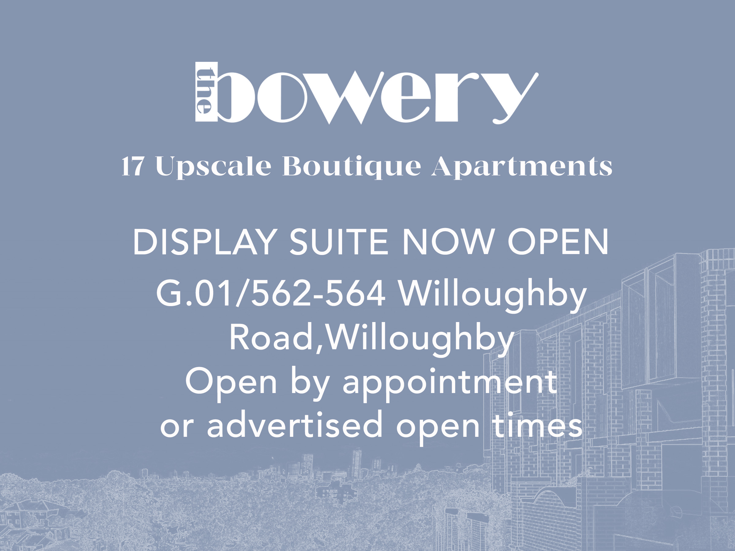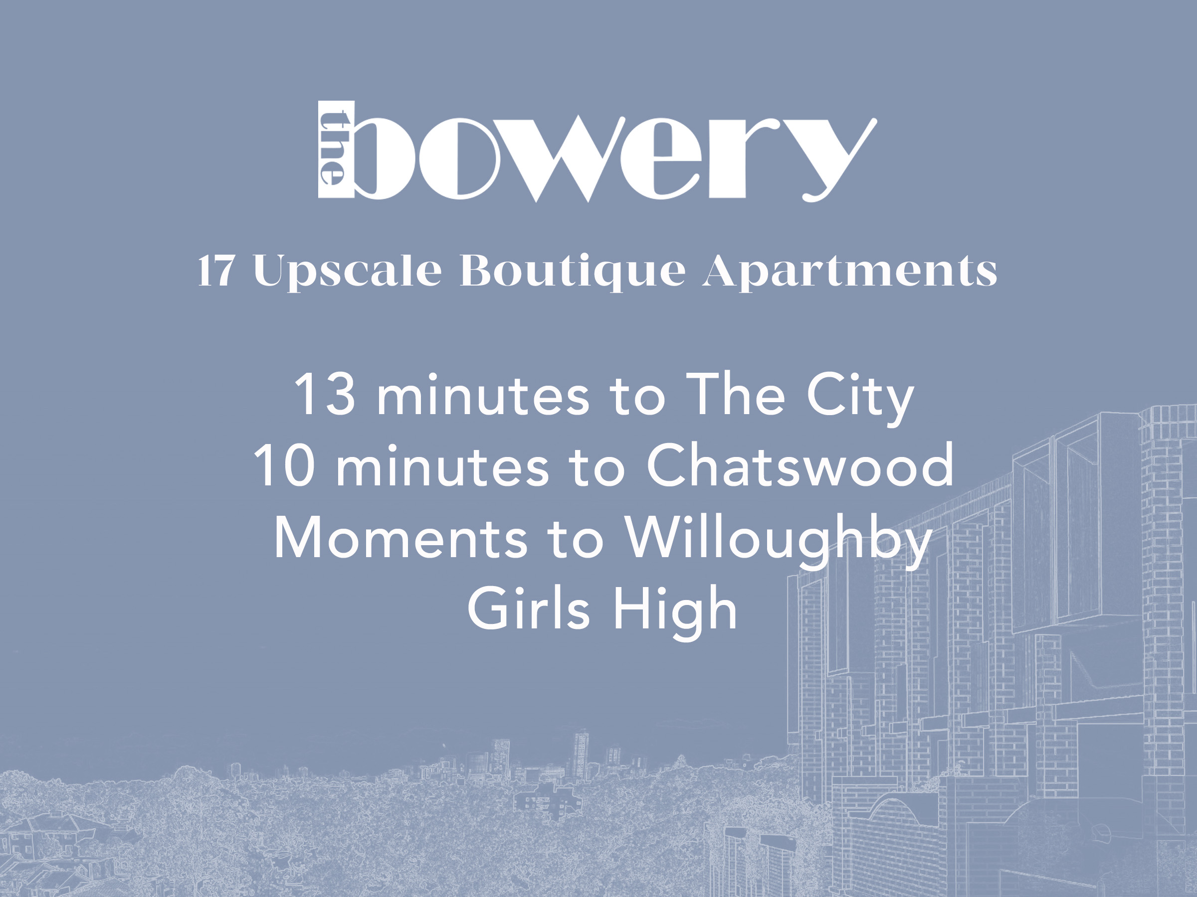 Blending modern luxury with a masterful homage to the building’s historical heritage, the BOWERY comprises of just 17 upscale boutique apartments skilfully designed for seamless living and entertaining and ready to move in! Inspired by the original structure and surrounding buildings, the BOWERY features a mix of one, two and three-bedroom upscale boutique residences, plus prime commercial suites on the ground floor. It offers unveiled convenience with footstep access to express buses to the city and Chatswood, fine dining and day-to-day amenities along Willoughby Road, plus moments to a selection of elite schools.