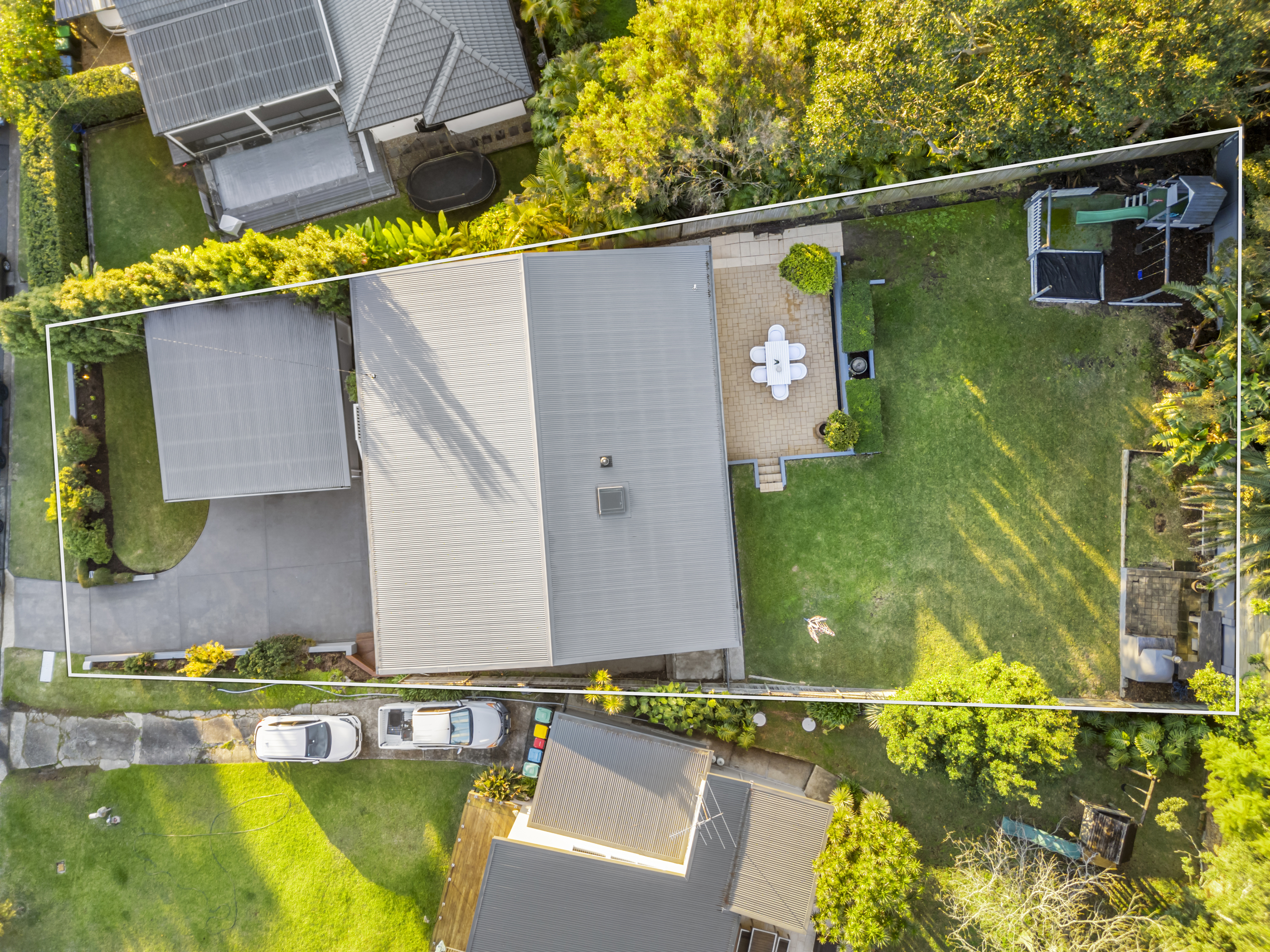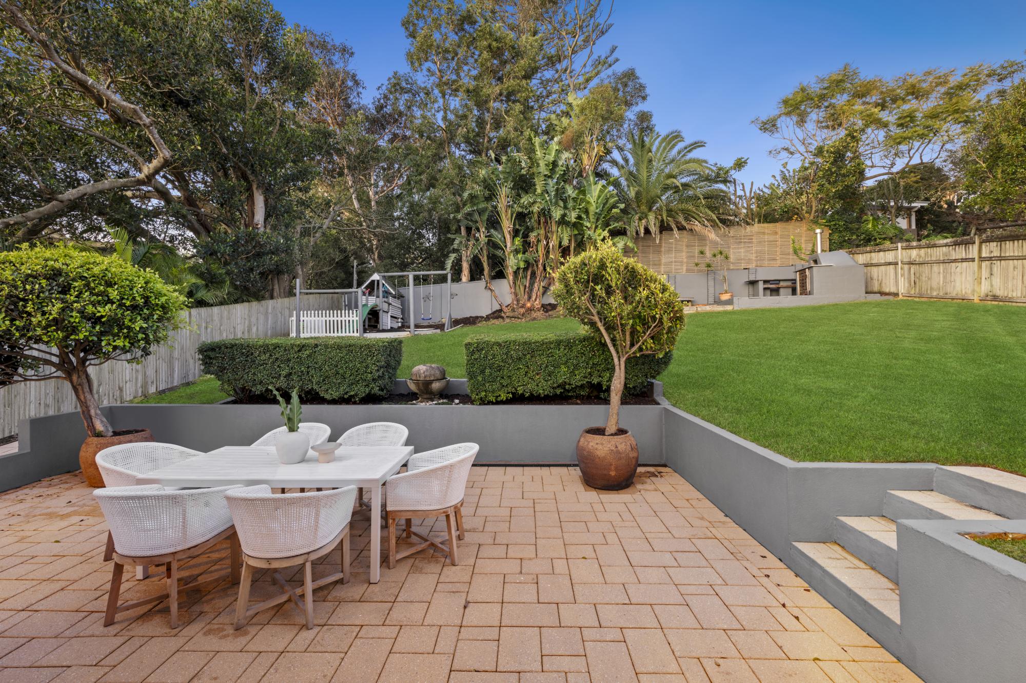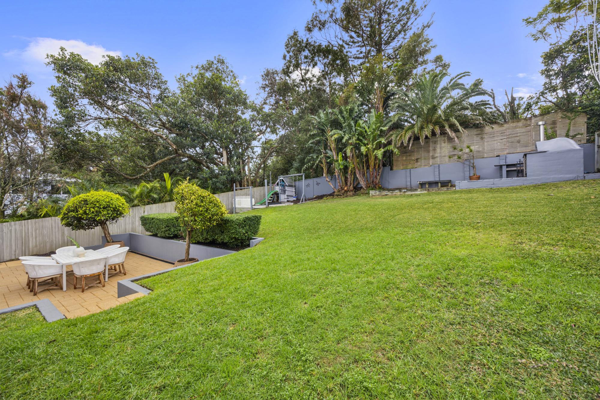 • Fully enclosed child-friendly lawn slopes gently up to a fitted kid’s playground