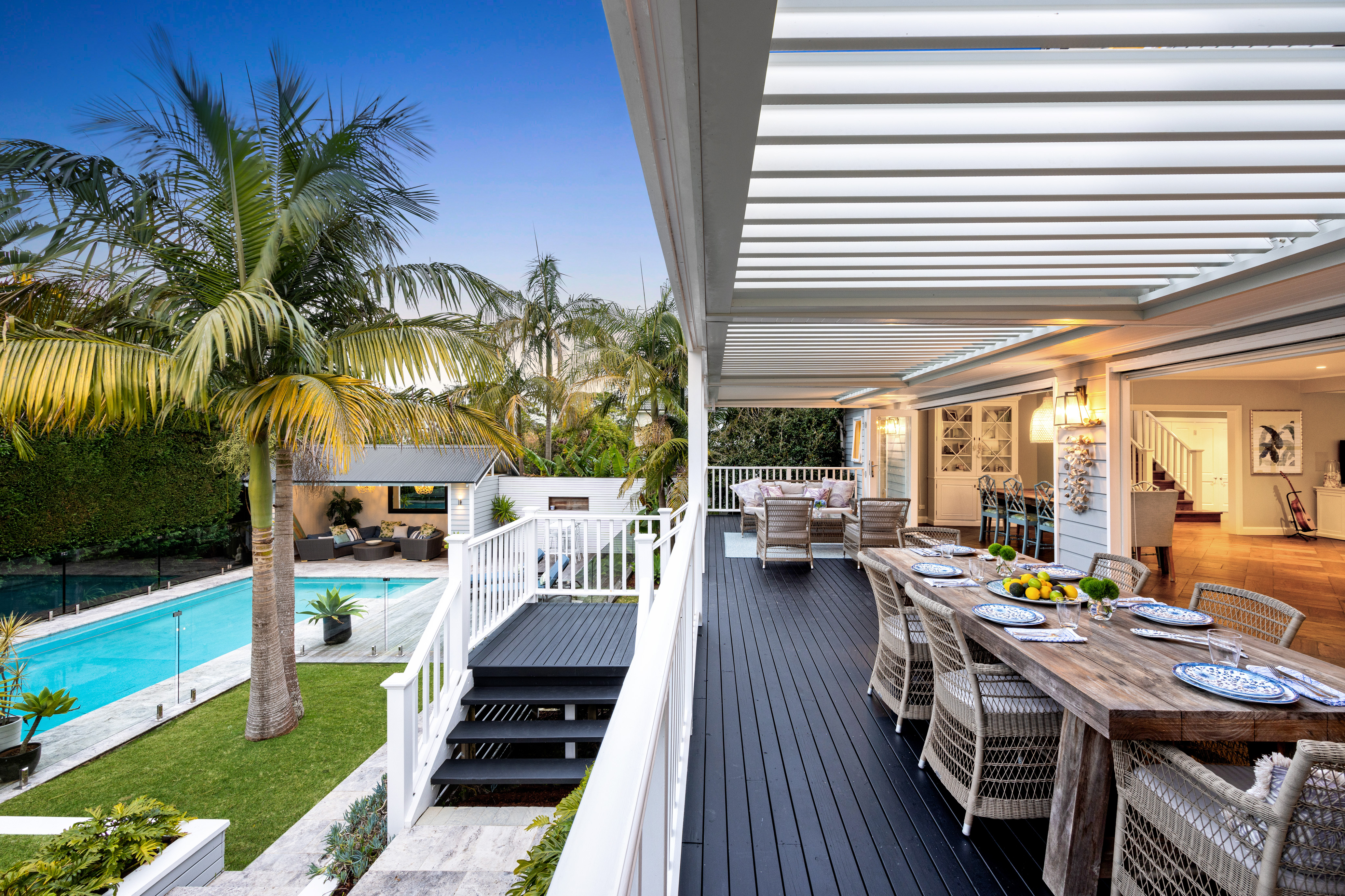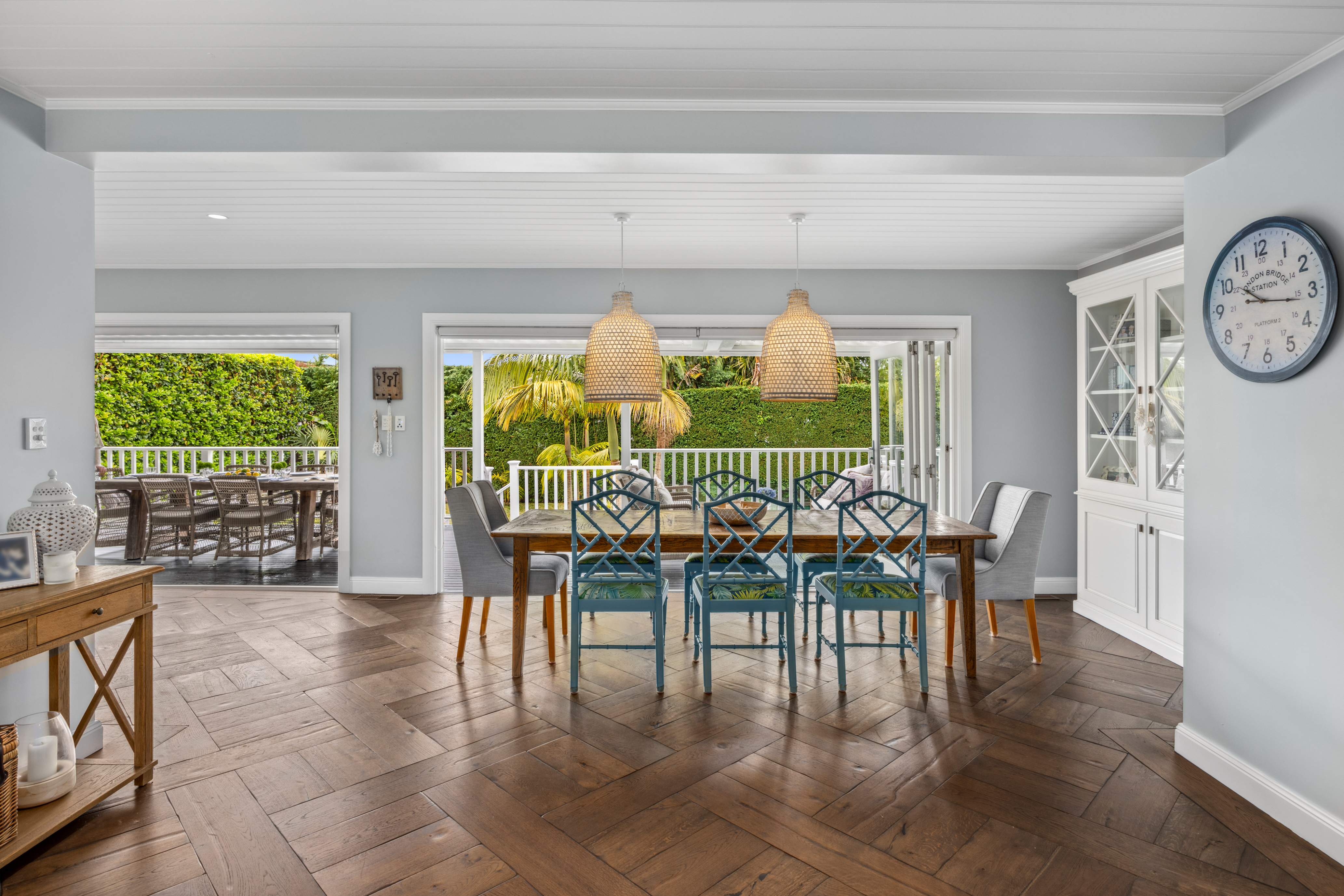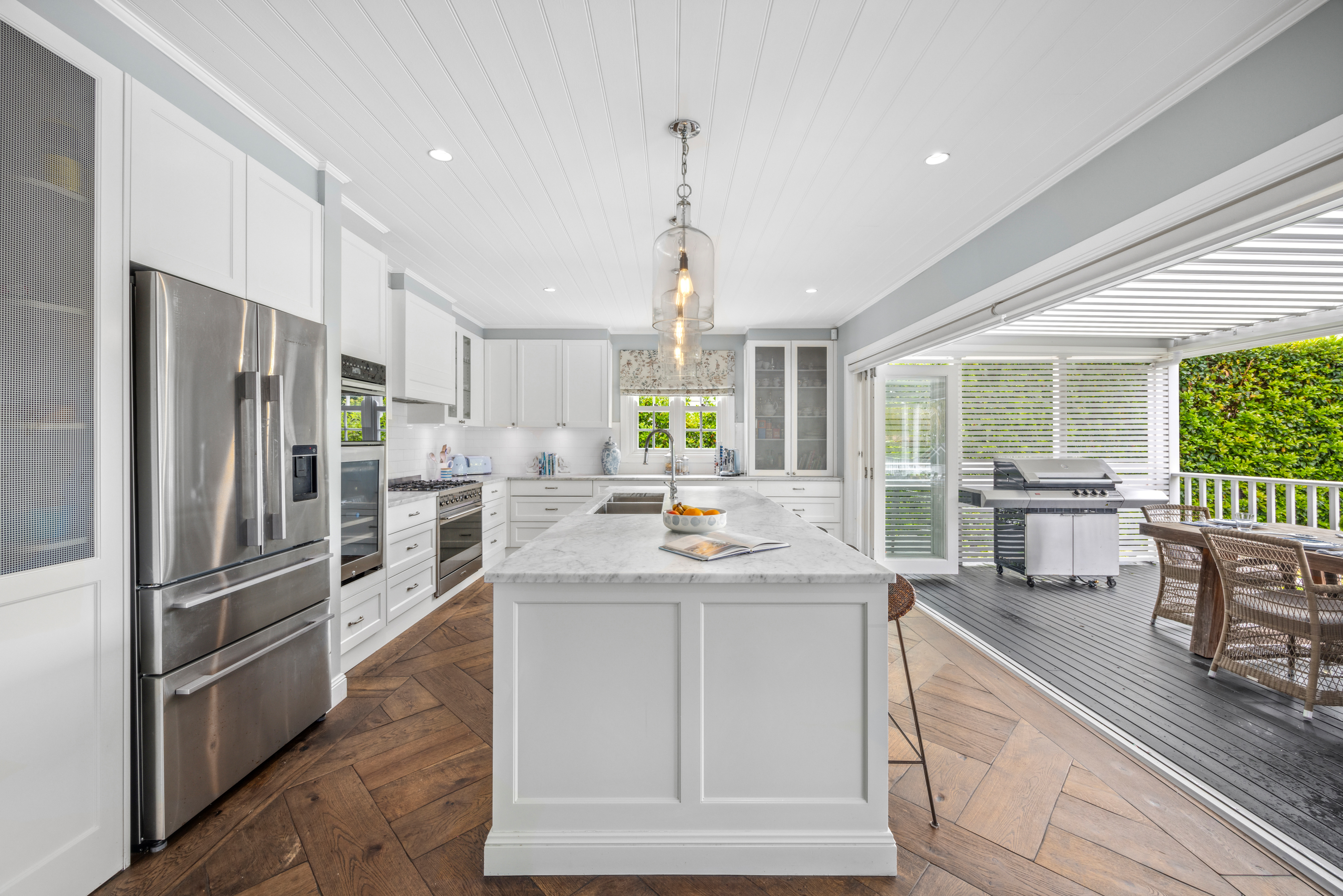 • Wide glass bi-folds open to a vast Vergola-covered deck overlooking the rear garden