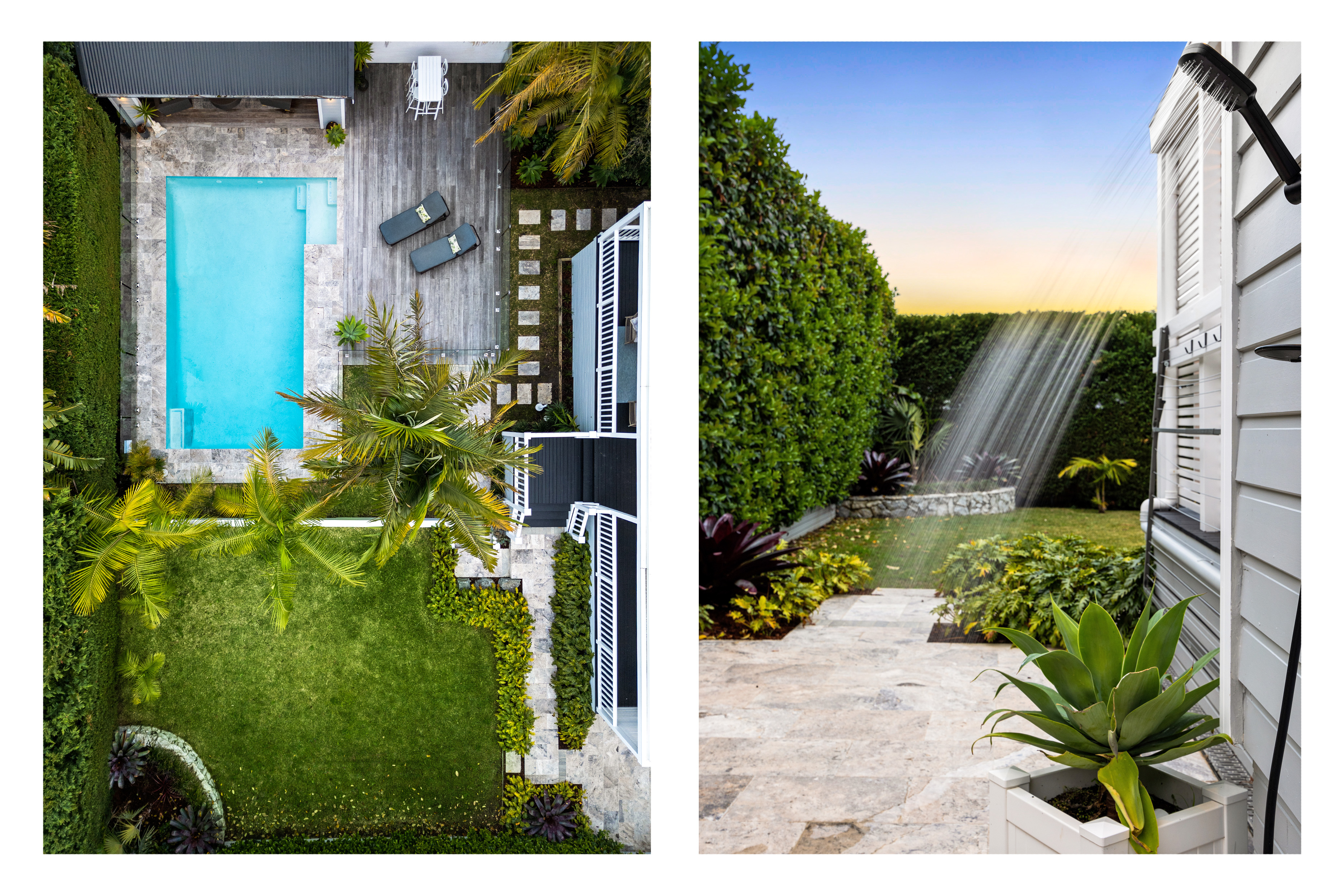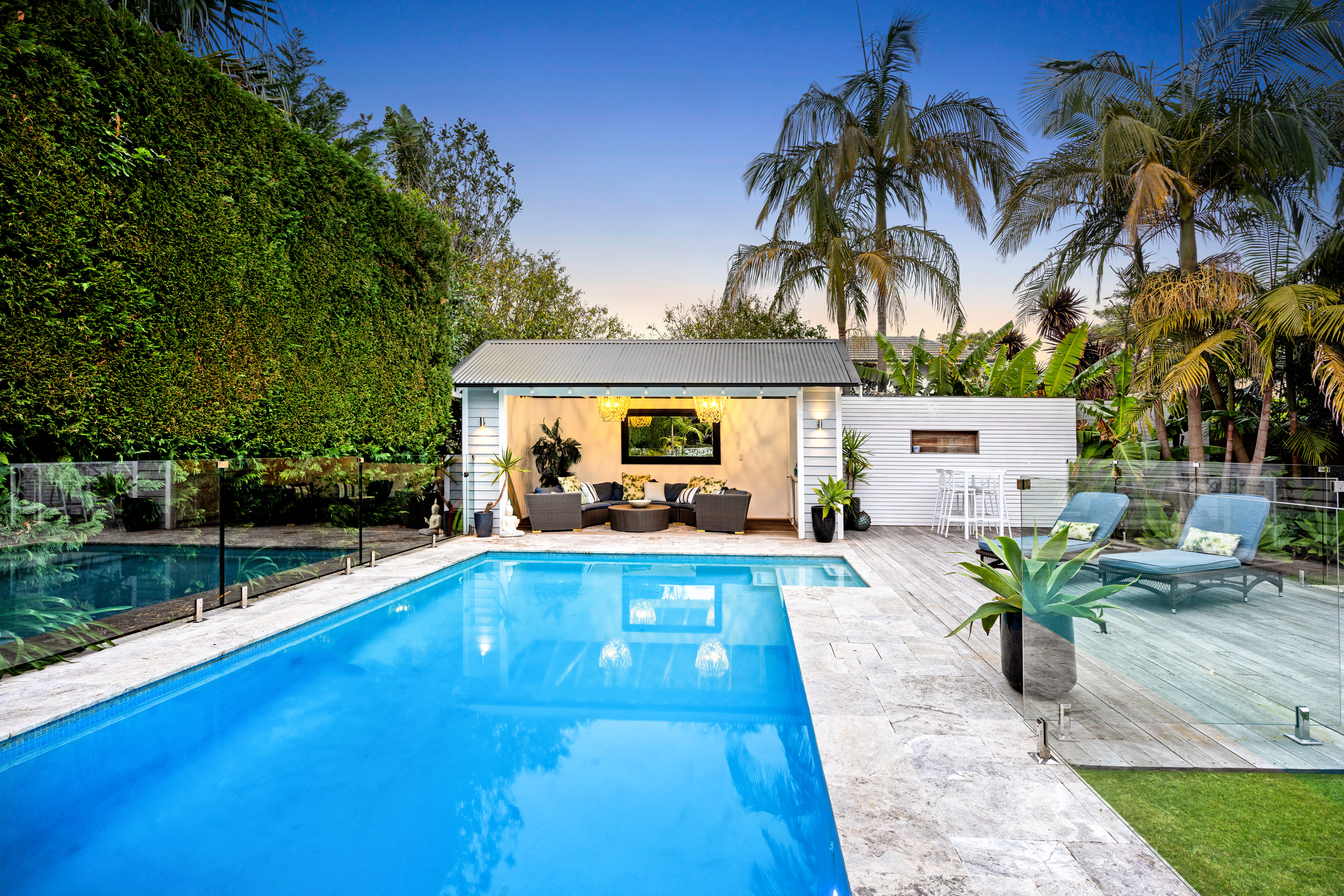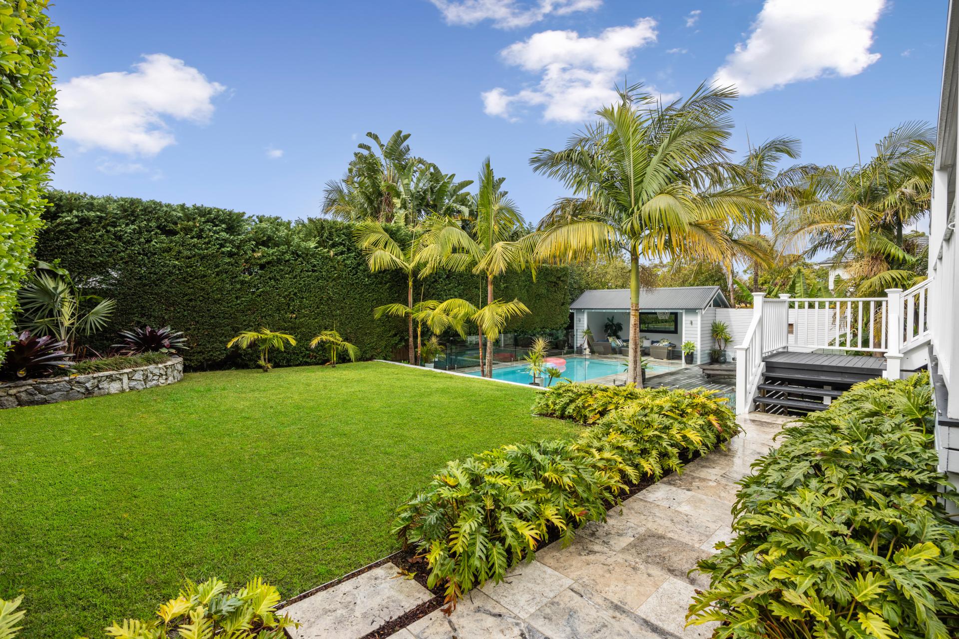 • Private leaf-screened rear lawn and pool with Travertine surround and sundeck