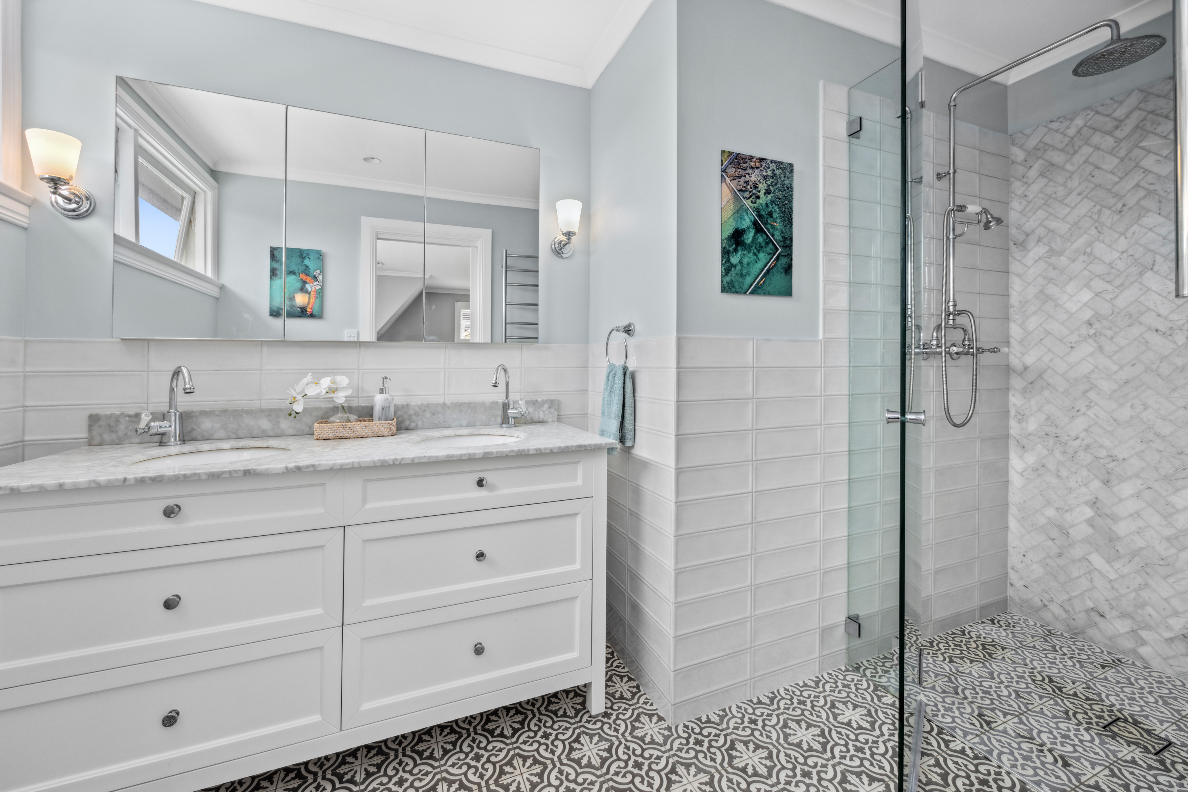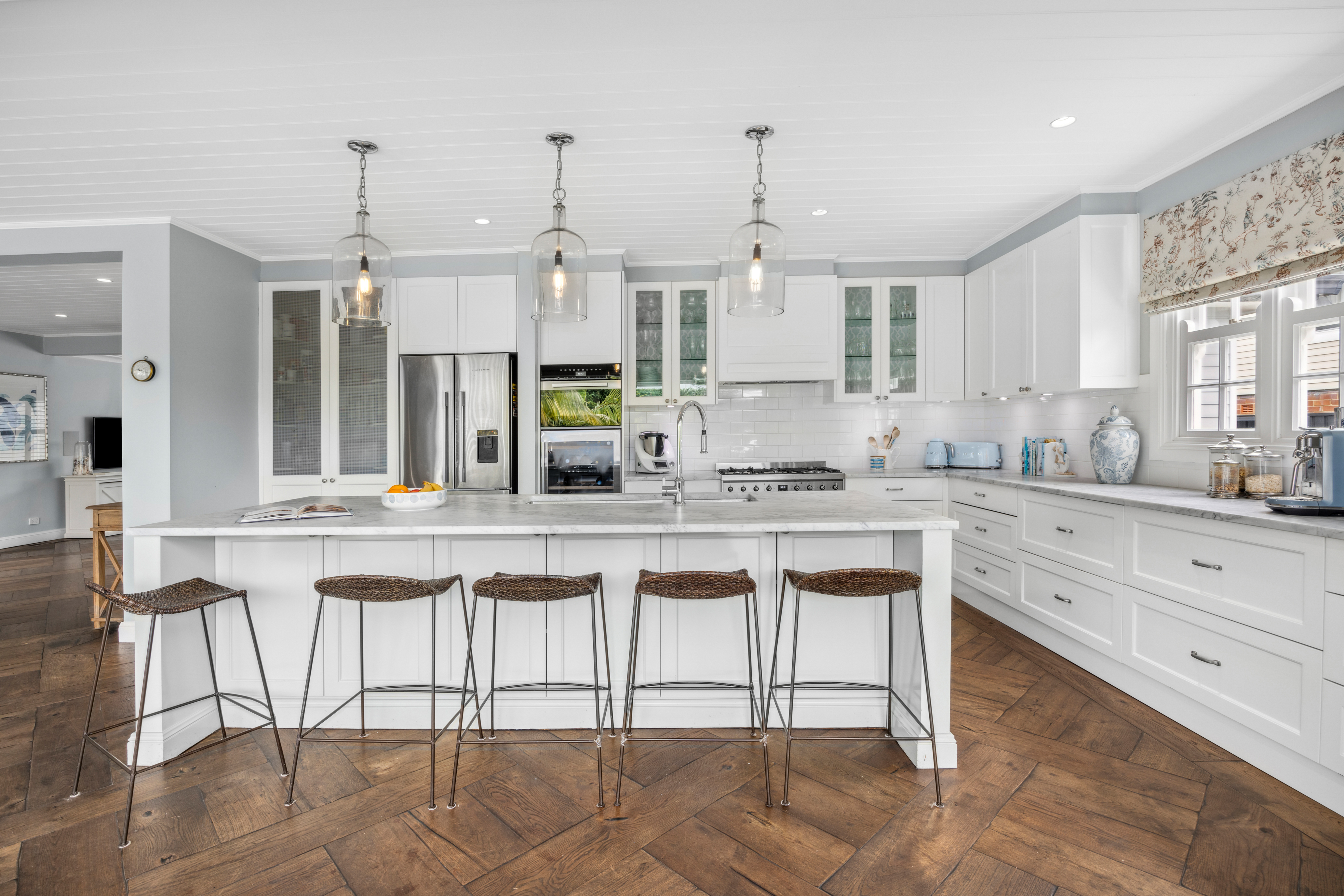 • Carrara marble island kitchen, gas stove, steam oven, dishwasher and wine fridge