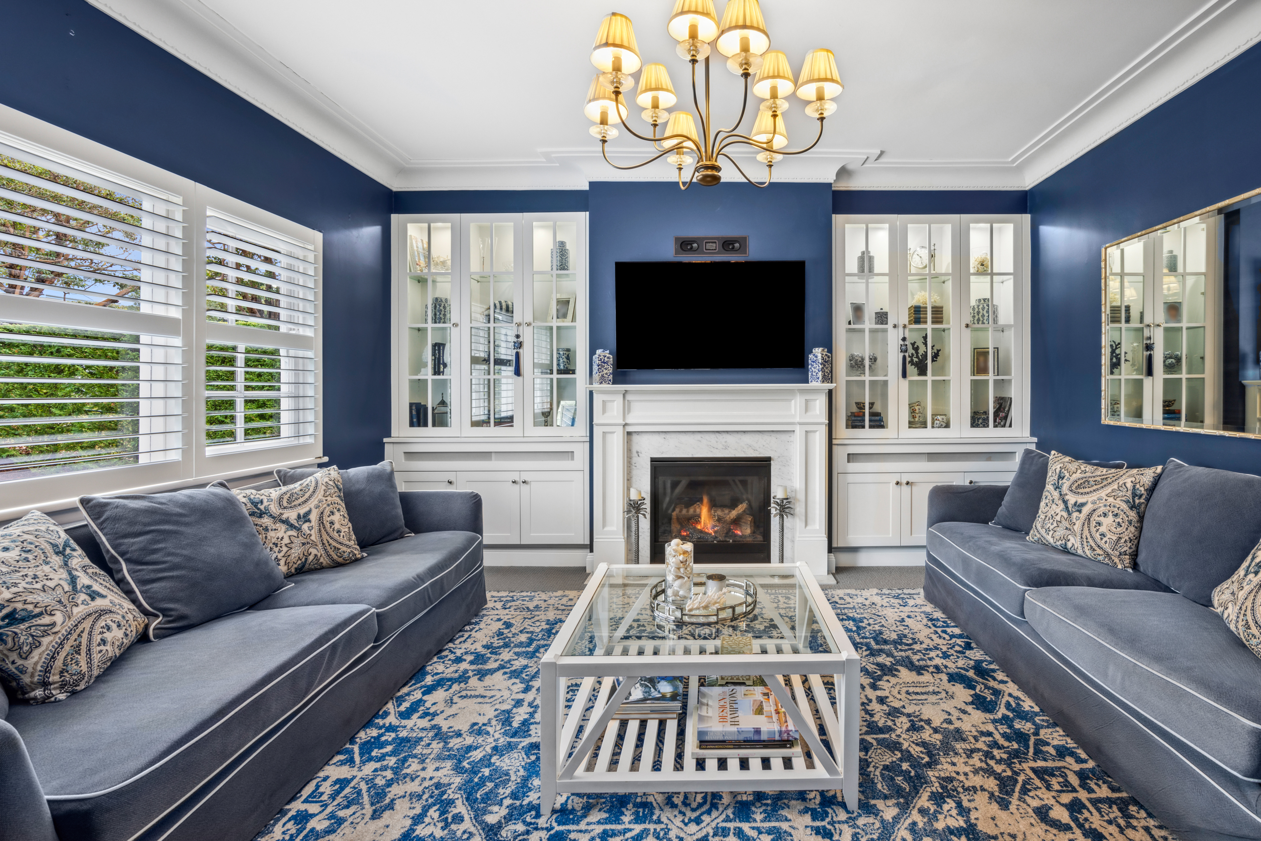 • Lounge/media room with a cosy gas log fireplace and glass-fronted display cabinetry