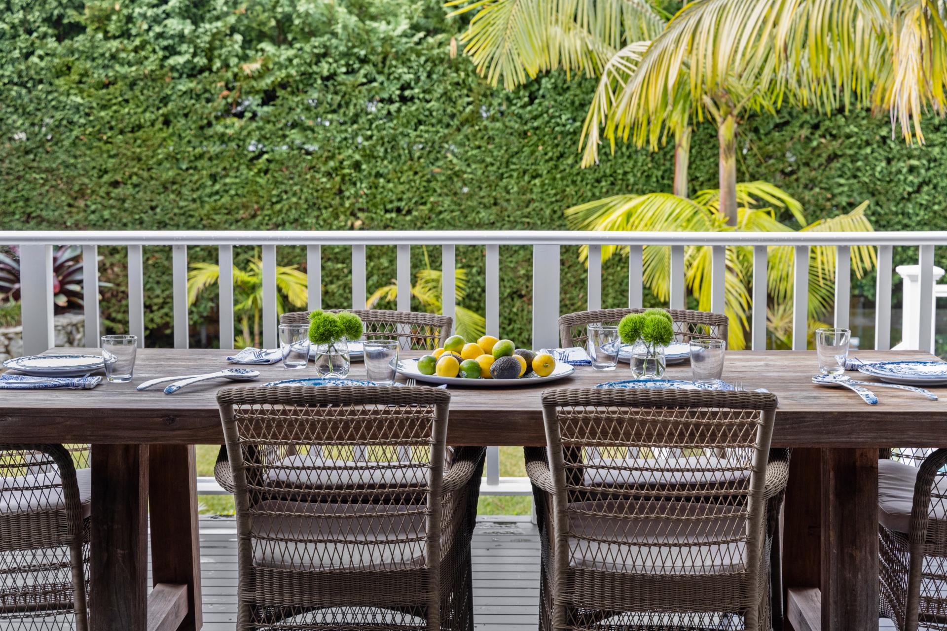 • Sunny Travertine paved north courtyard with a hot/cold outdoor shower