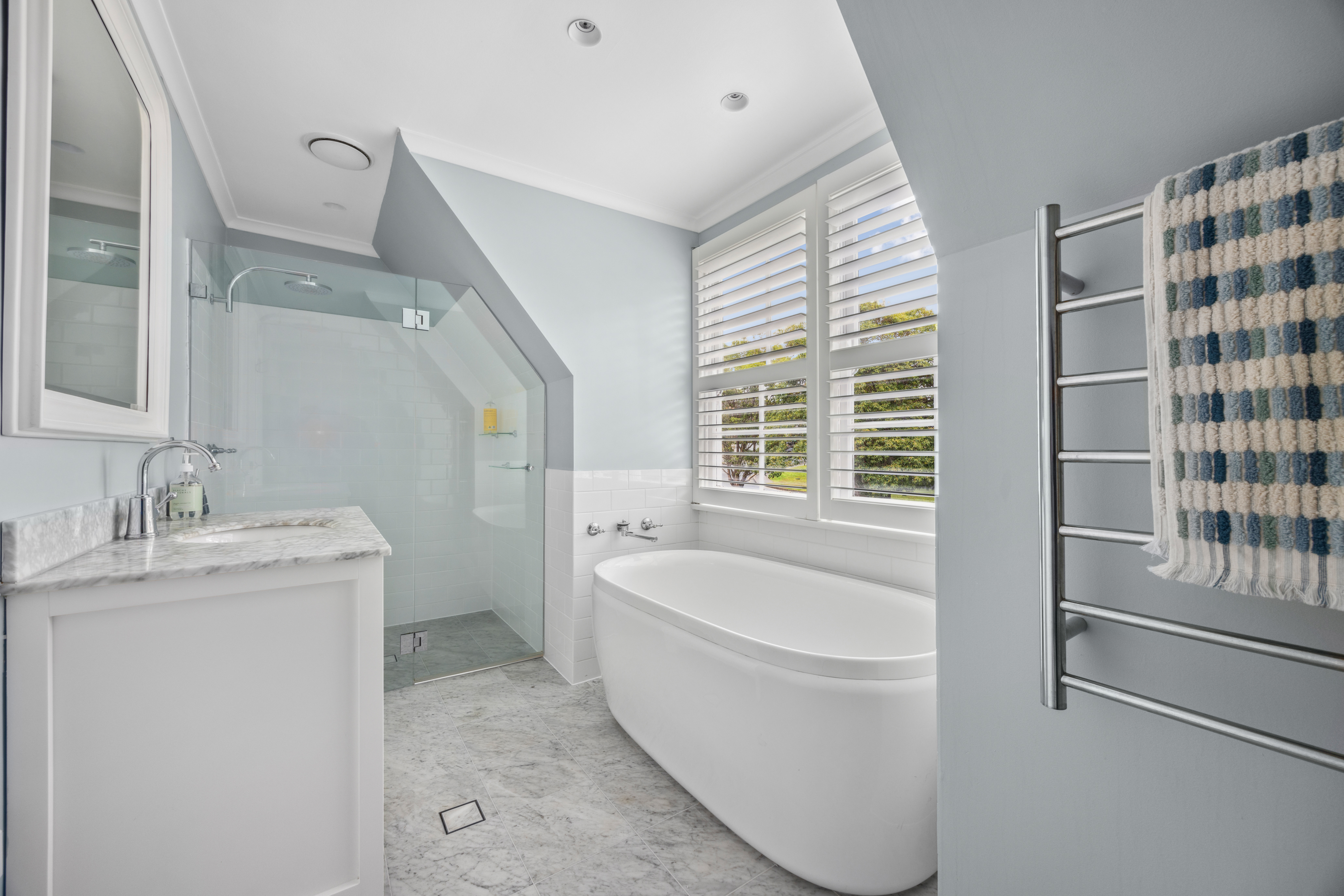• Home office with fitted desk and library, ultra-chic Carrara marble bathrooms