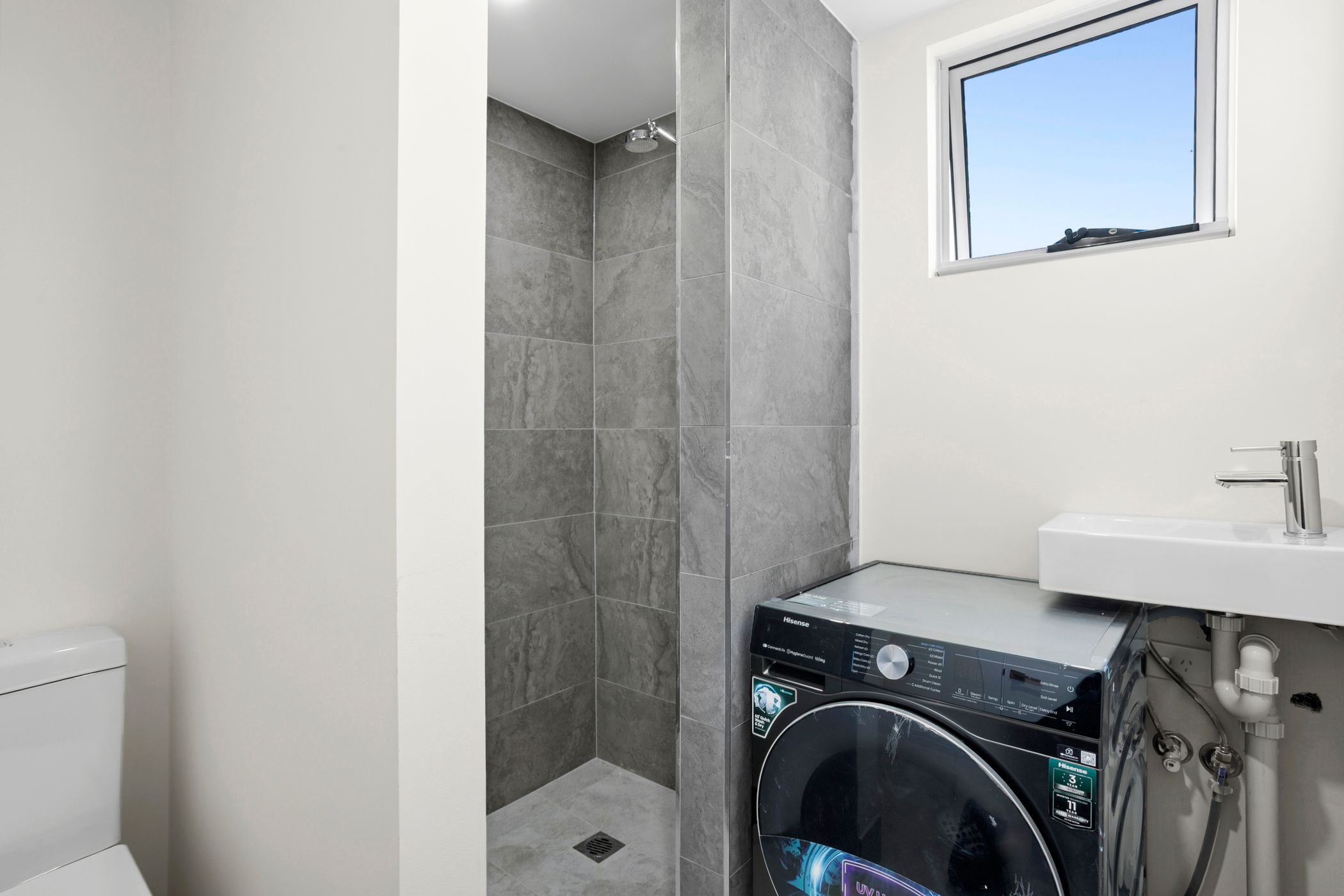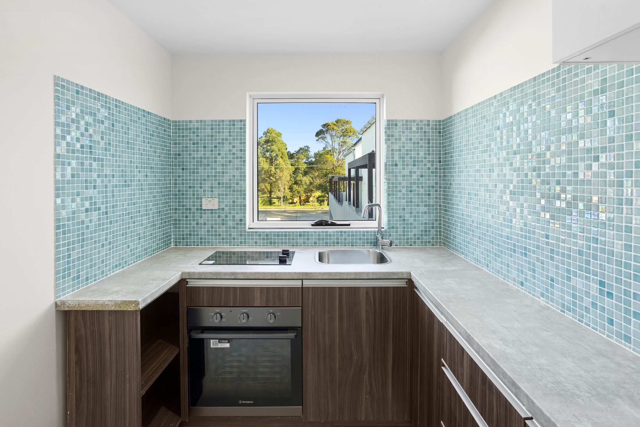 The sleek kitchen includes high-quality appliances such as an induction cooktop and oven, while the large bathroom is designed for comfort and includes an internal laundry for added convenience.