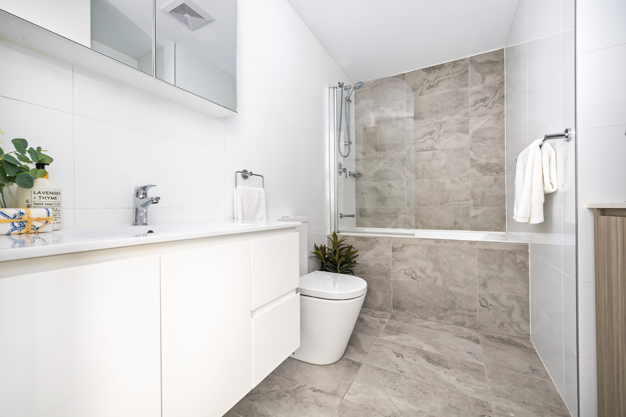 – Chic bathrooms with travertine-look tiled flooring and feature walls