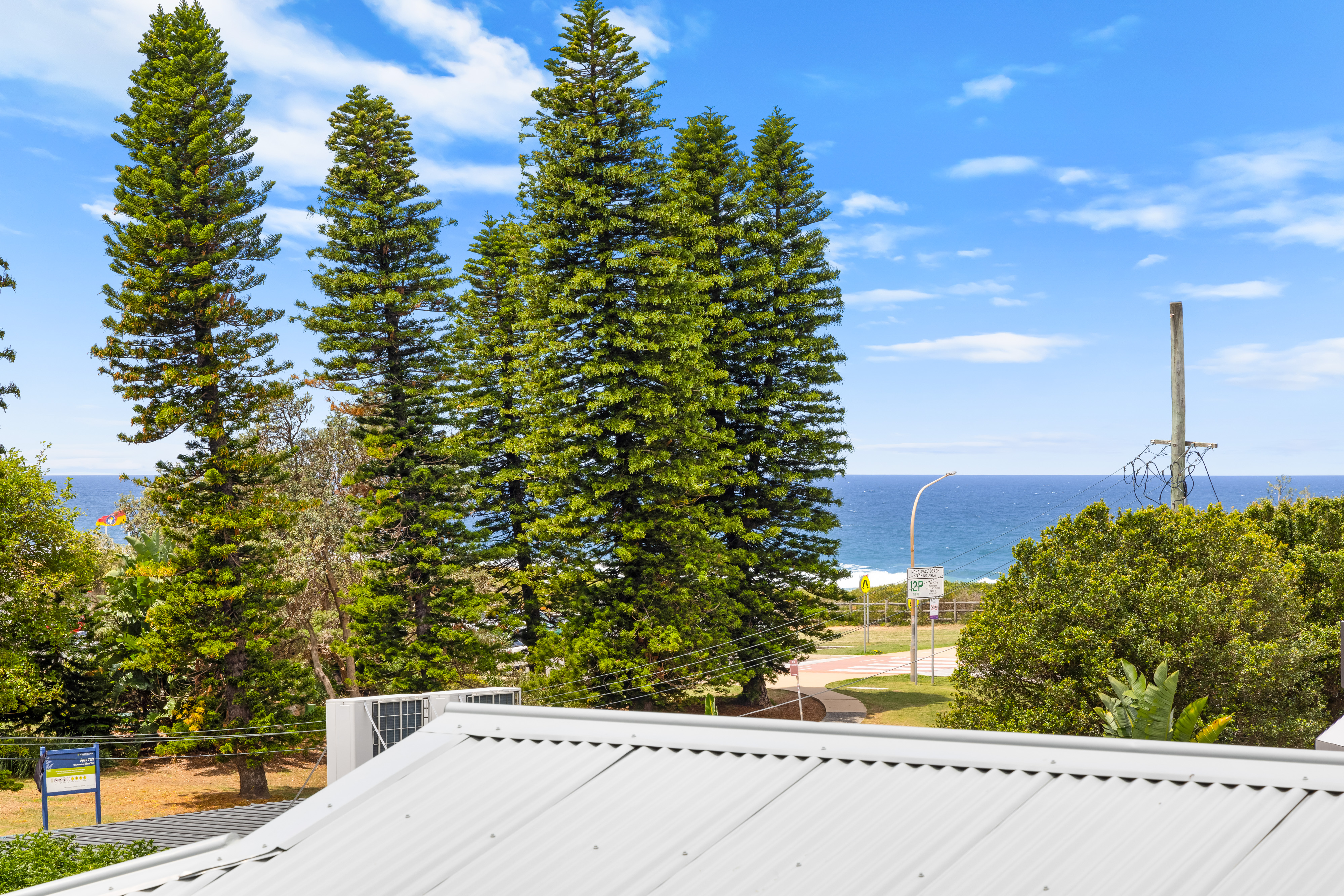 – Views over the iconic Norfolk Pines to the beach and ocean