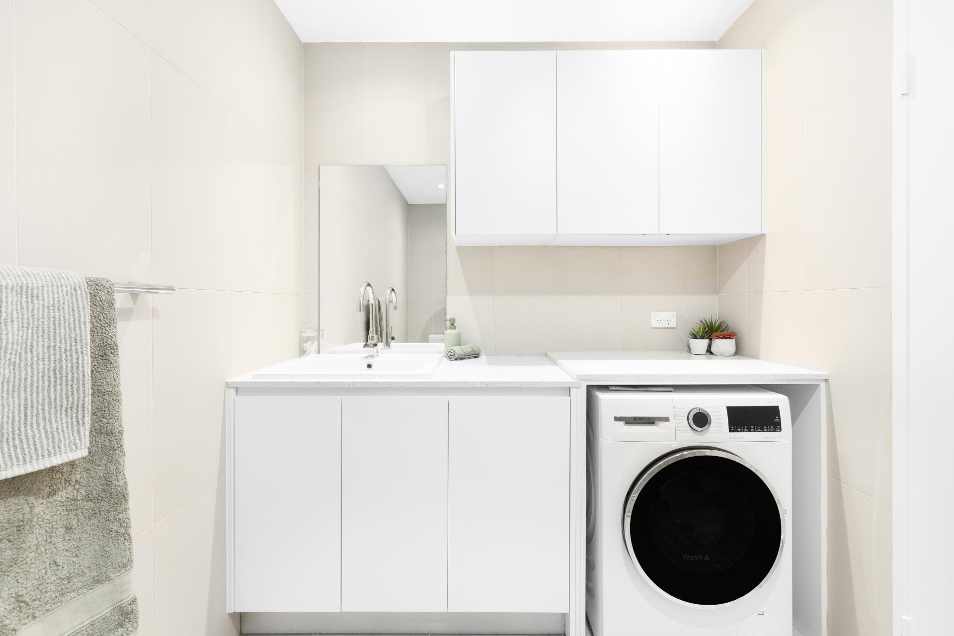 -Spotless bathroom combined with laundry, fully tiled for low-maintenance living