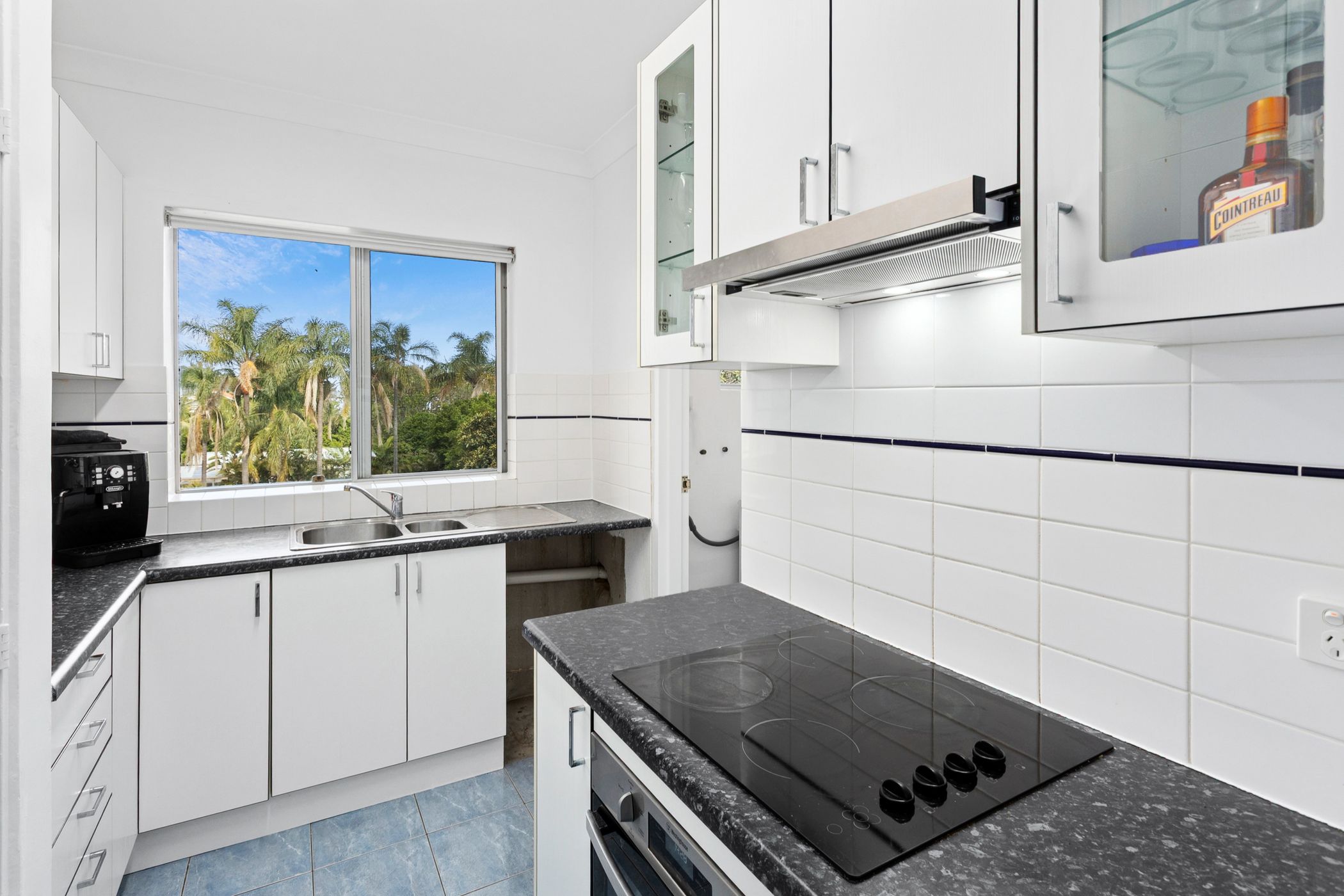 – Modern kitchen with electric cooktop, ample cabinetry and leafy outlook