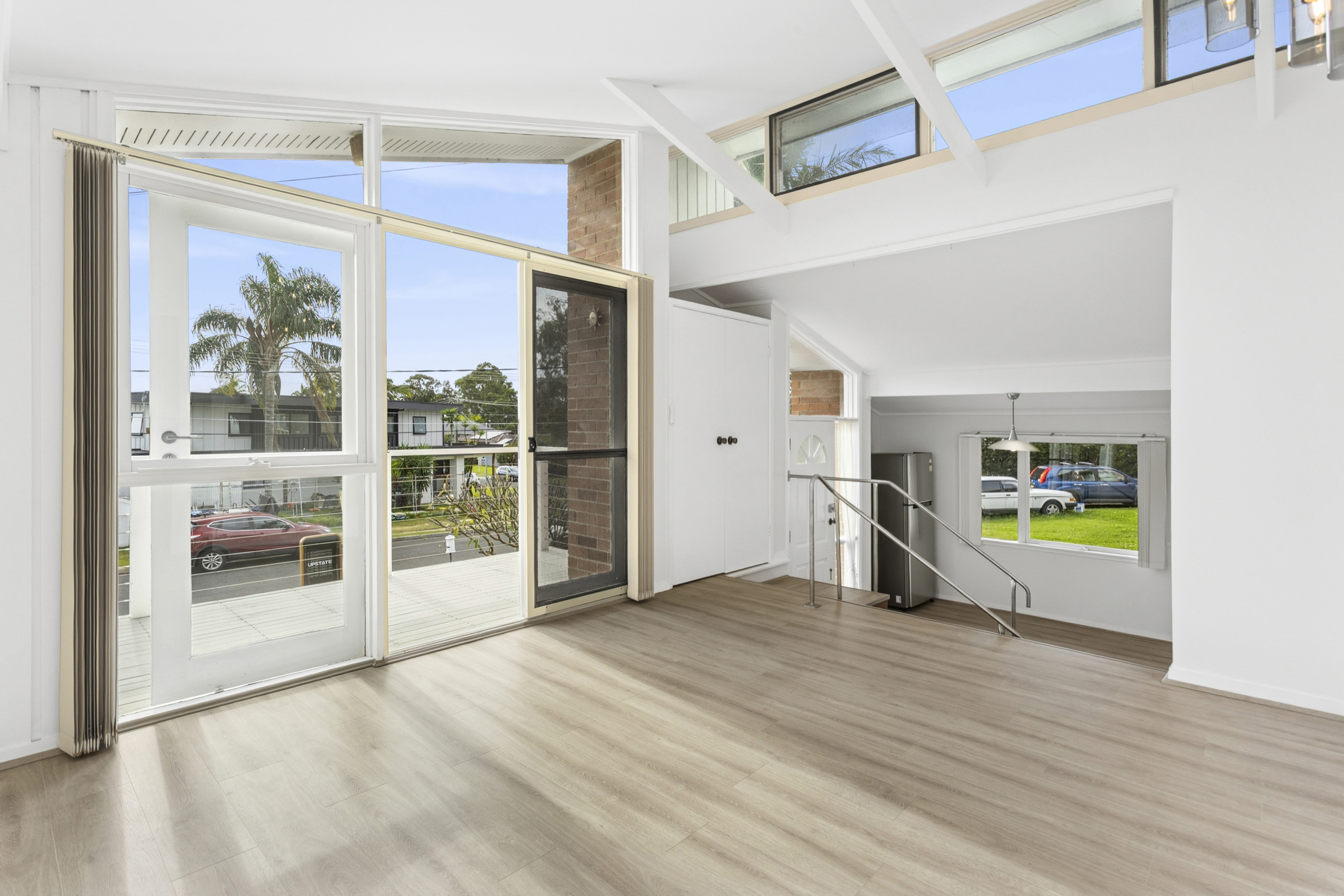 – Bright open plan living with soaring raked ceilings and timber floorboards