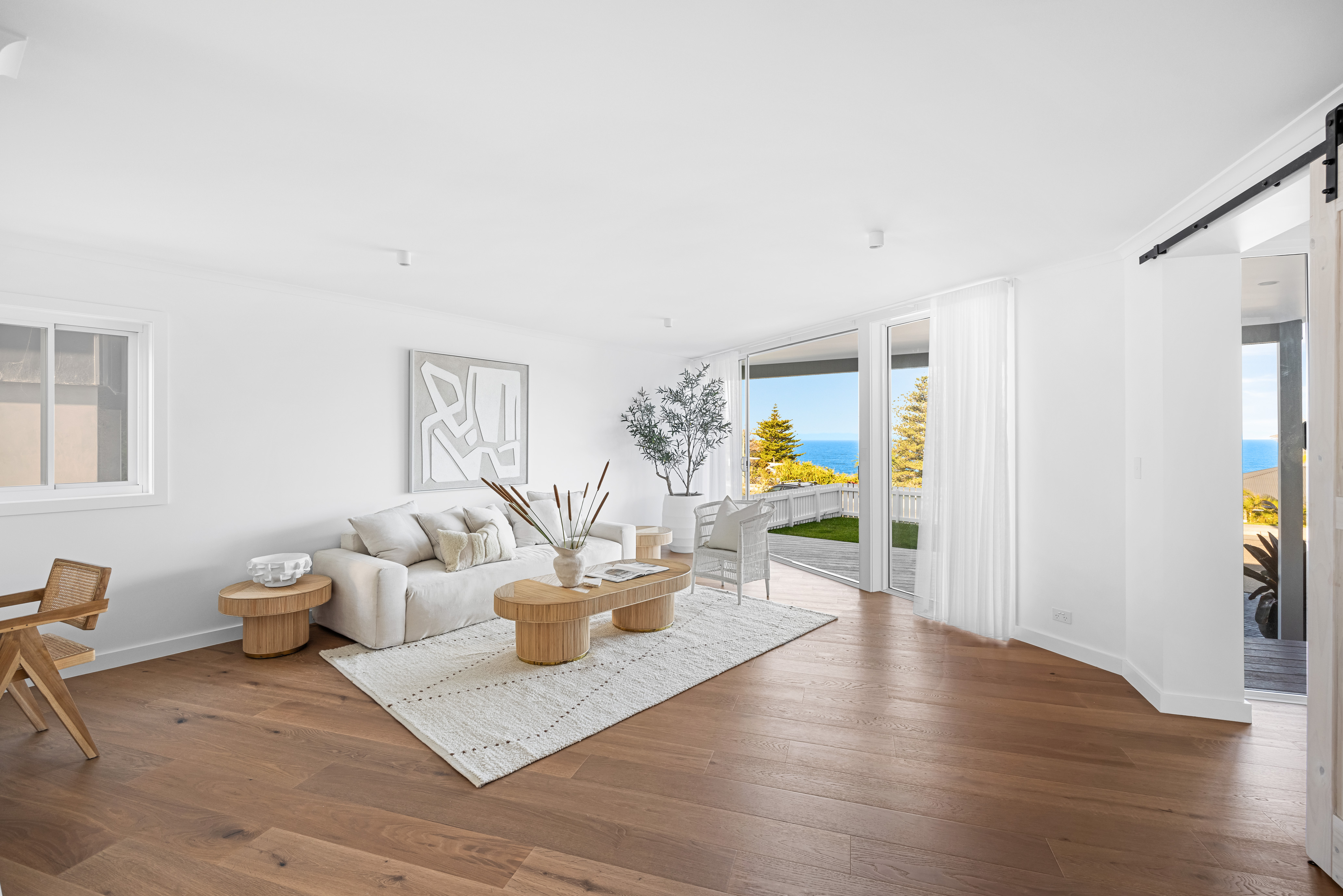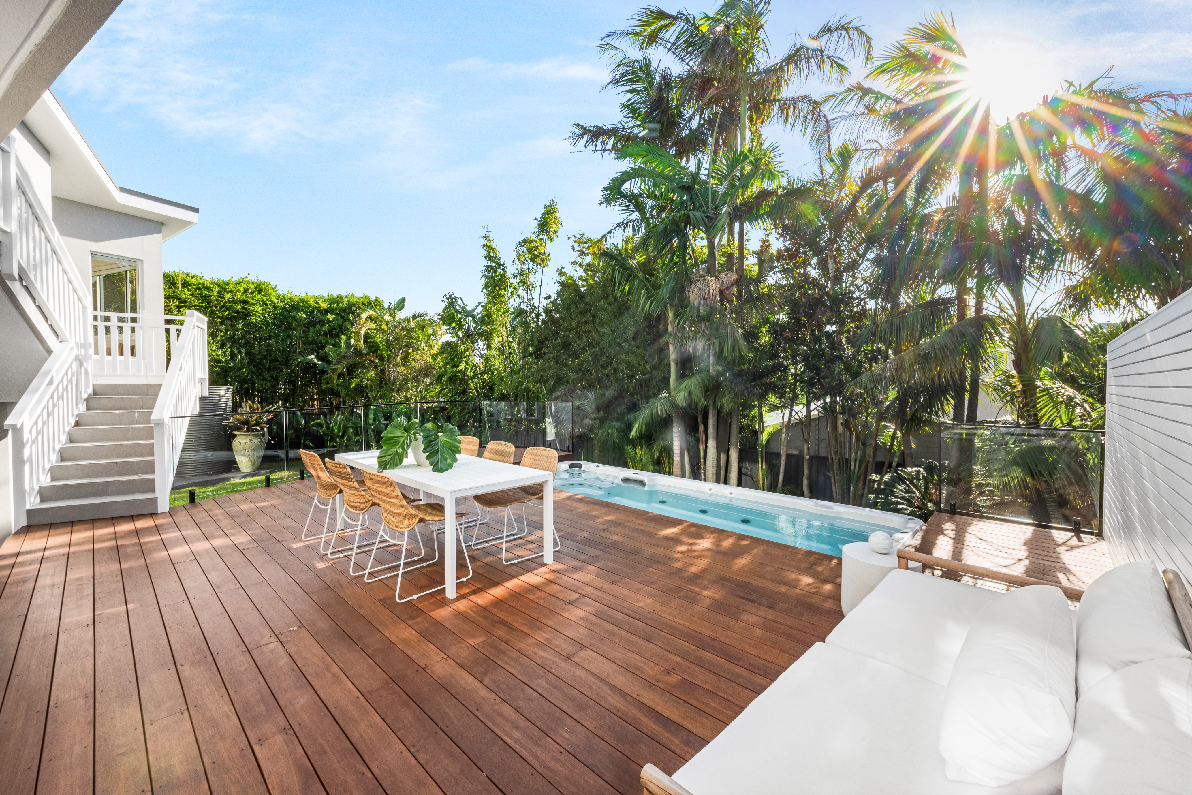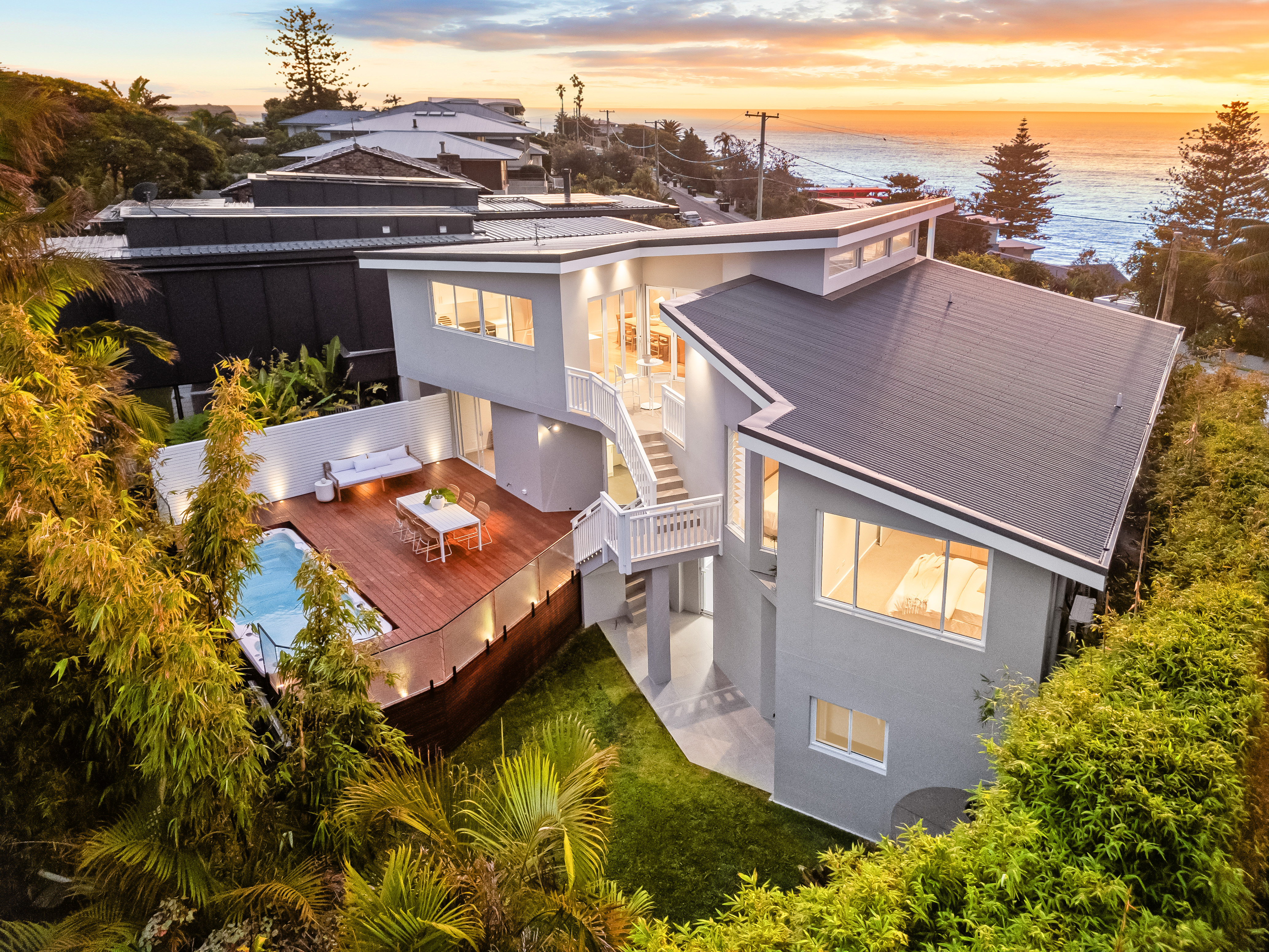 This fully renovated residence offers the ultimate contemporary beach lifestyle with high-end finishes and expansive, light-filled interiors. Featuring a spacious four-car garage with an EV charging point and room for projects, this home is built for convenience and luxury. The open-plan living and dining areas flow seamlessly to the entertainer’s kitchen, which includes white pearl stone benchtops, an island breakfast bar, stainless steel appliances, and views of the ocean and spa/yard. Alfresco terraces on the upper level offer year-round outdoor living, while the backyard boasts an oversize Vortex 5-metre swim-spa, a separate infrared sauna, and a large terrace for relaxation. The Balinese-inspired landscaped grounds with level lawn provide a tranquil retreat.