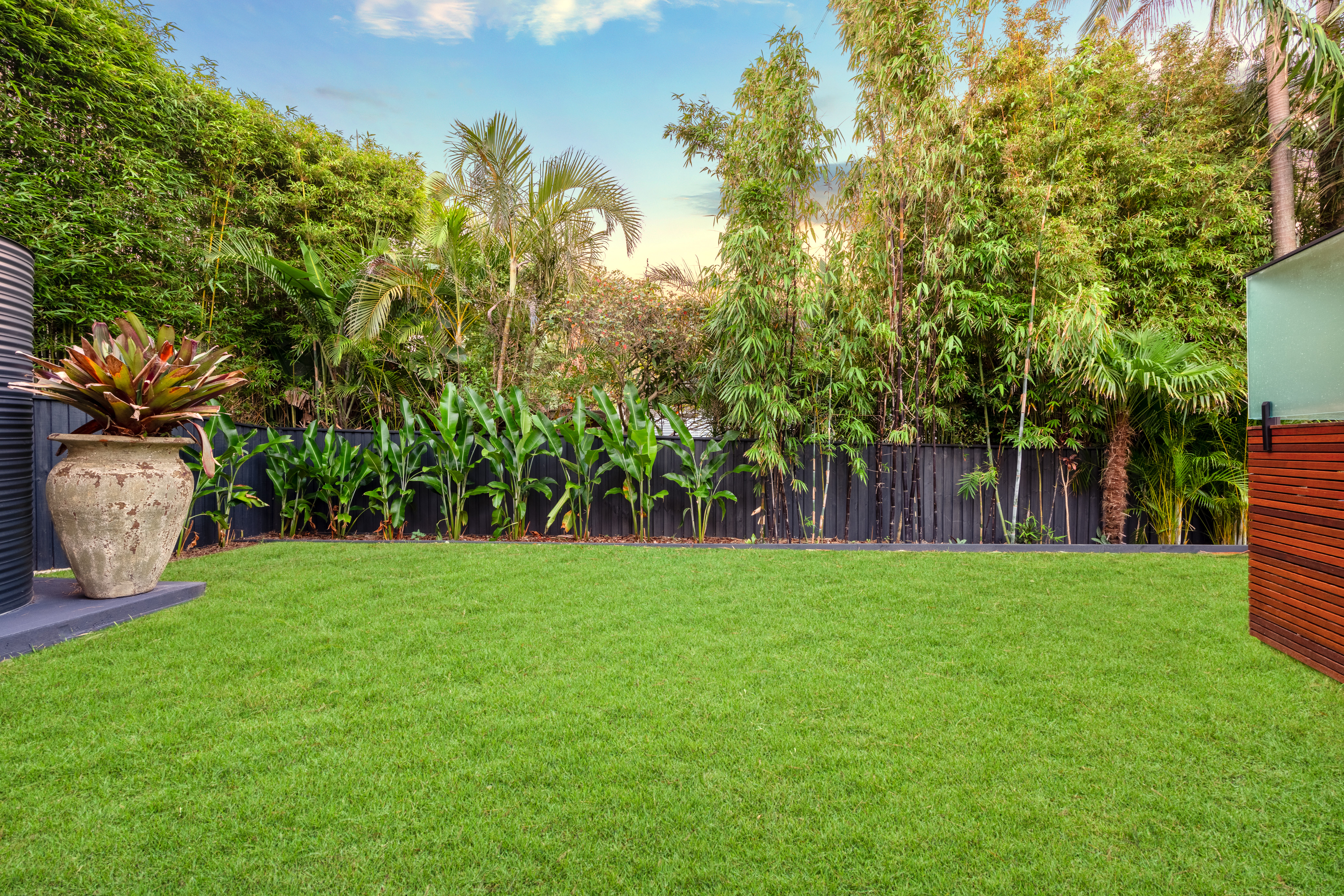 – Balinese-inspired landscaping with level lawn