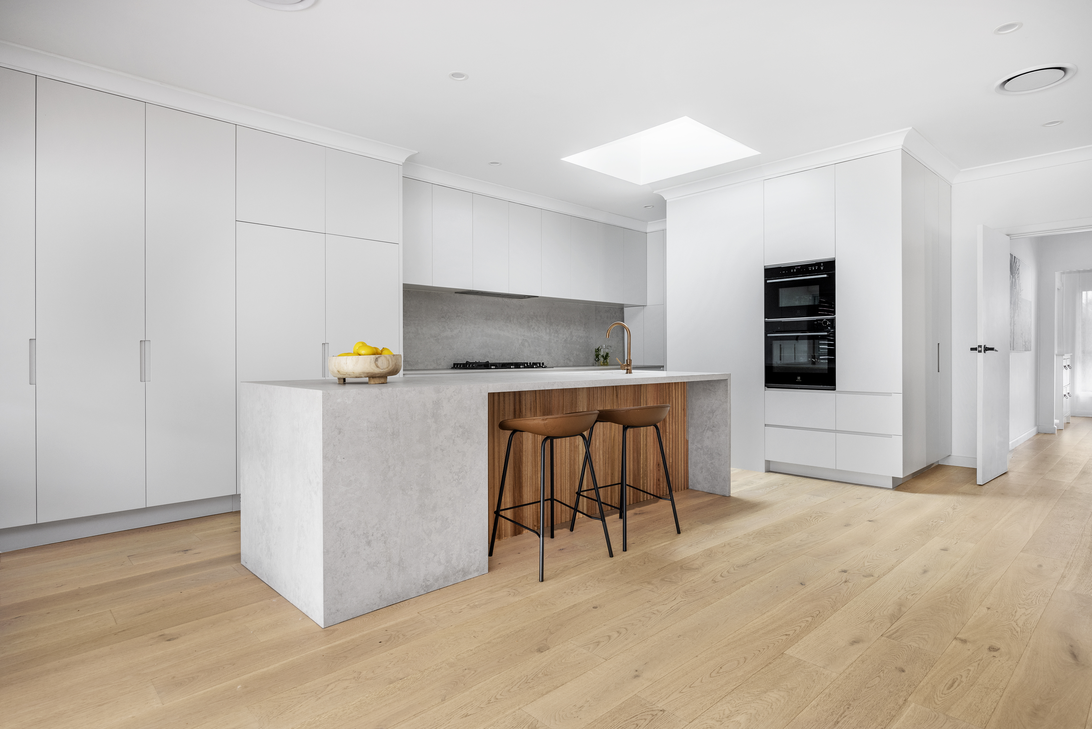 – Heart of the home is an ultra-modern Caesar stone gas kitchen featuring fully integrated European appliances, soft-close cupboards, walk-in pantry and a breakfast bar with space to dine on for four
