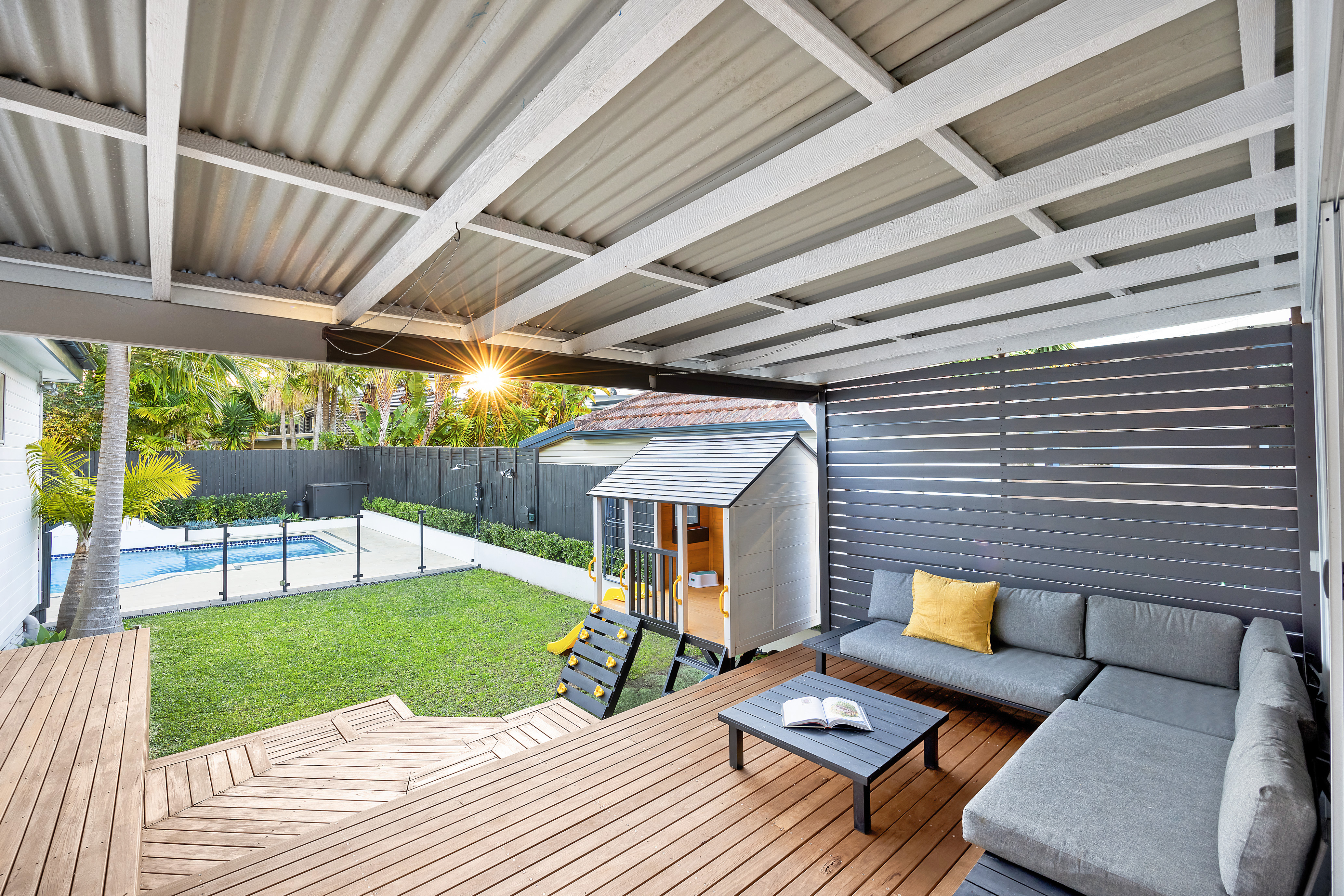 – Easy-care level lawn, all-weather alfresco entertaining deck, 9m long pool