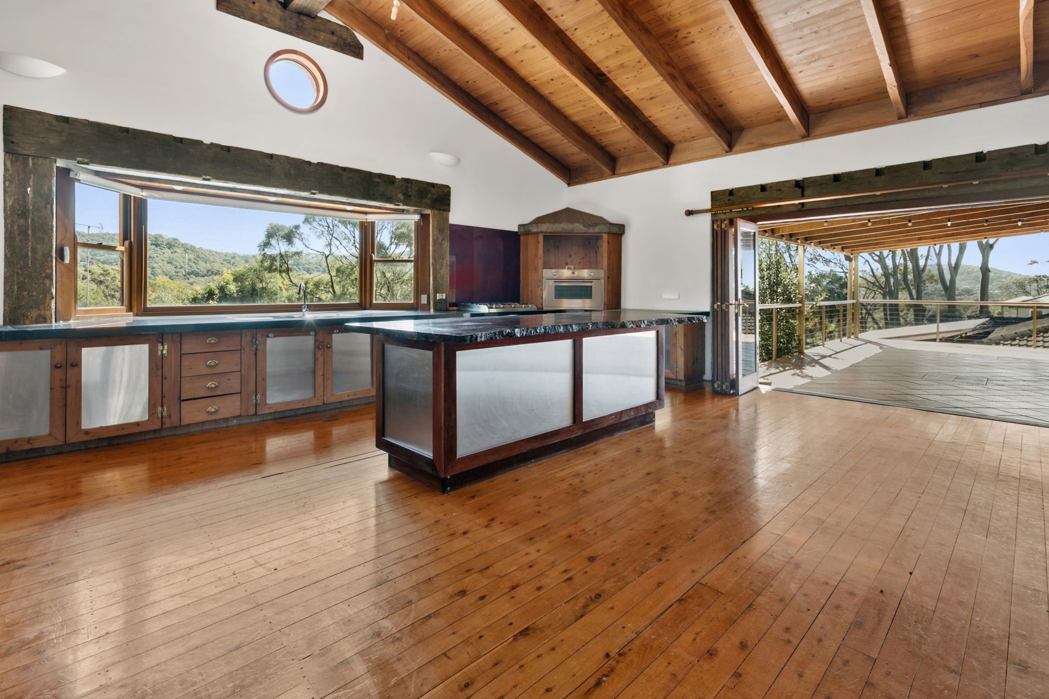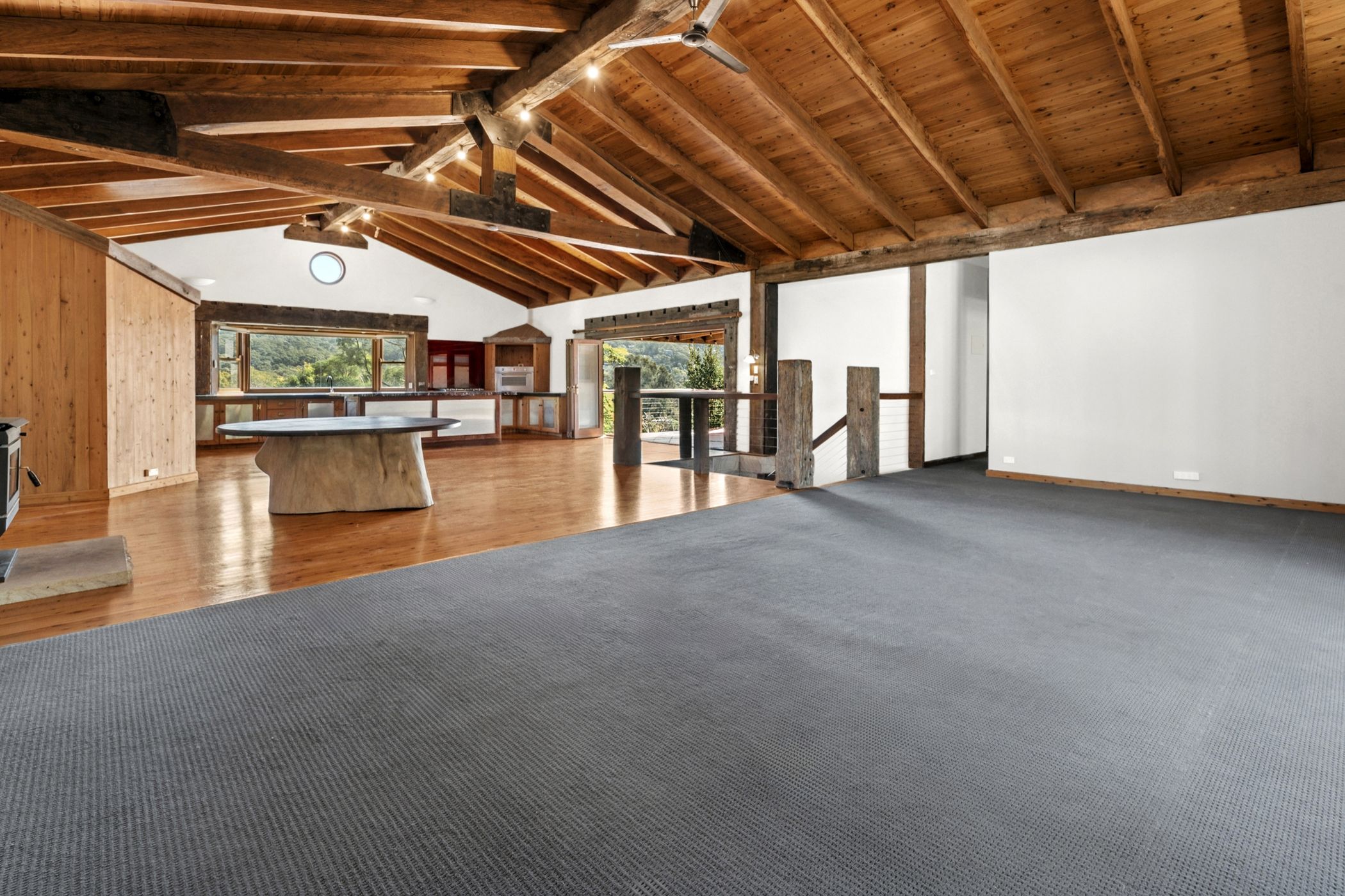 – Upper-level features a huge open-plan kitchen, dining, and living area with exposed beams and bifold windows opening to a northeast-facing covered terrace