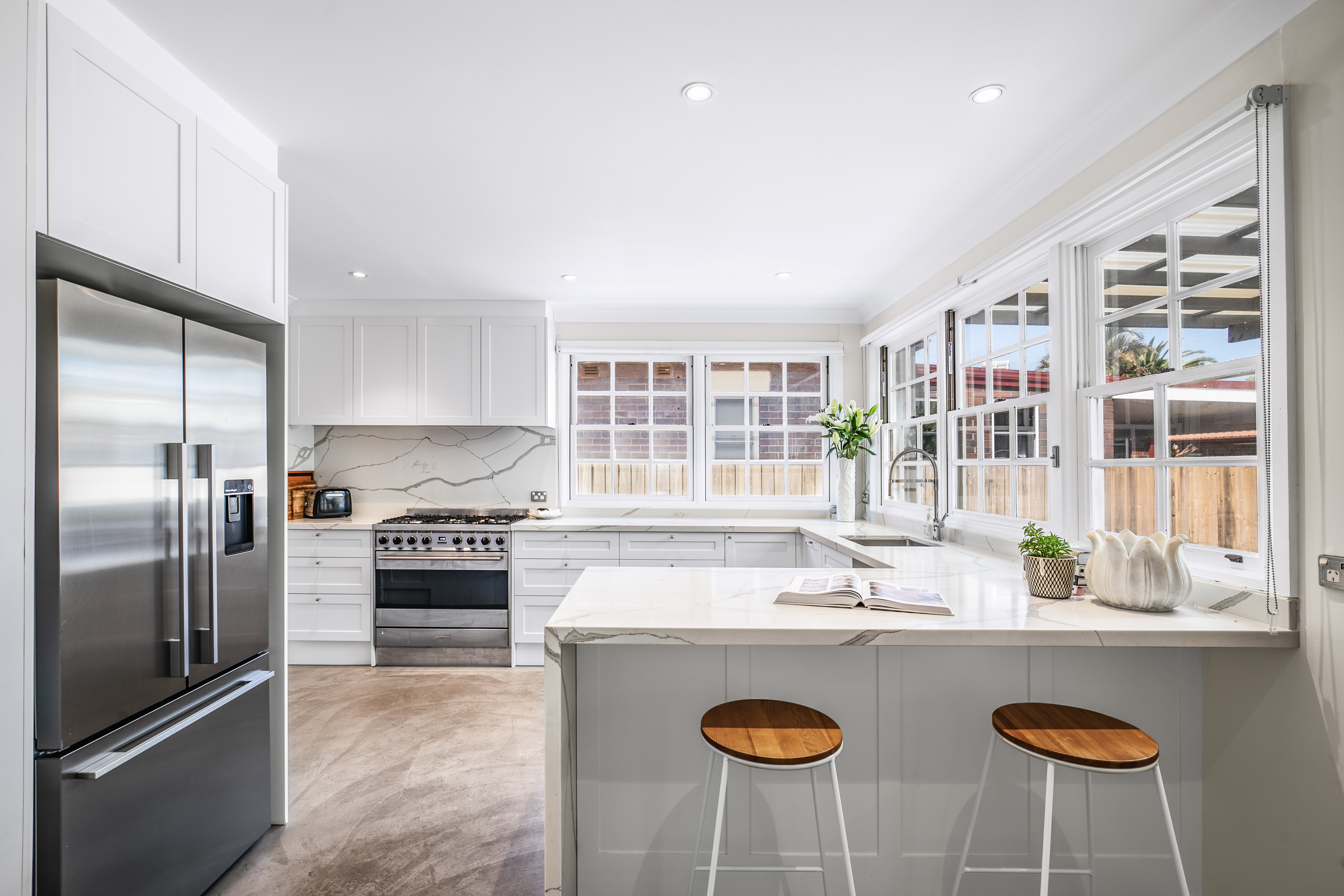 – Smeg gas cooktop and oven, plumbed in fridge, stainless Miele dishwasher