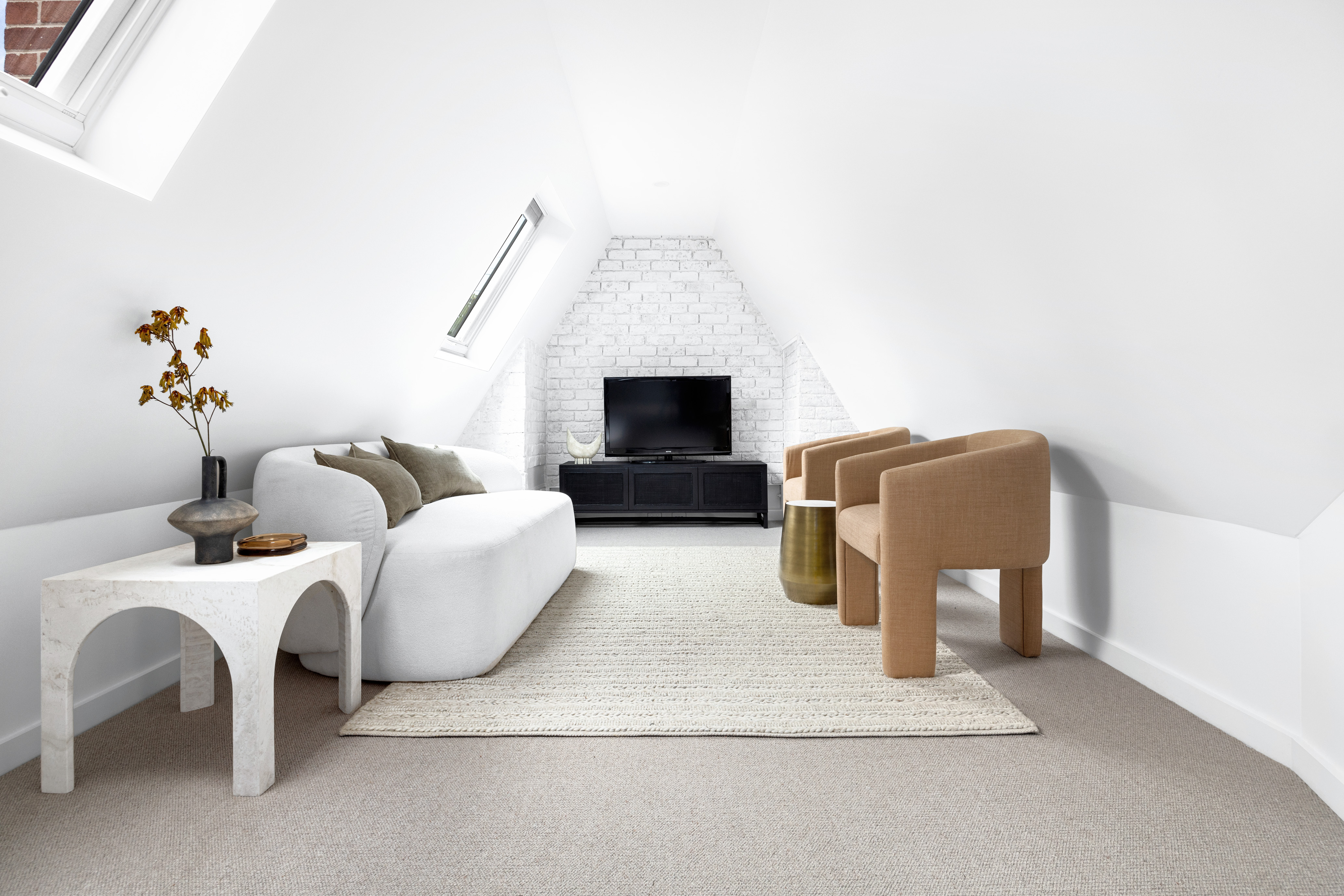 – Upstairs living area with an exposed brick wall, adding warmth and texture