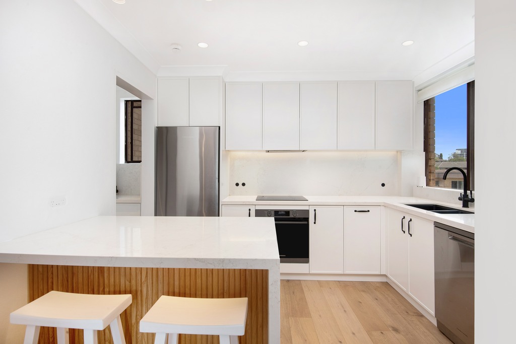 – Contemporary kitchen with stone benchtops and ample prep/storage space