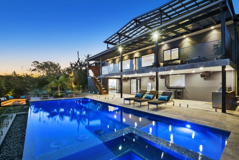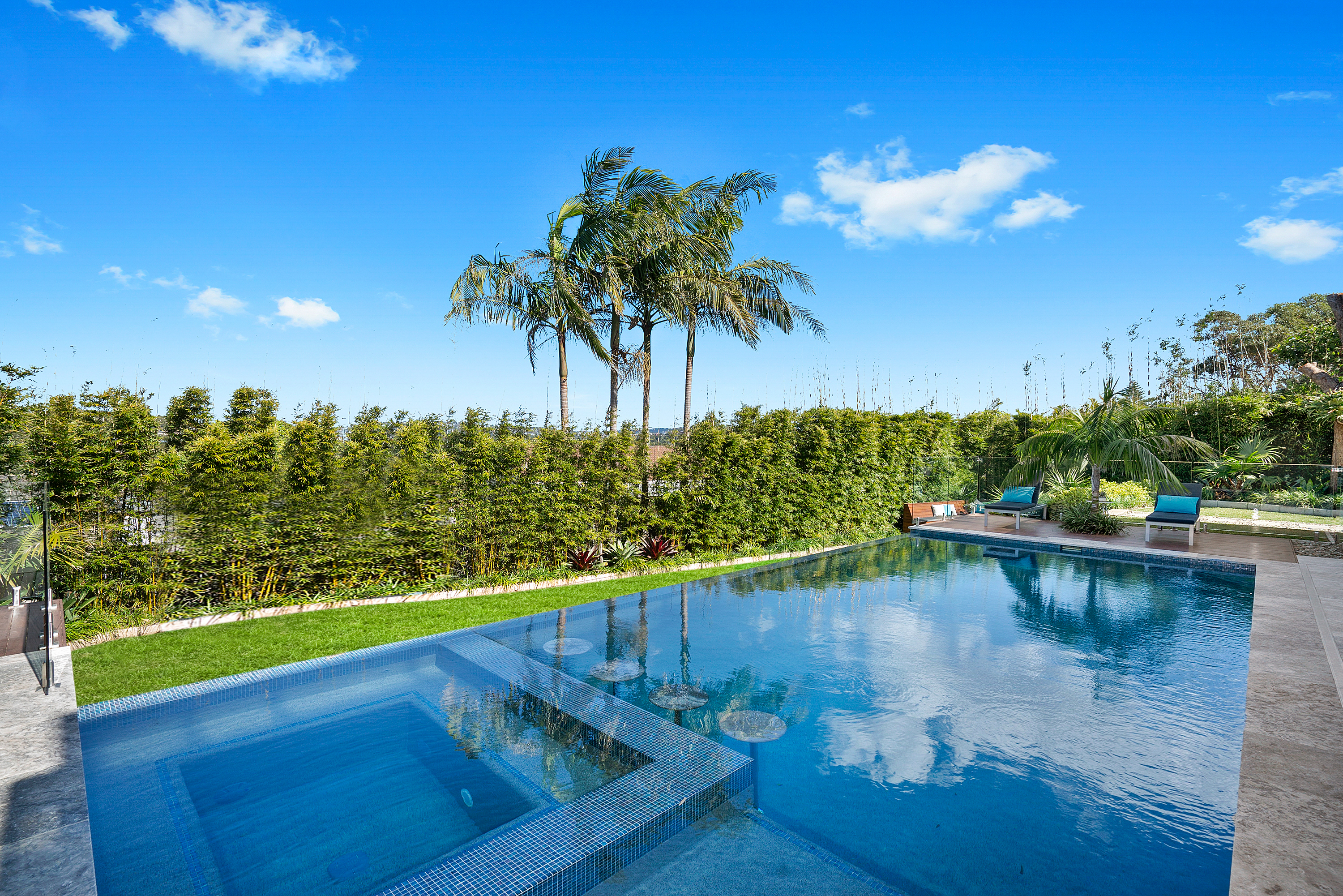 Designed to replicate the verve and vibe of a 5-star tropical island resort, this grand-scale architectural triumph has left nothing undone in pursuit of providing the ultimate in relaxed luxury, family functionality and spectacular indoor/outdoor entertaining. Embraced by giant glass walls that capture panoramic 180 degree views across the district and parkland, it features extensive living spaces flowing seamlessly to extensive entertainers’ terraces on all three levels, superb appointments plus bespoke crafting and design features throughout. Placed on approx 900 sqm of exquisitely landscaped tropical gardens with customised entertaining areas and a heated pool with spa, its amazing family lifestyle setting is within 100m of Warriewood Beach, seaside eateries and North Narrabeen Reserve.