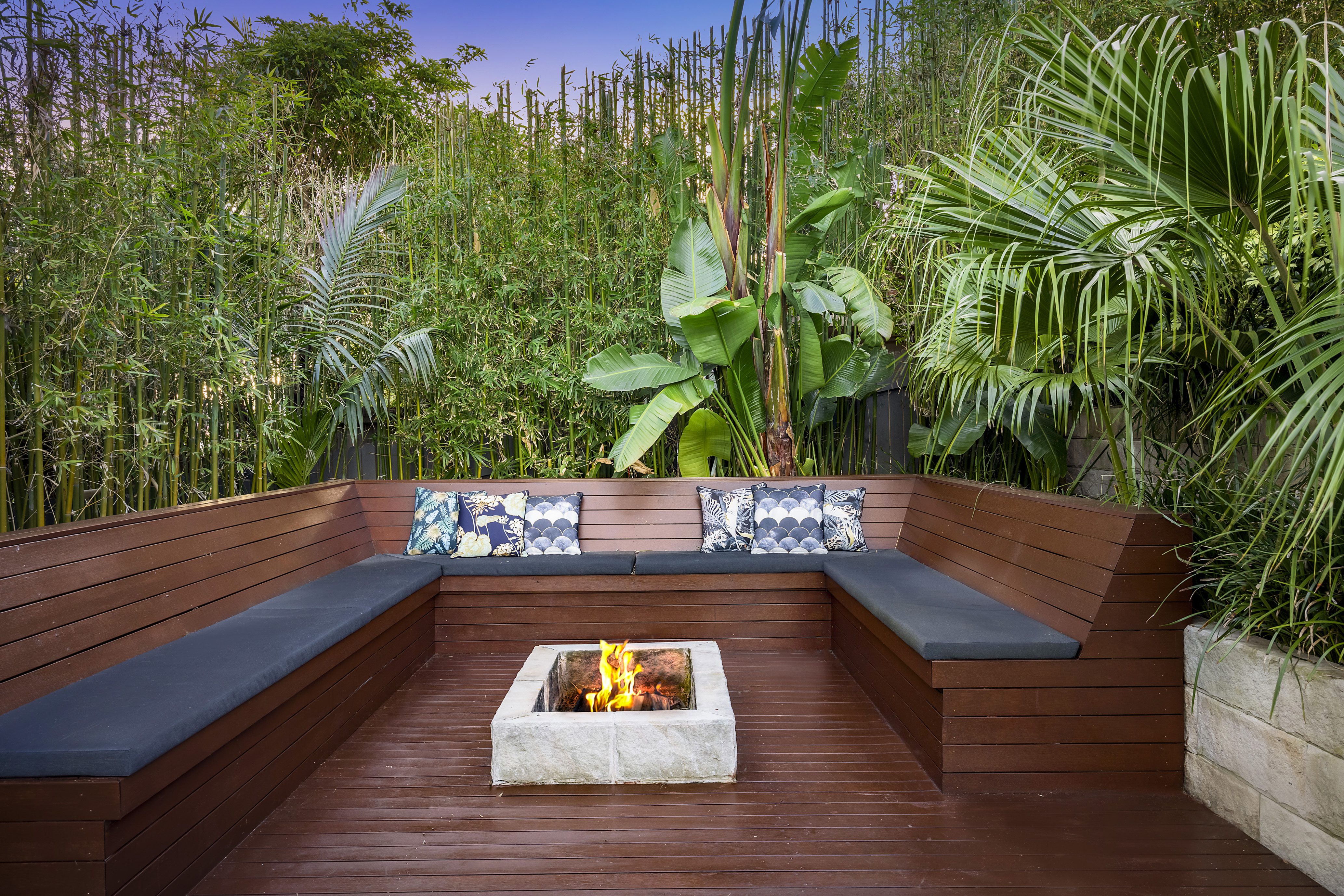 – Near level lawn area at rear plus timber seating around a sandstone fire-pit