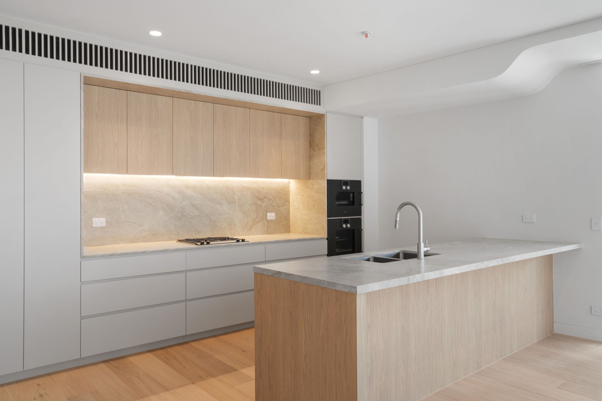 The heart of the home is the striking stone kitchen, showcased by a sculptural island bench and seamlessly integrated Gaggenau appliances-perfectly positioned for both everyday living and entertaining. Flowing effortlessly into the expansive open-plan living and dining areas, full-height glazing and high ceilings enhance the sense of space while capturing the relaxed coastal atmosphere reflected throughout the interiors.