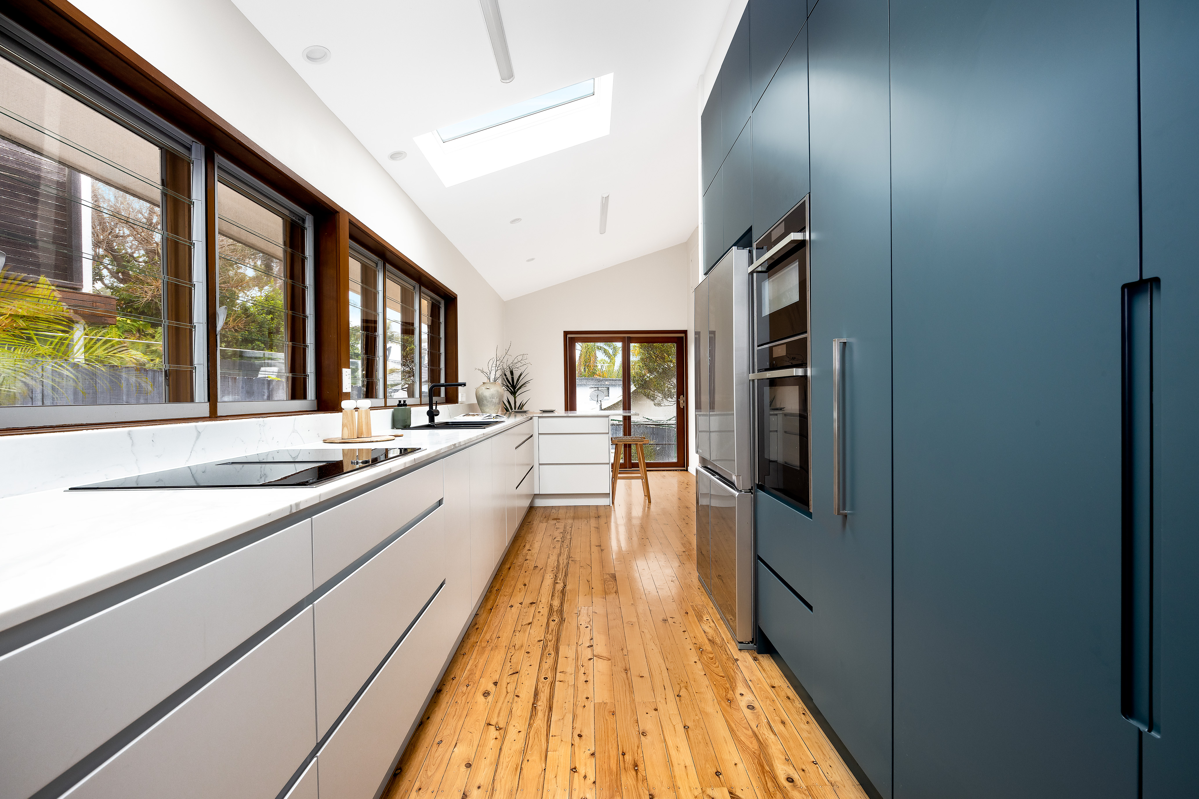 • Neff induction cooktop, steam/microwave combi ovens, integrated Miele dishwasher