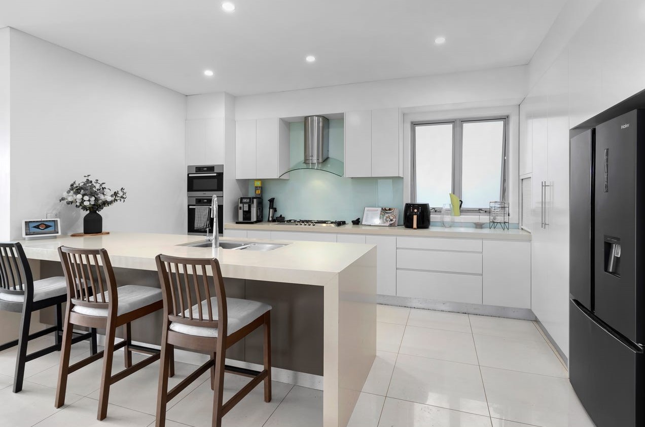 The open-plan lounge and dining area, tiled throughout, flows seamlessly through glass doors to a sunlit, north-facing balcony. The gourmet kitchen is a chef’s delight, featuring Miele appliances, five-burner cooktop, integrated microwave and dishwasher, Caesarstone benchtops, breakfast bar, and an oversized pantry with ample storage.