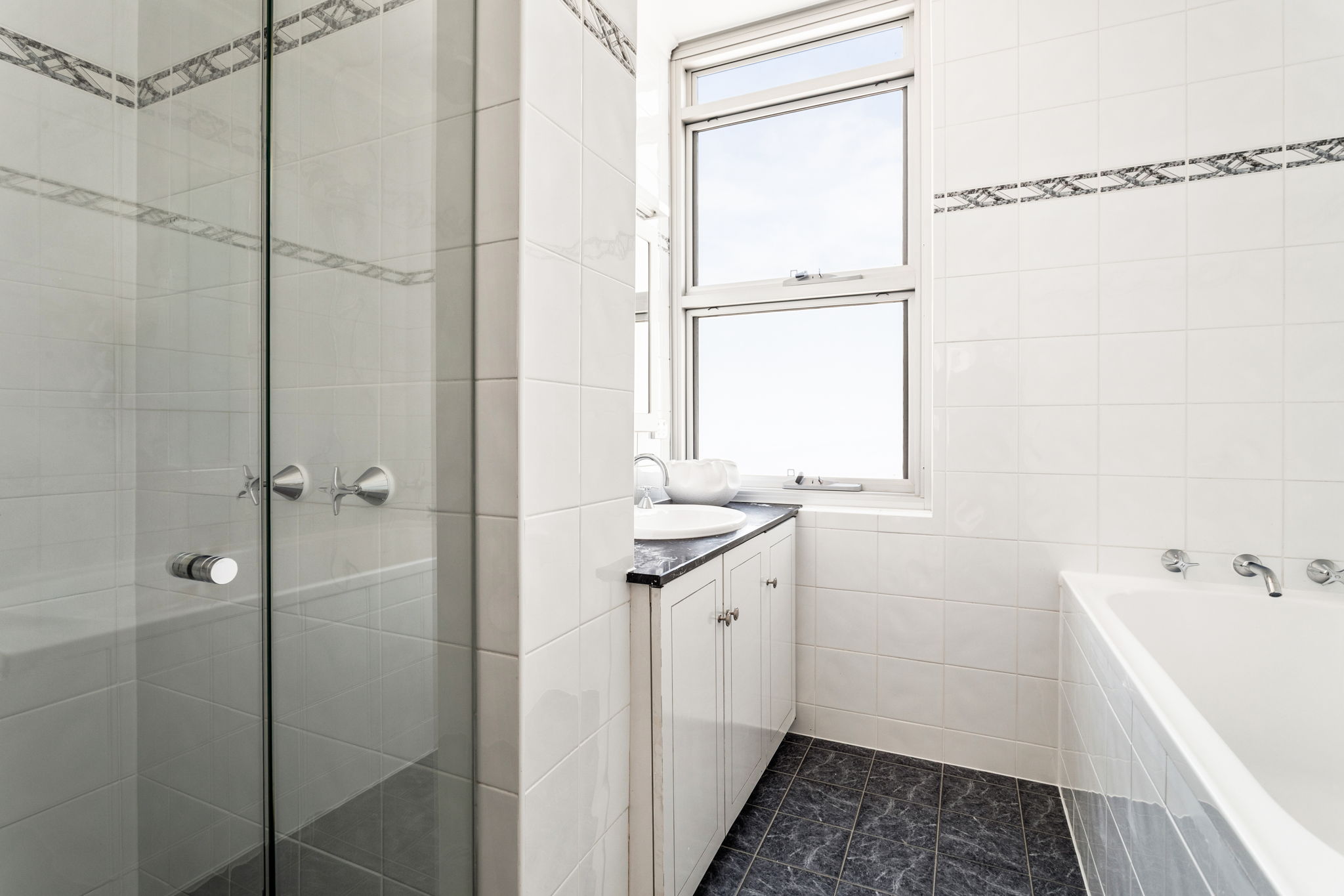 • Neat kitchen filled with sunshine, two bathrooms, main with bathtub