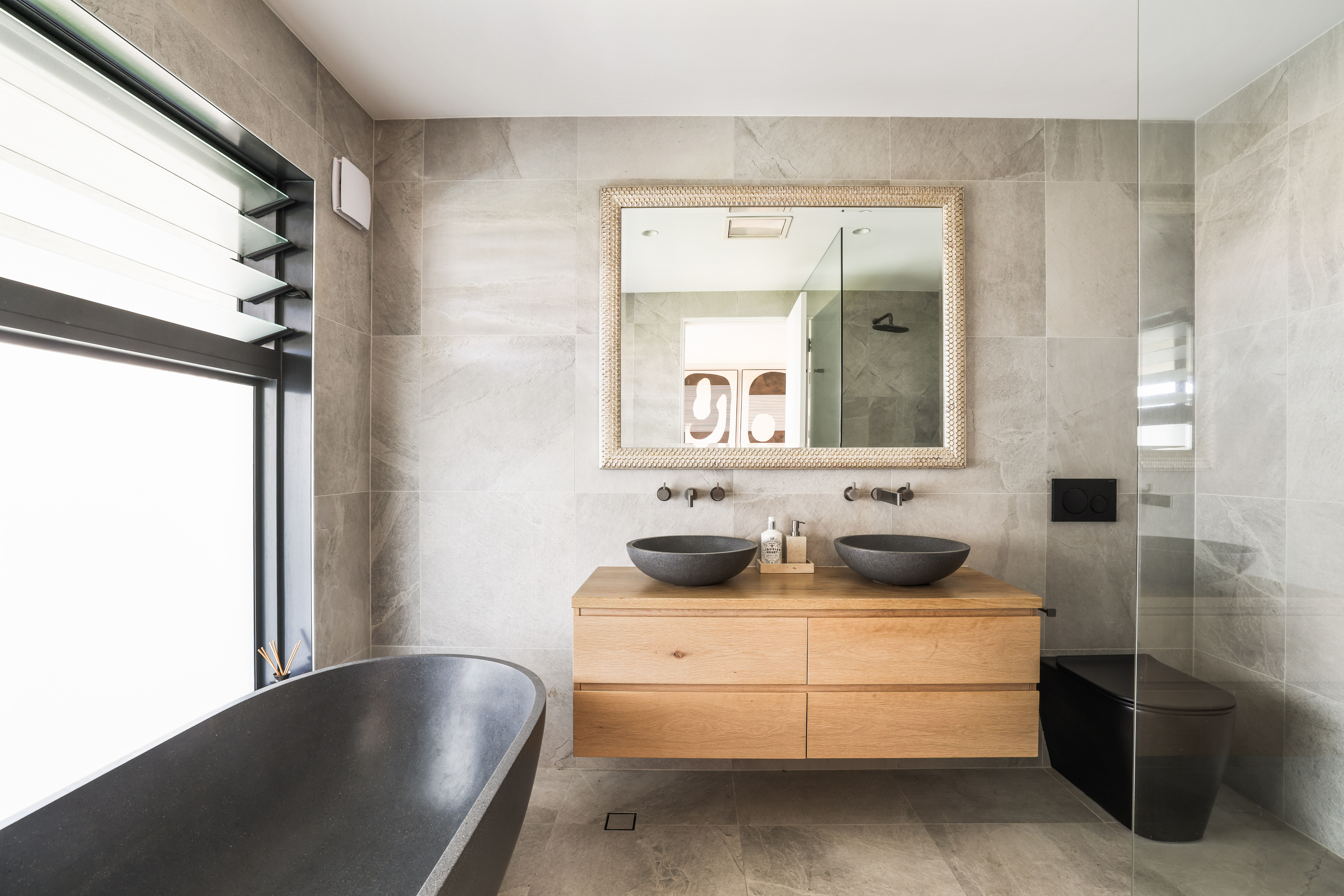 * The stunning Master ensuite showcases freestanding Italian stone bath, Italian stone basins, and Sussex designer tapware
