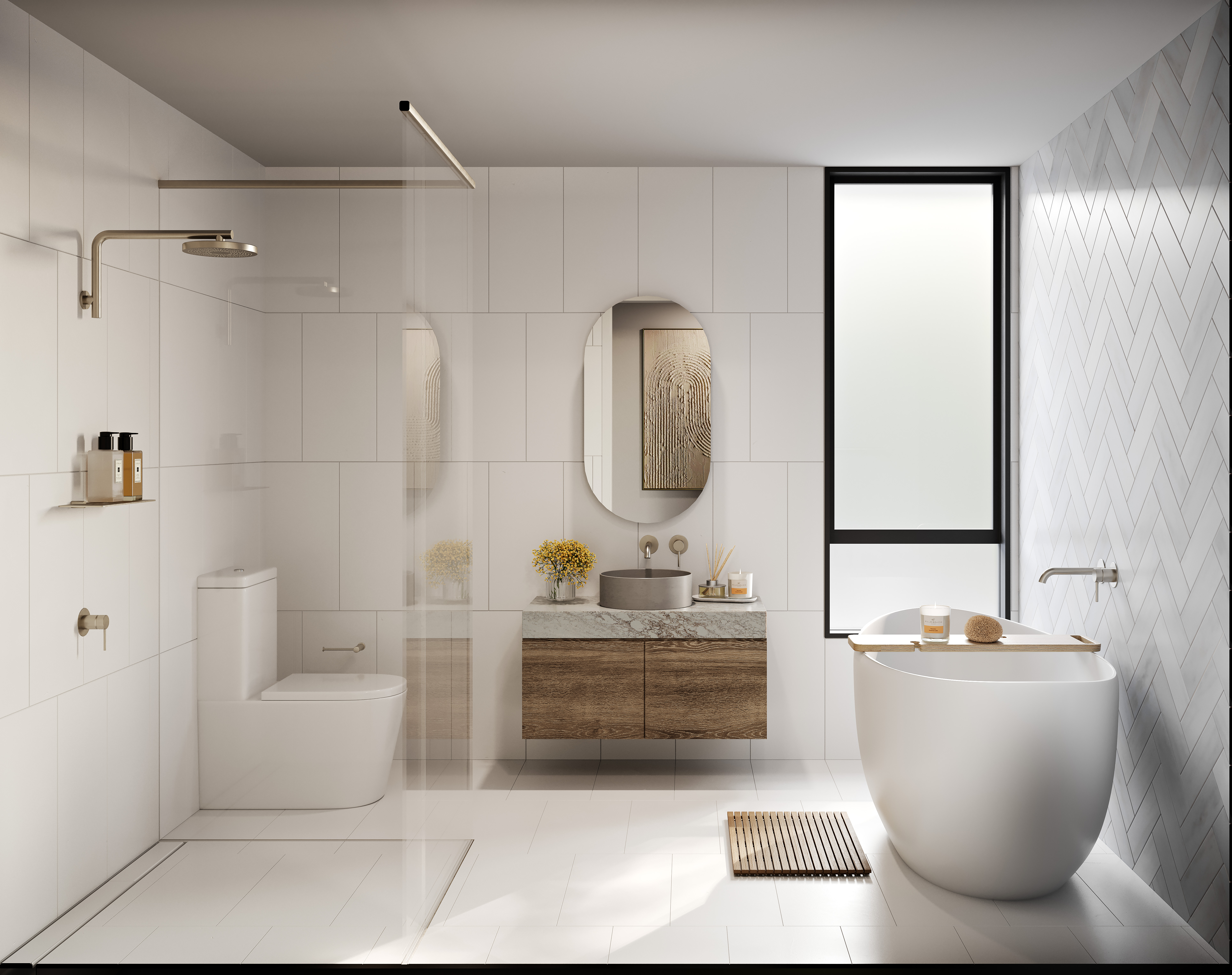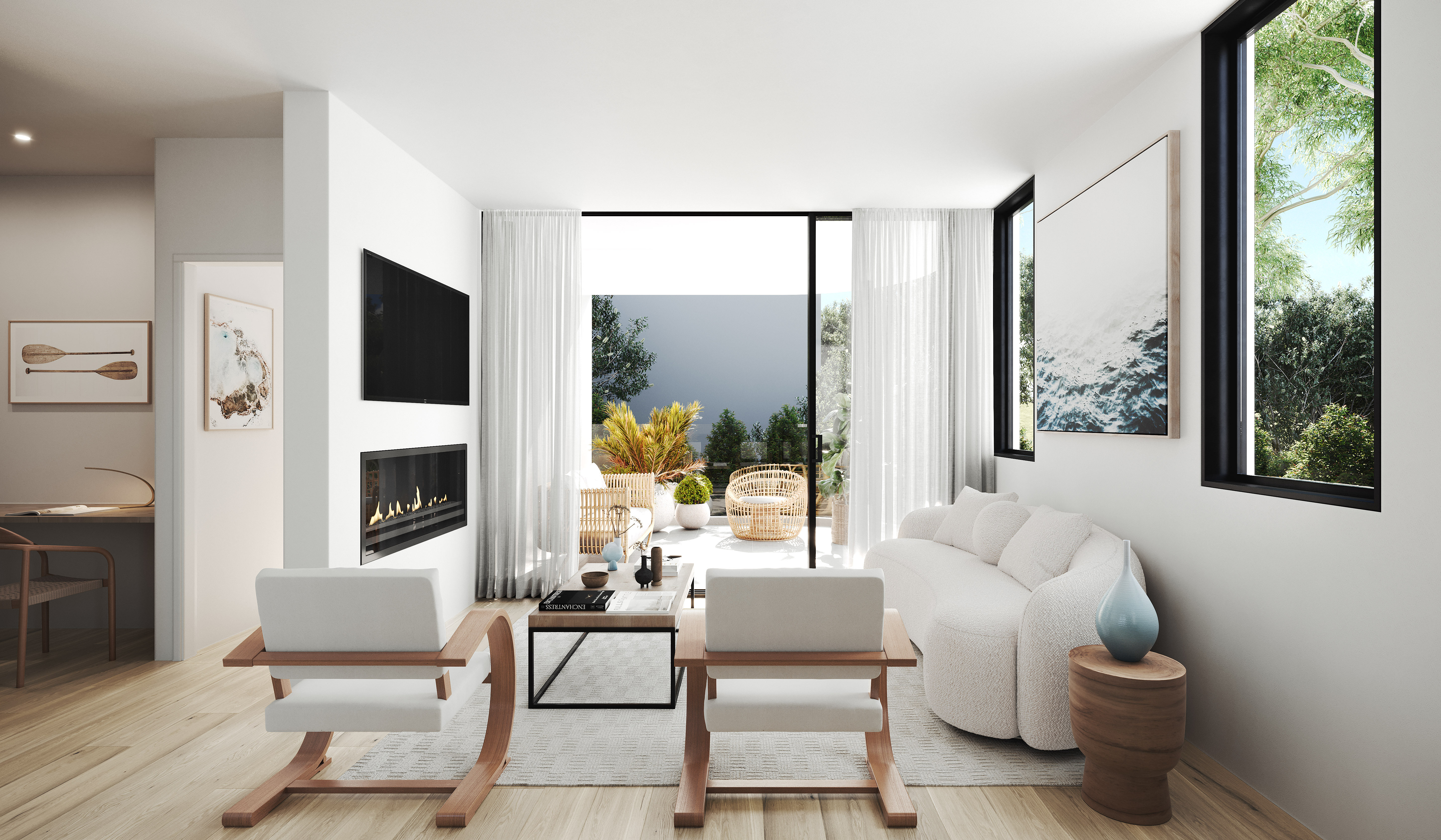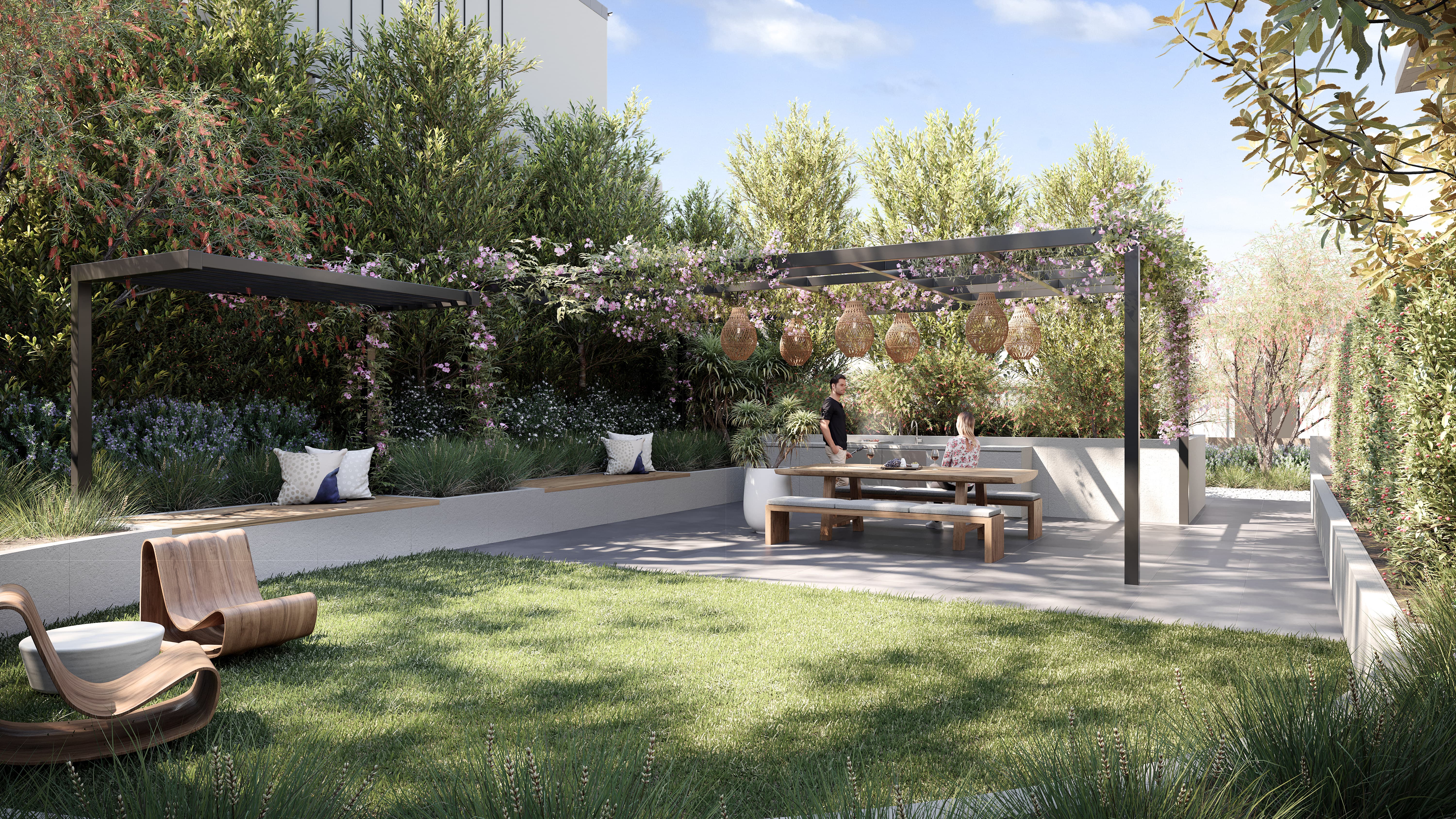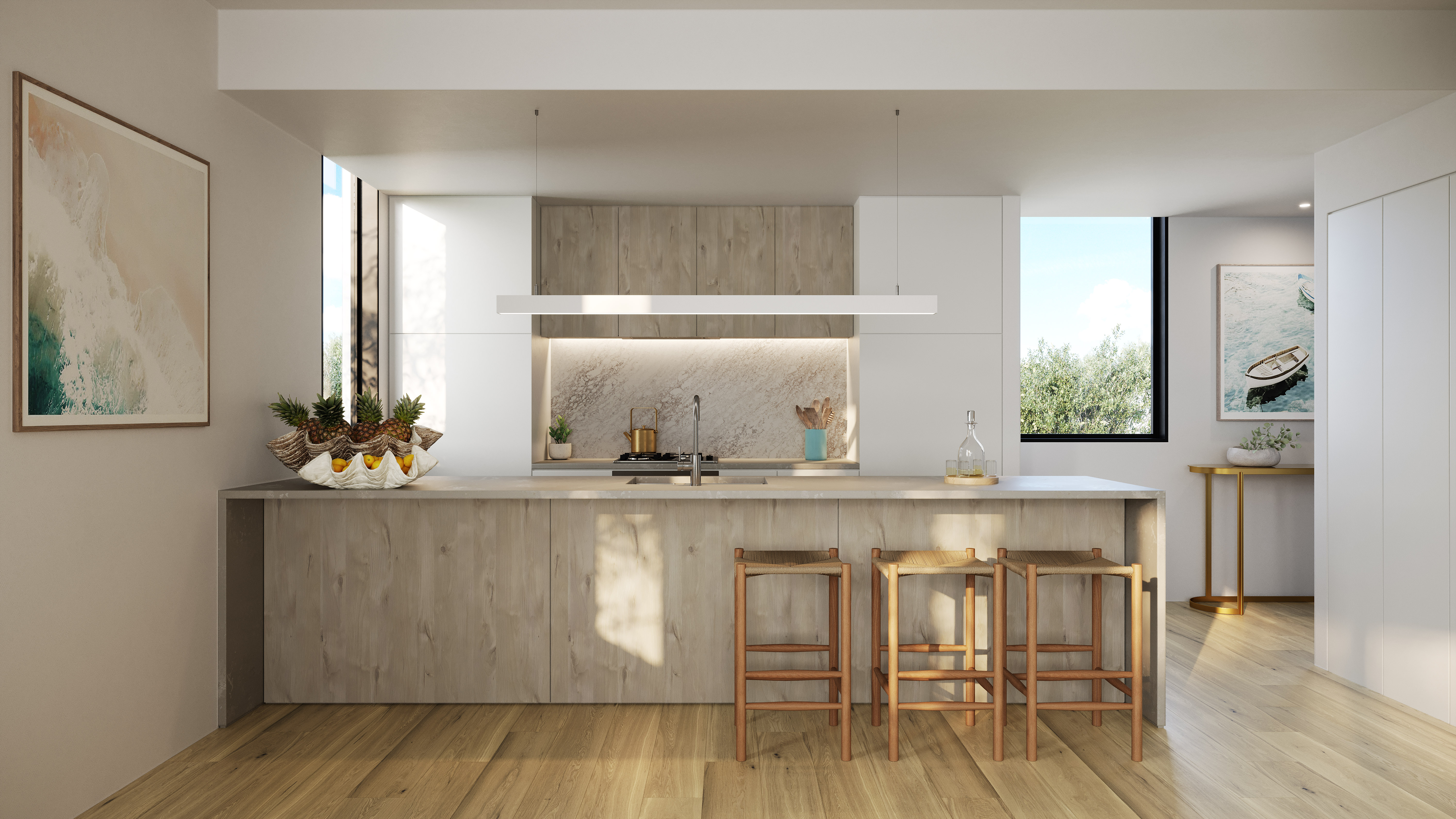 The interiors are an expression of the essential modern Australian beachside lifestyle: simple, spacious, and understated. The bathrooms feature luxurious freestanding bathtubs and sleek, modern designs with warming timber joinery and elegant brushed nickel finishes. The kitchens and living spaces have flowing clean lines with a focus on space and light, and the communal gardens and private courtyards are brimming with lush greenery. Perfect for relaxation and entertaining, whether you prefer to do so indoors or outdoors.