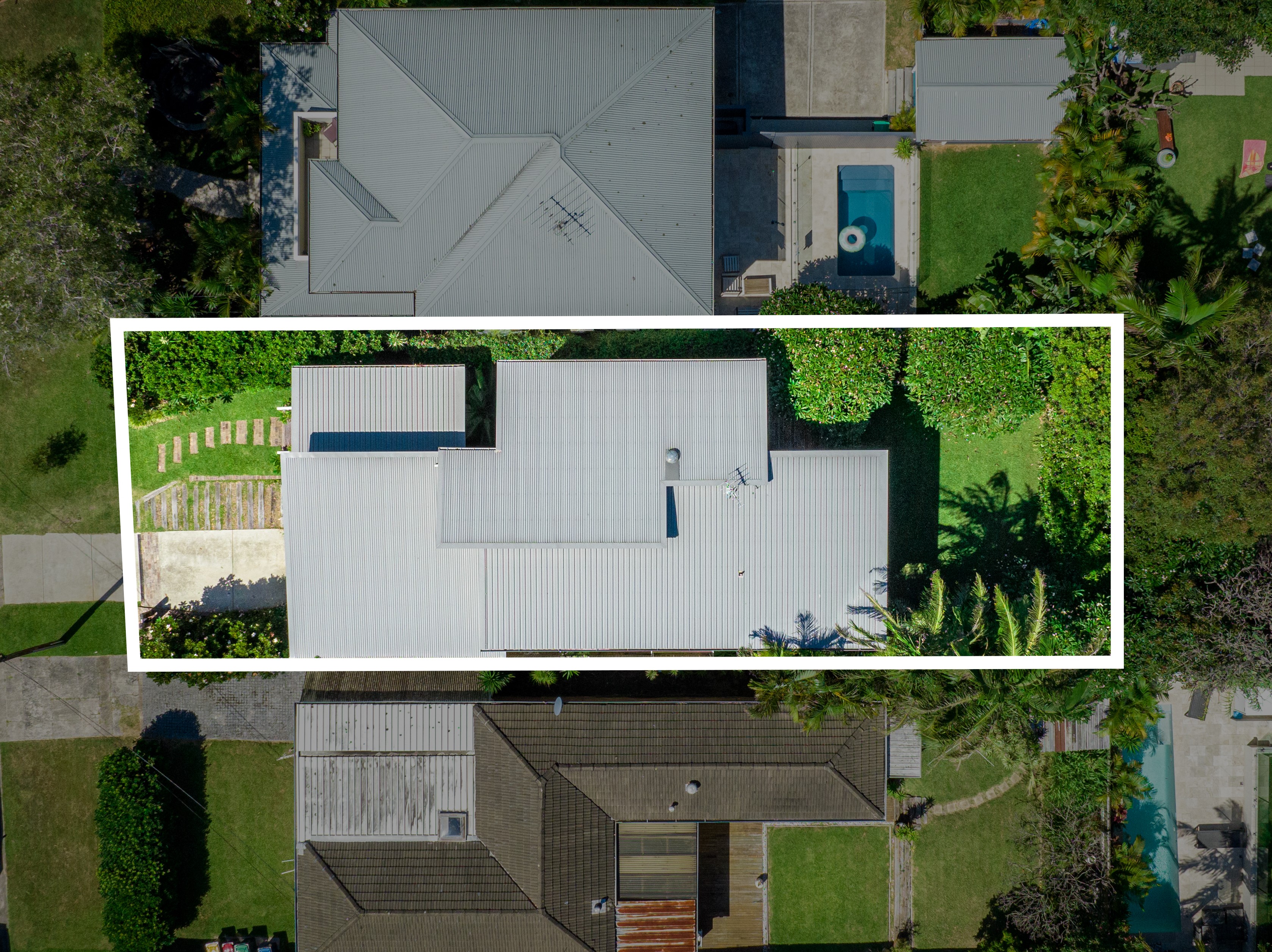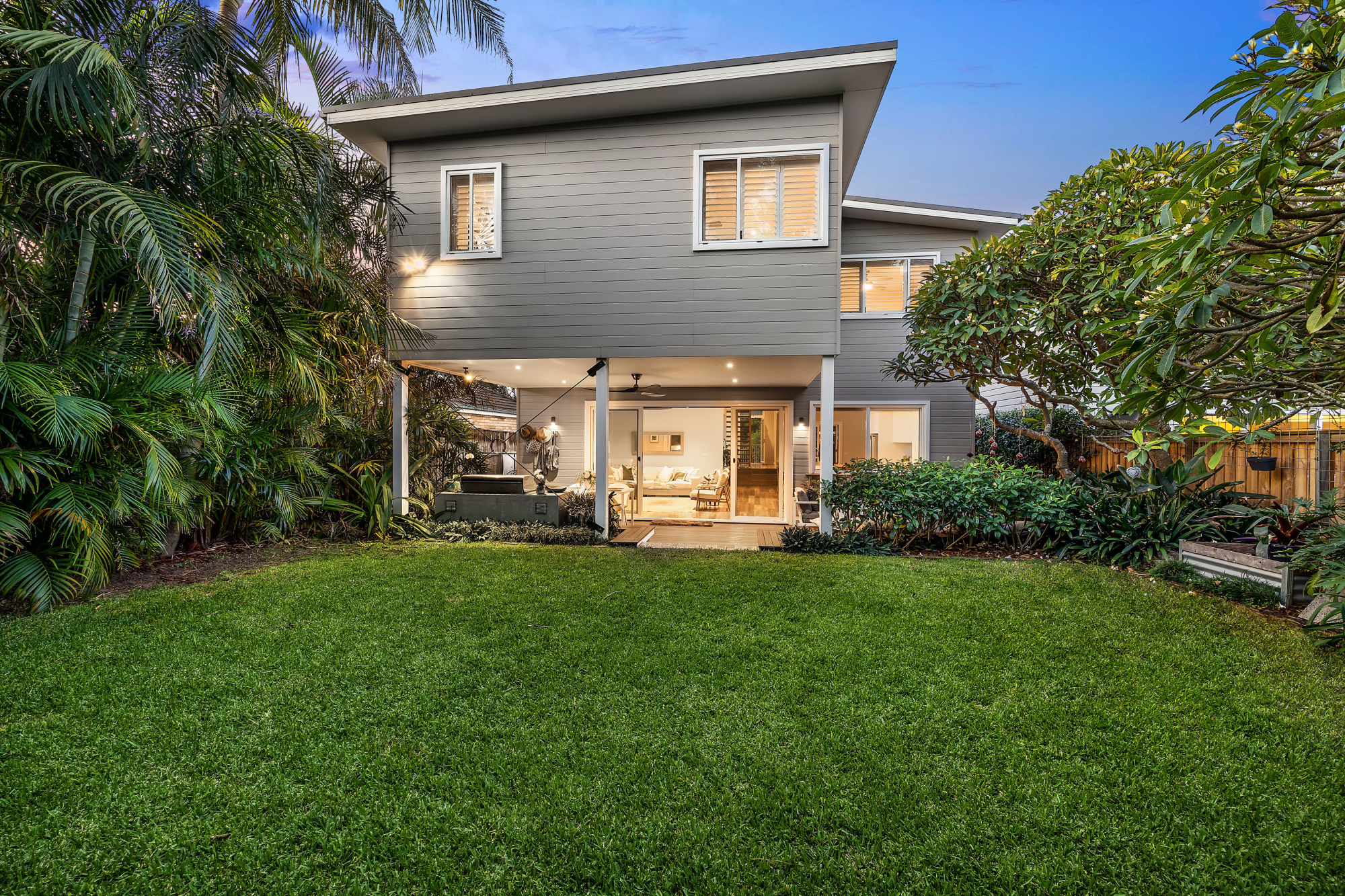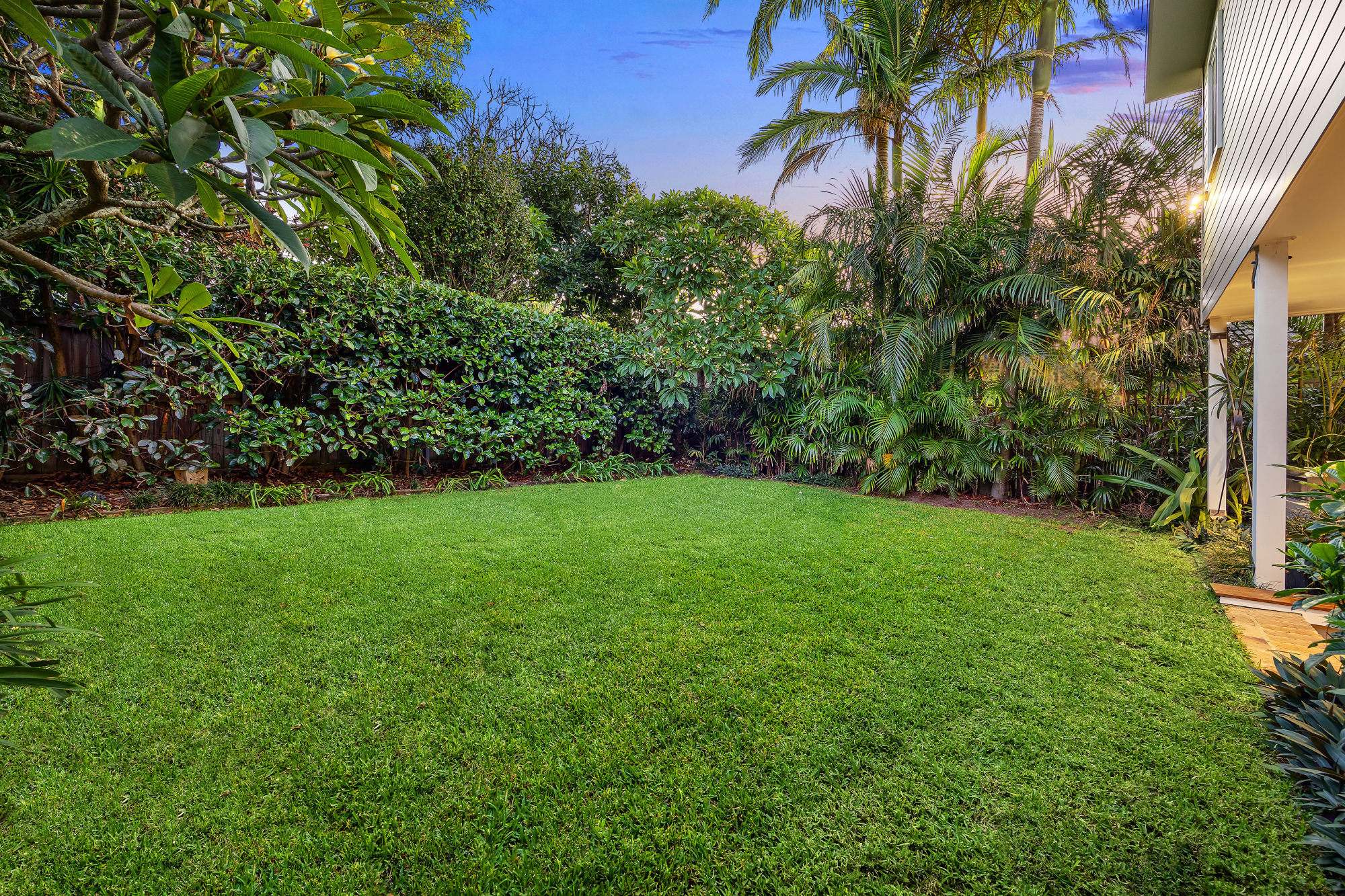 – Near level rear lawn screened by palms, viburnum and frangipanis