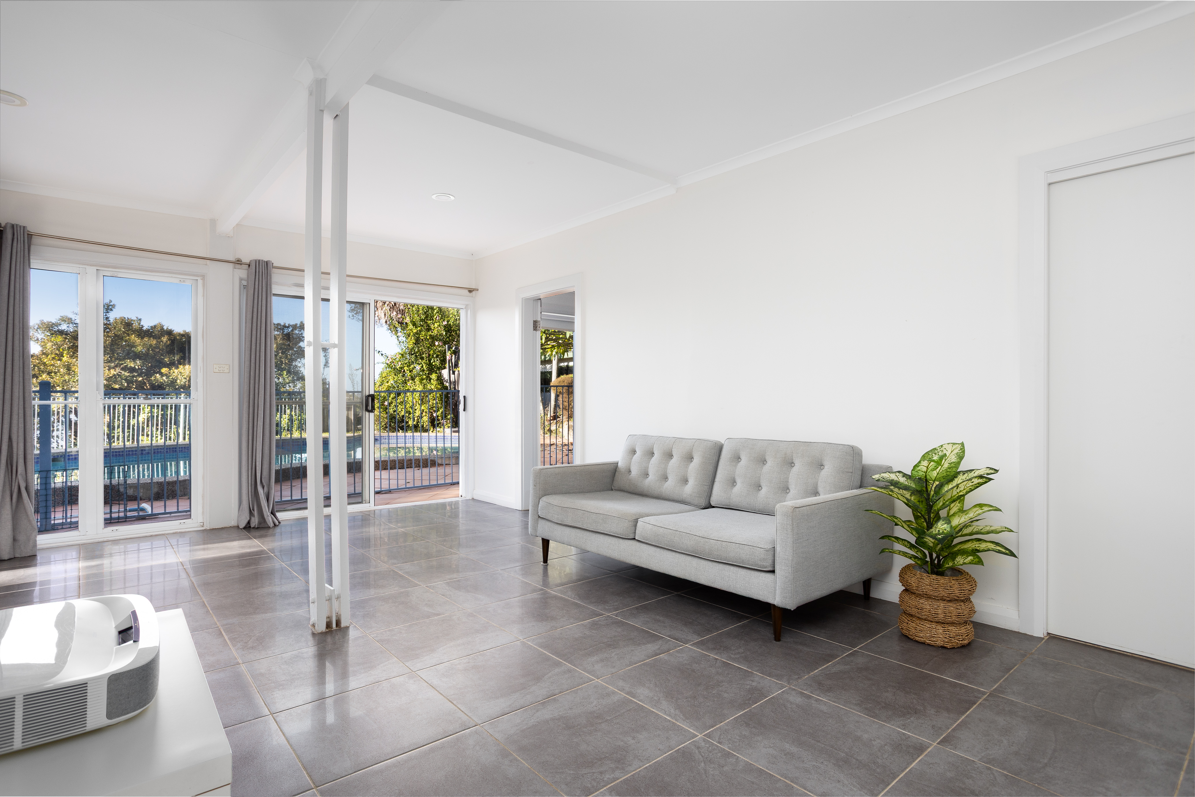 * Downstairs family room with tiled flooring opens to a sunny poolside terrace