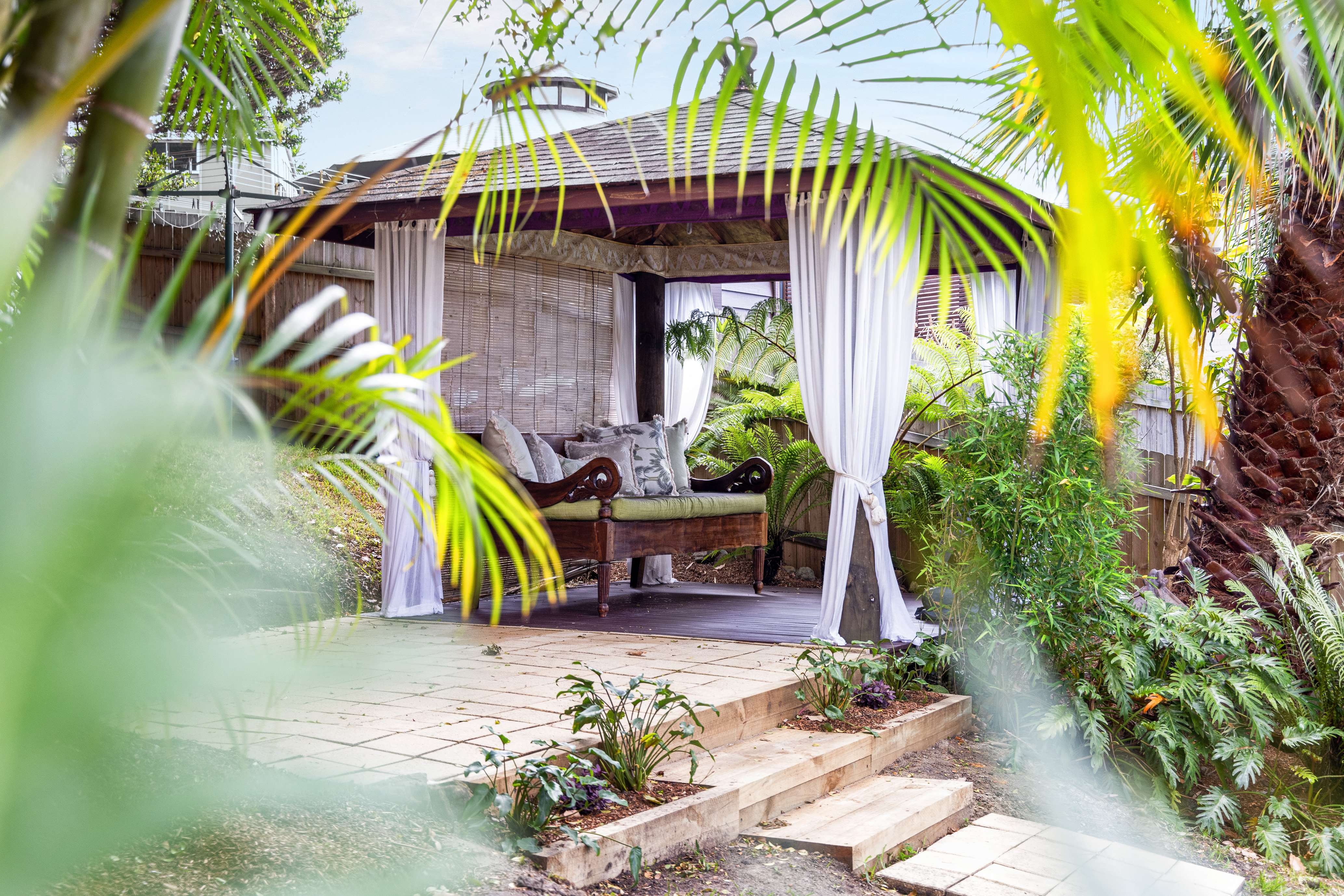 – Peaceful leafy outlook with serene filtered ocean glimpse
