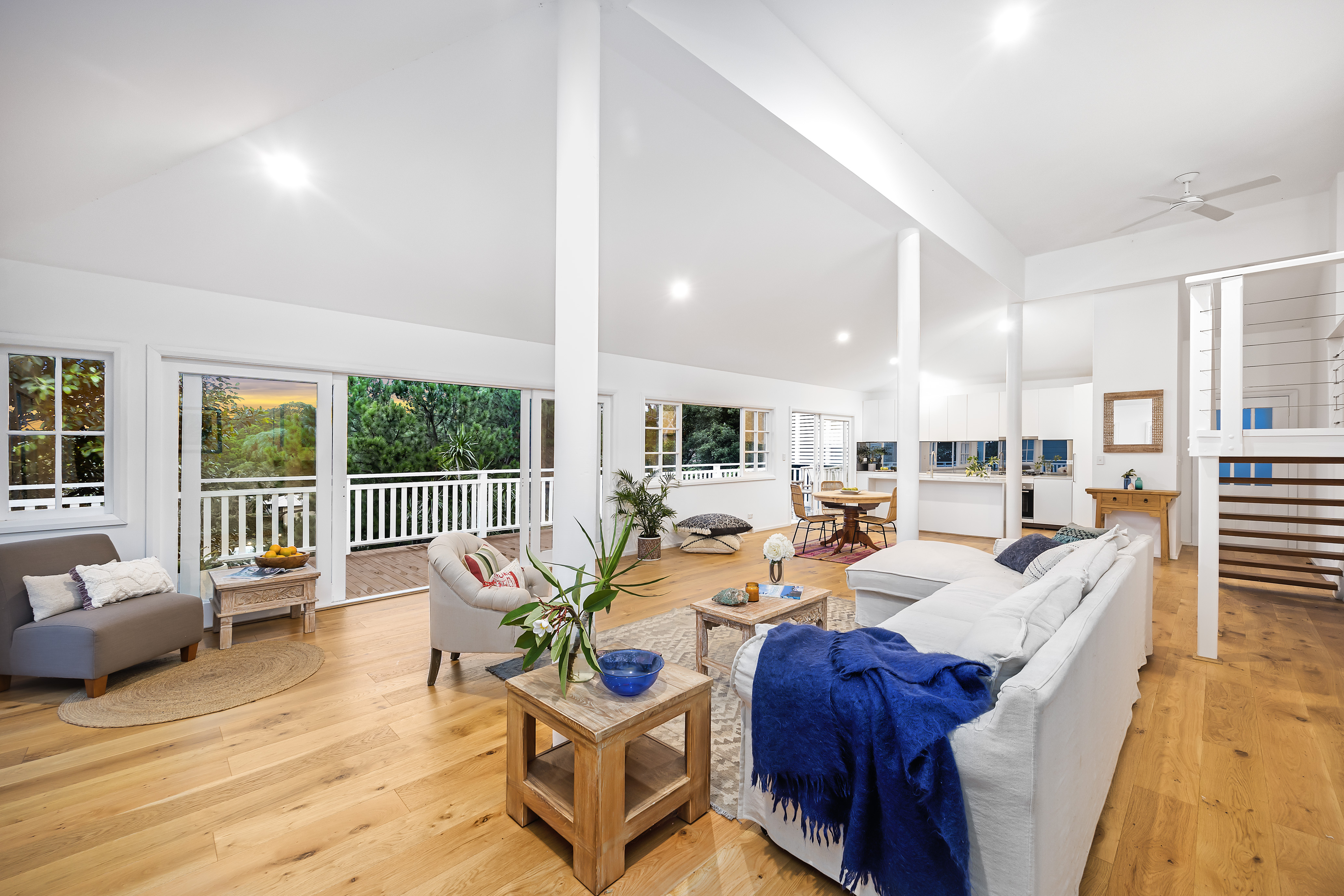 Tucked away in a quiet cul-de-sac, this chic, architect designed retreat sits in a peaceful, leafy setting with ocean views and an expansive wrap-around deck, perfect for all-year entertaining. The window wrapped lounge area accompanied by its open plan kitchen and high-vaulted ceilings provide a peaceful, airy ambience throughout, making the most of the Newport lifestyle in this recently renovated home.