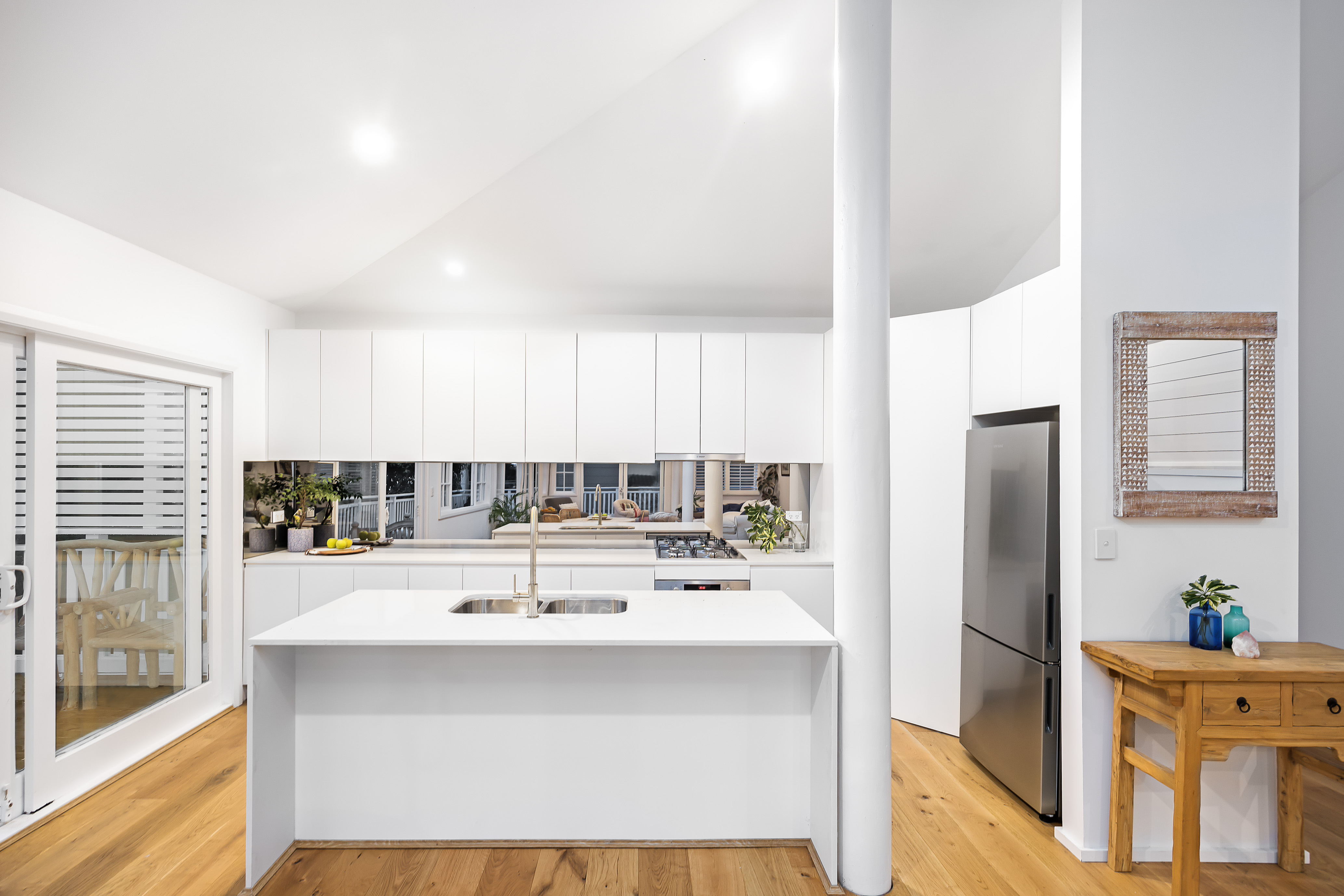 – Brand new kitchen with waterfall Caesarstone benches, island bench with breakfast bar and double sink, quality stainless steel appliances, with elegant, mirrored splashbacks