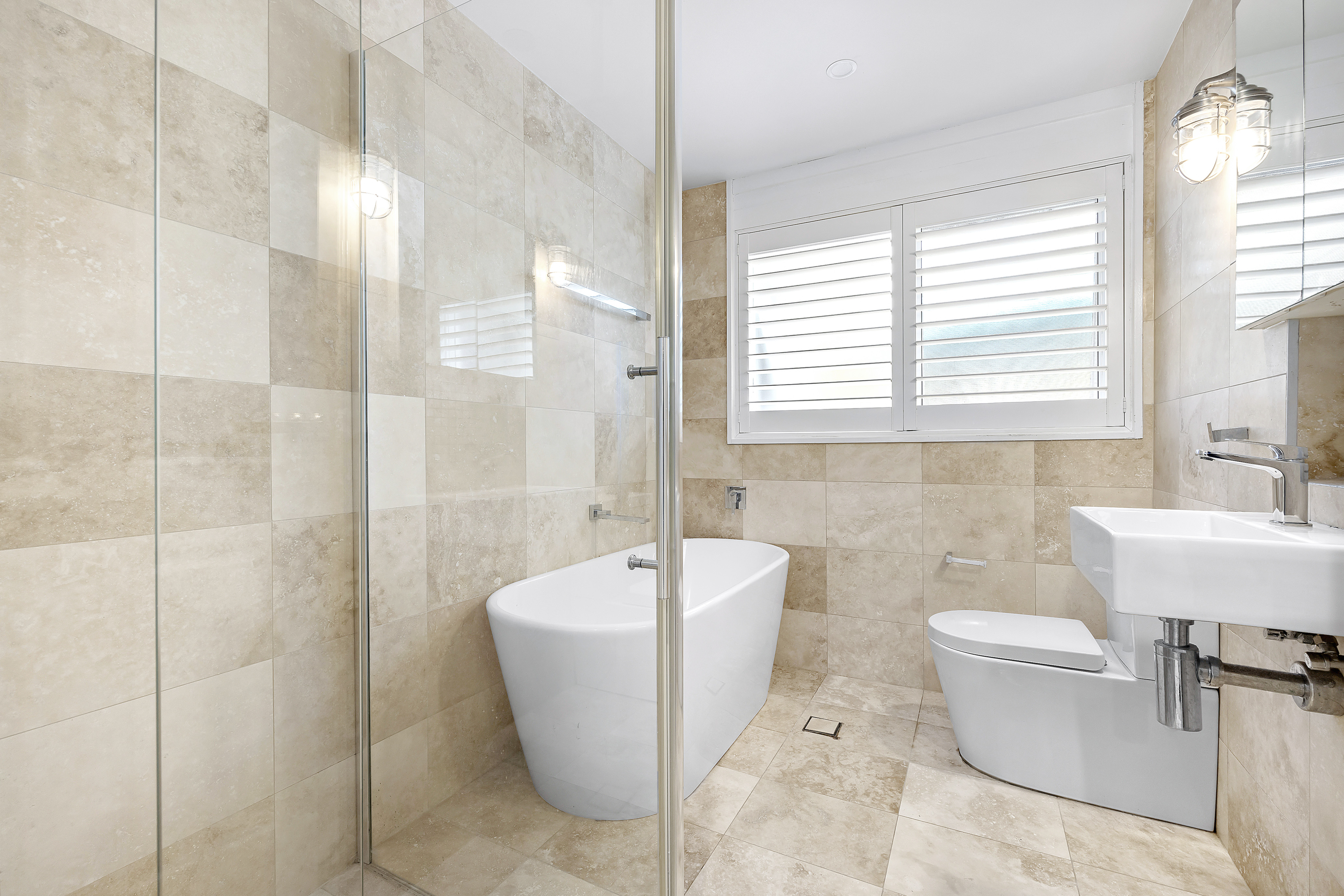 -Glass fronted interiors enhanced by travertine floors and plantation shutters