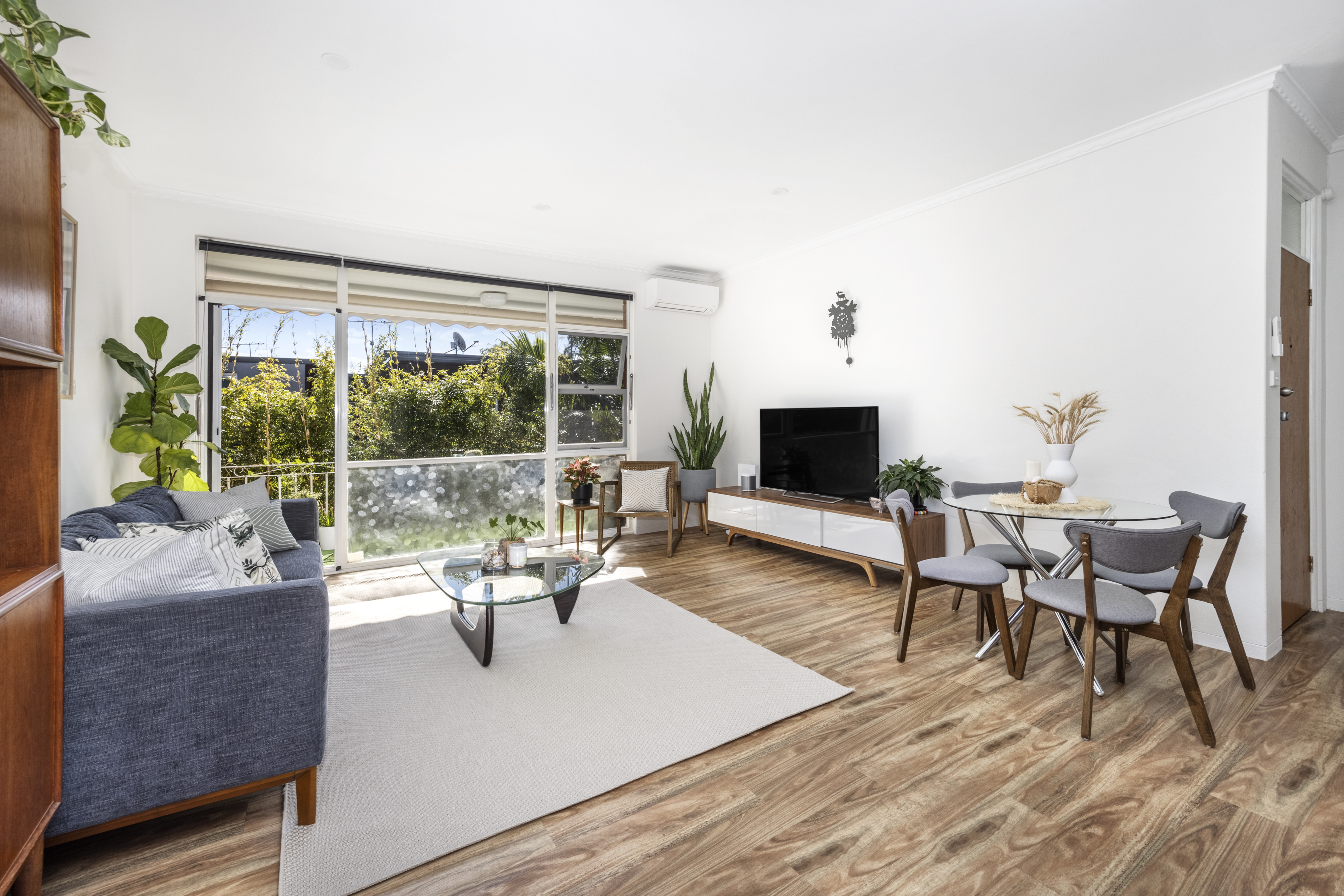 – Bright open-plan living and dining with air conditioning and timber-look floors