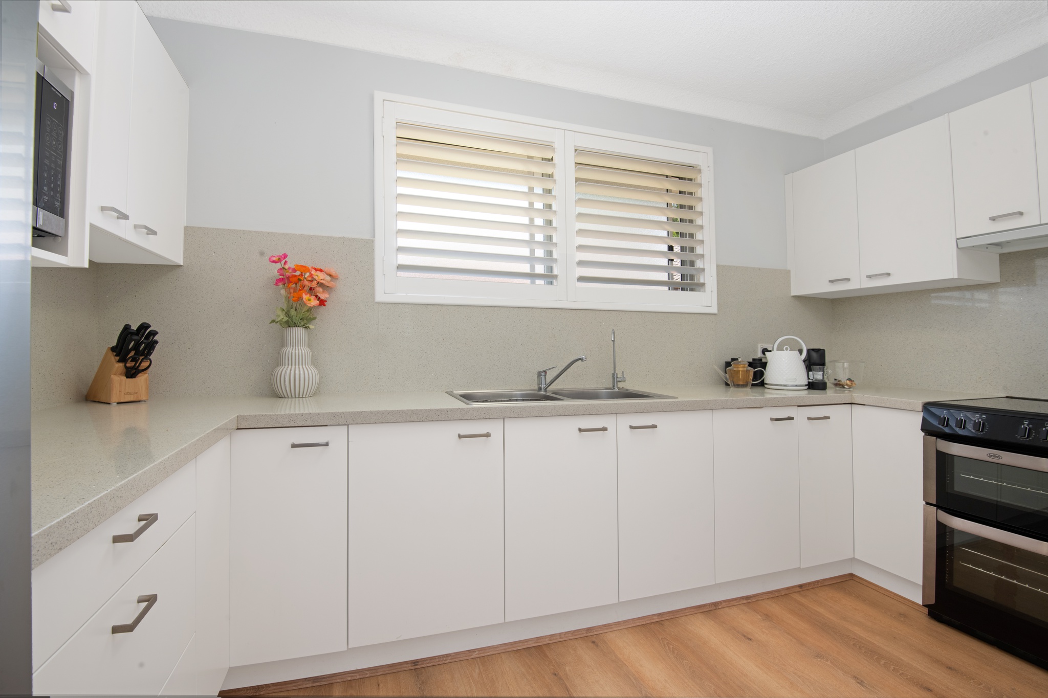 Each room features ceiling fans for added comfort, and plantation shutters offer both privacy and style. The spacious bedrooms come with large built-in wardrobes, while the bathroom includes a walk-in shower and a separate bath. The kitchen, with its stone benchtops and ample workspace, is perfect for cooking and entertaining.