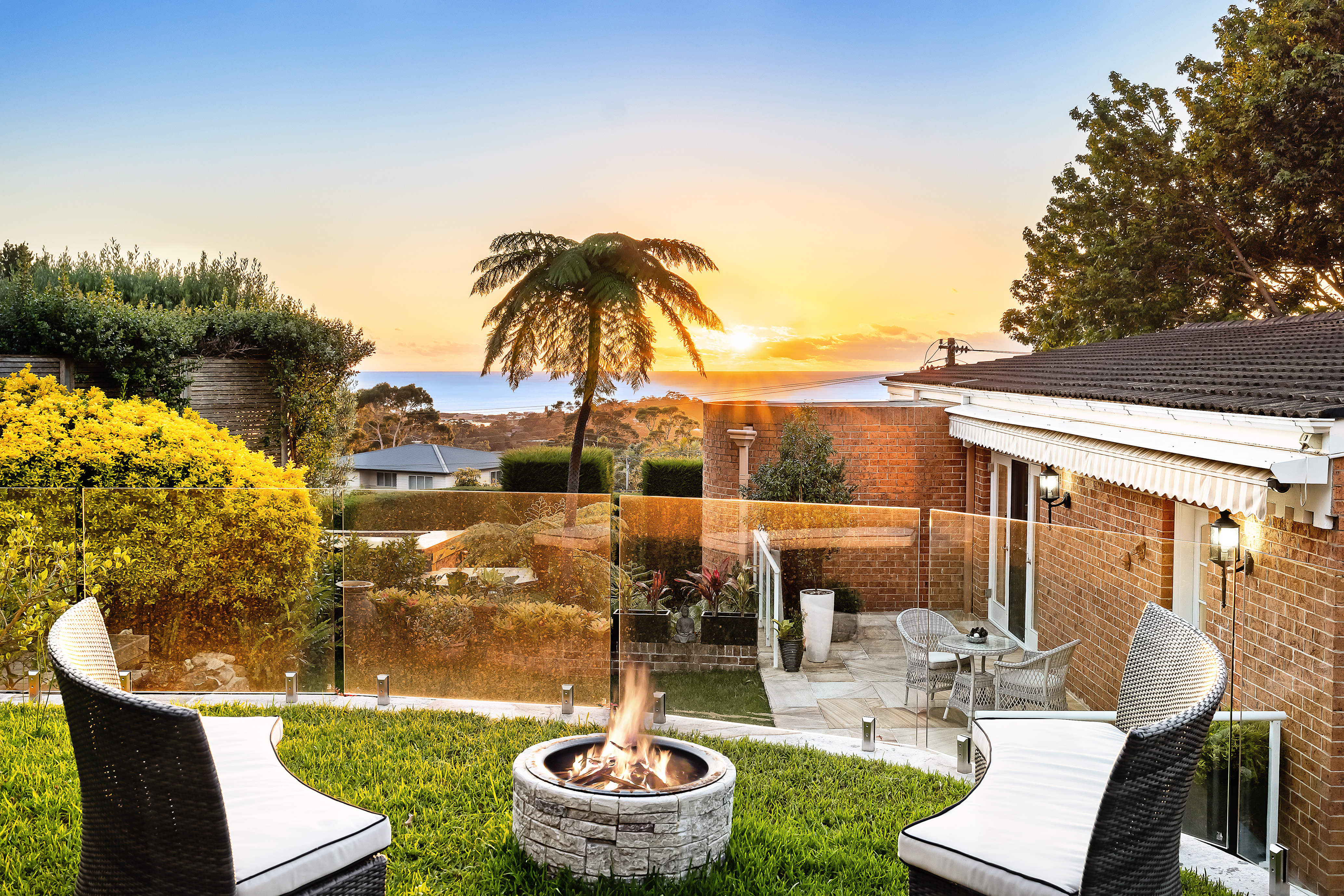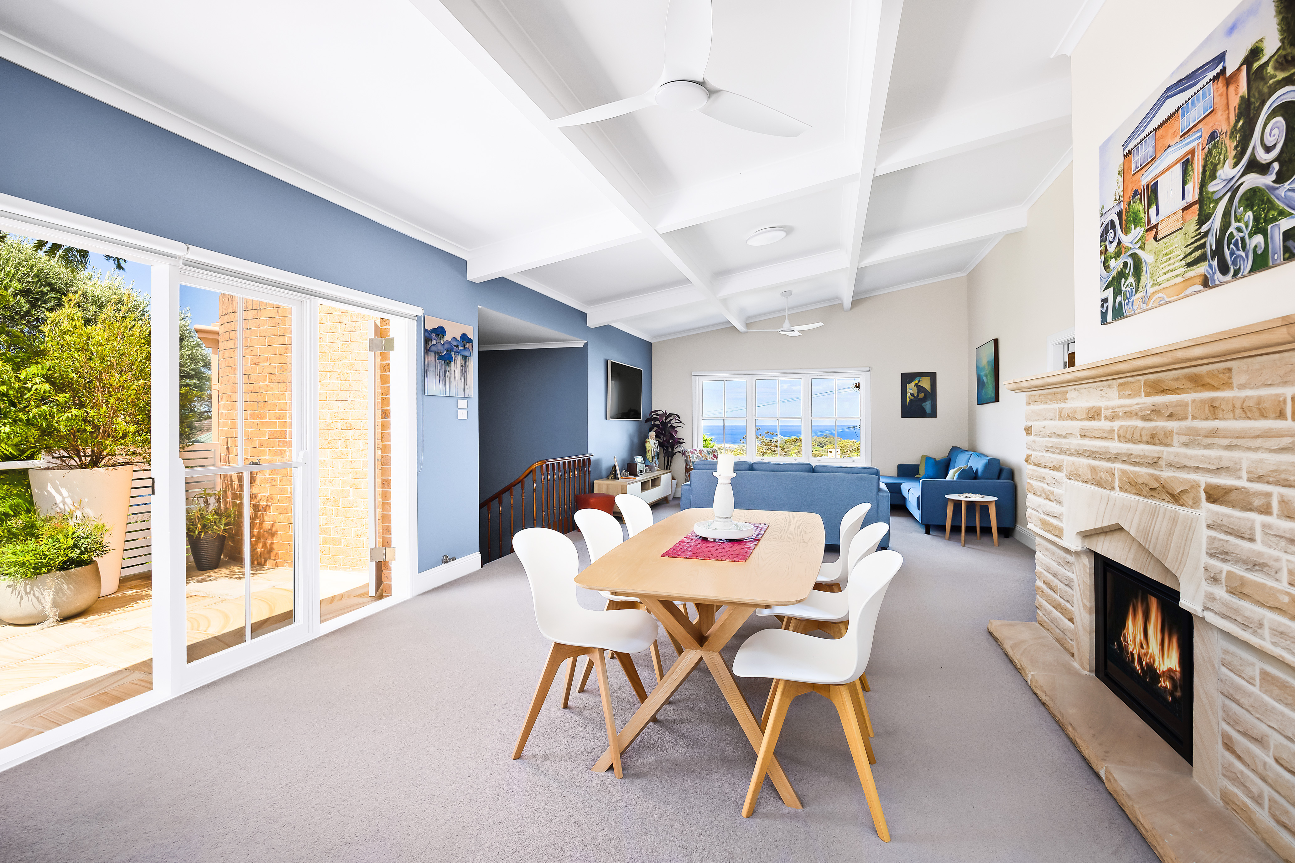 – Upstairs living/dining area with striking gas fireplace takes in views of Narrabeen Beach and ocean