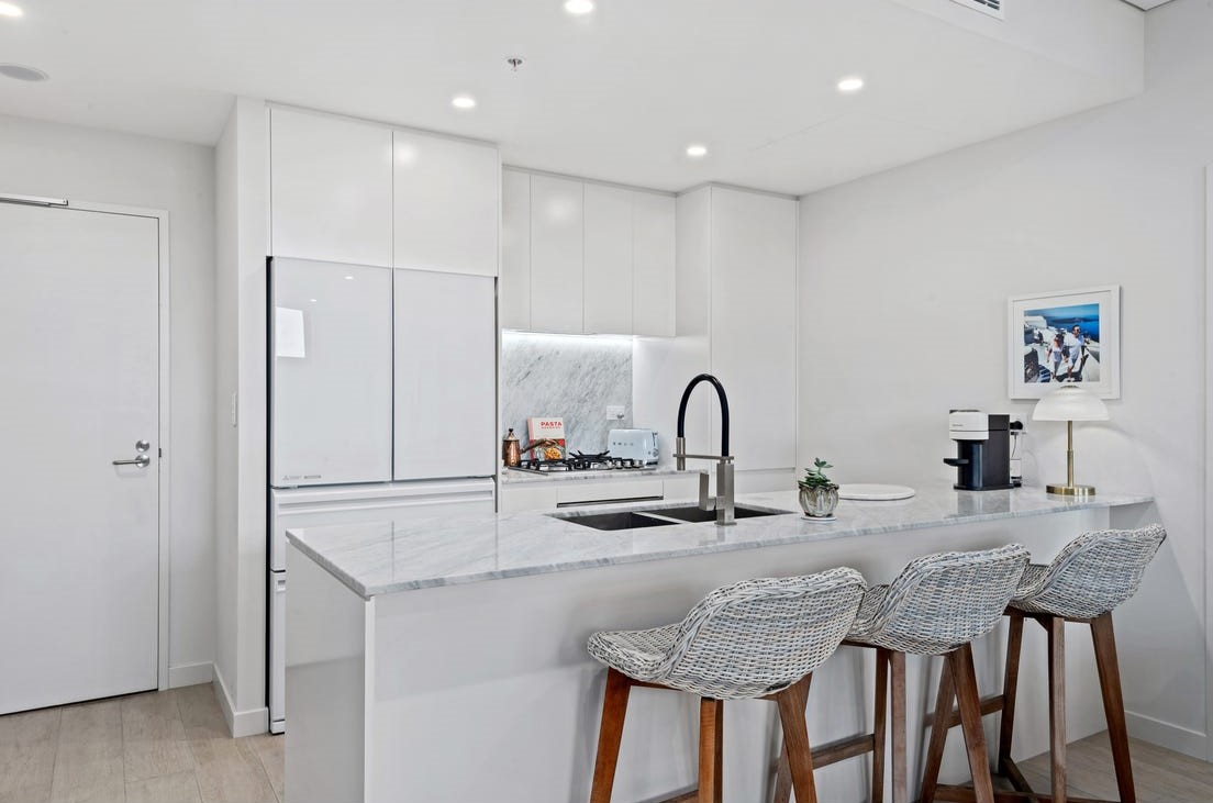 Experience the epitome of modern luxury in this stunning four-bedroom penthouse, located within a secure six-level building. The expansive living and dining area seamlessly extends to a covered balcony, offering a perfect indoor-outdoor flow. The chef-inspired kitchen features sleek Carrara marble benchtops, complemented by premium European stainless-steel appliances. The two luxurious bathrooms are adorned with marble vanities, exuding contemporary sophistication.