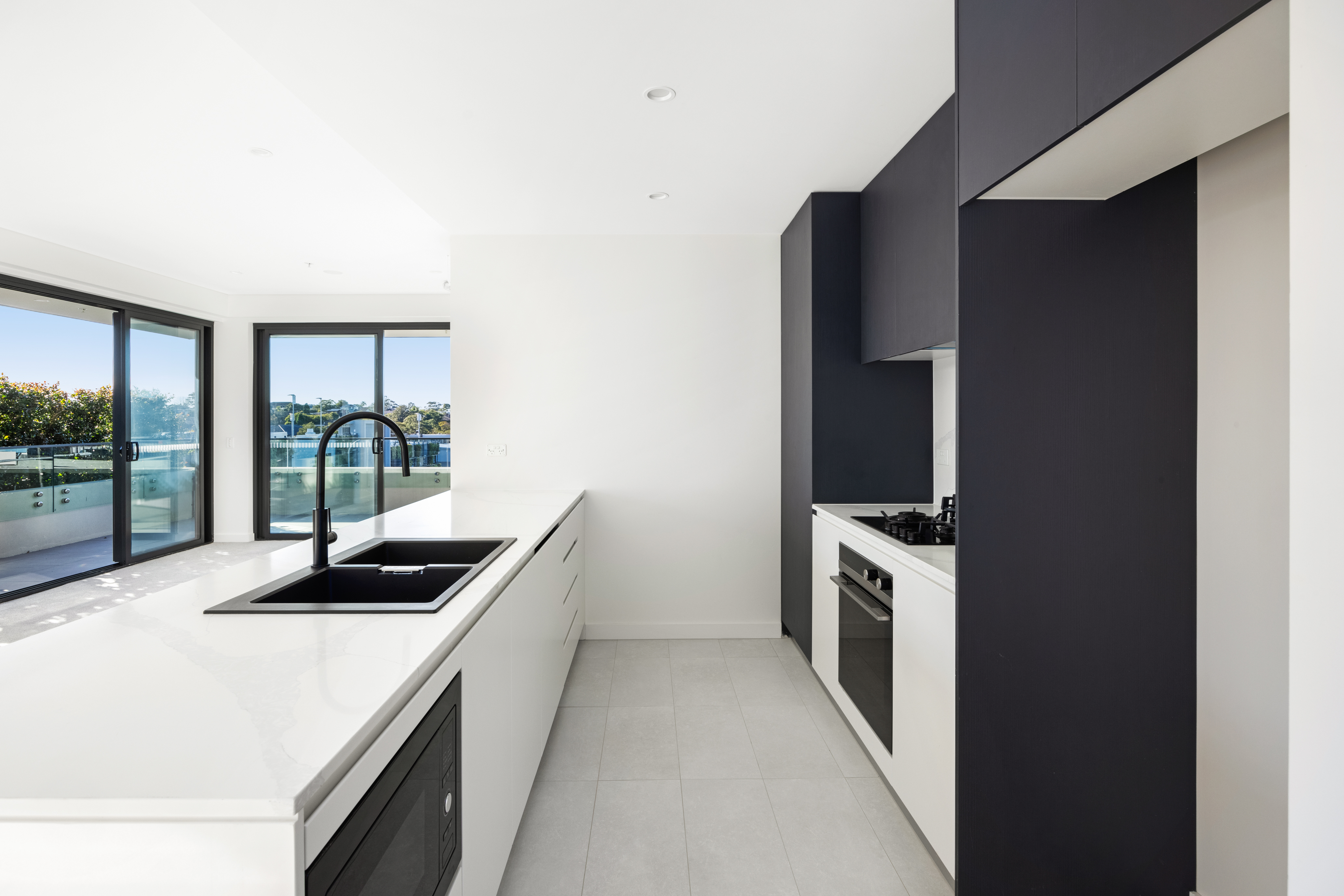 – Sleek kitchen with stone benchtops, gas cooking, and quality appliances