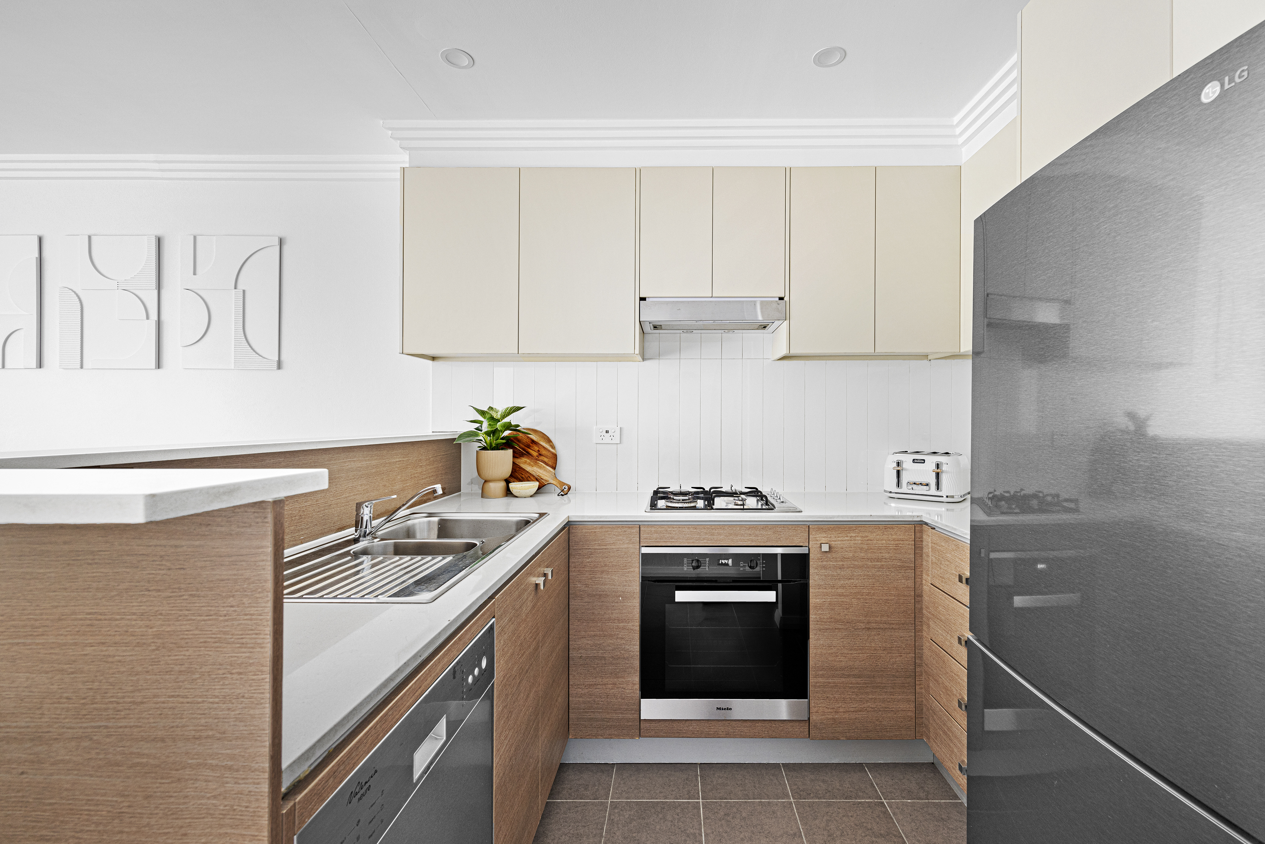 – Caesar Stone kitchen features stainless steel gas appliances and dishwasher