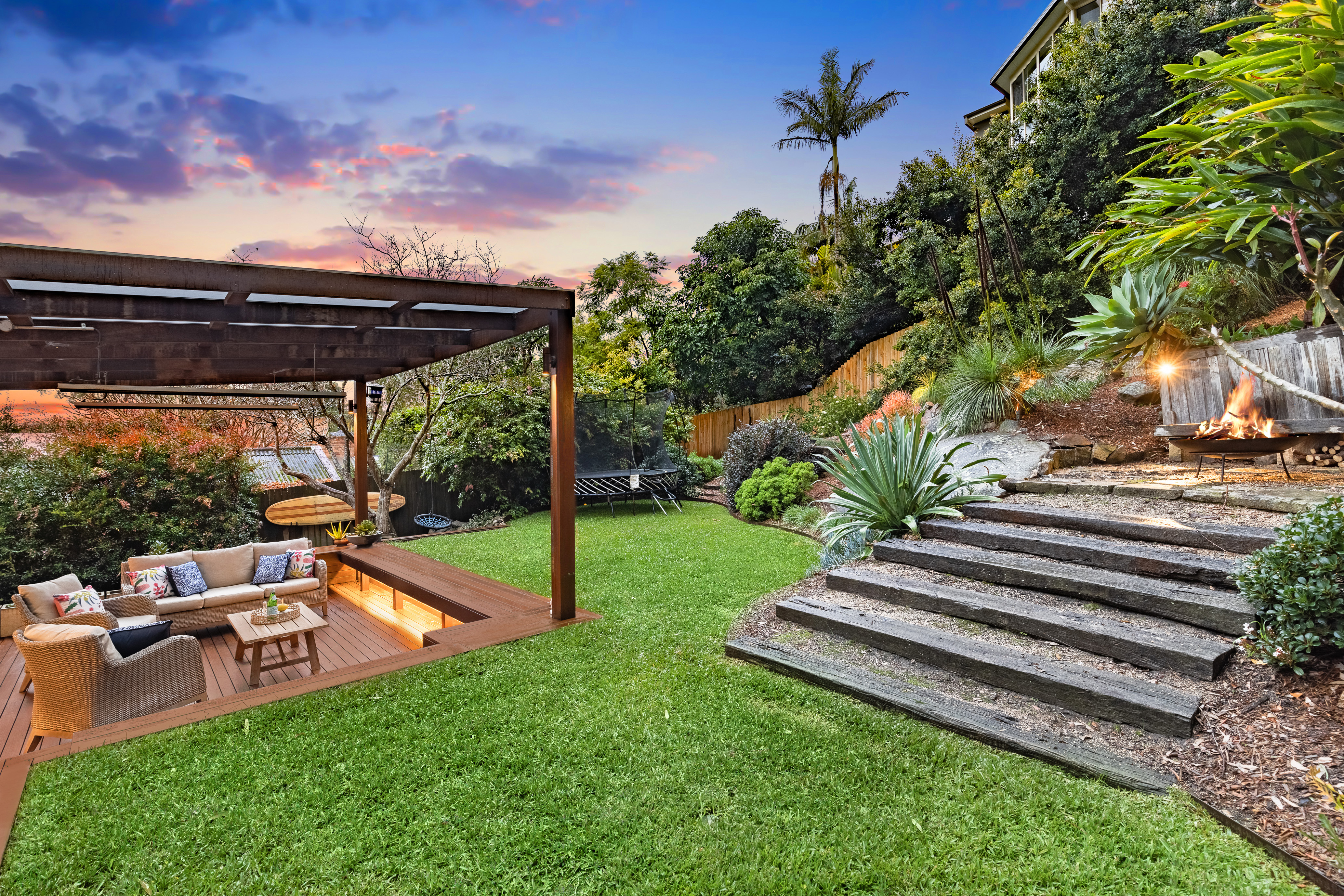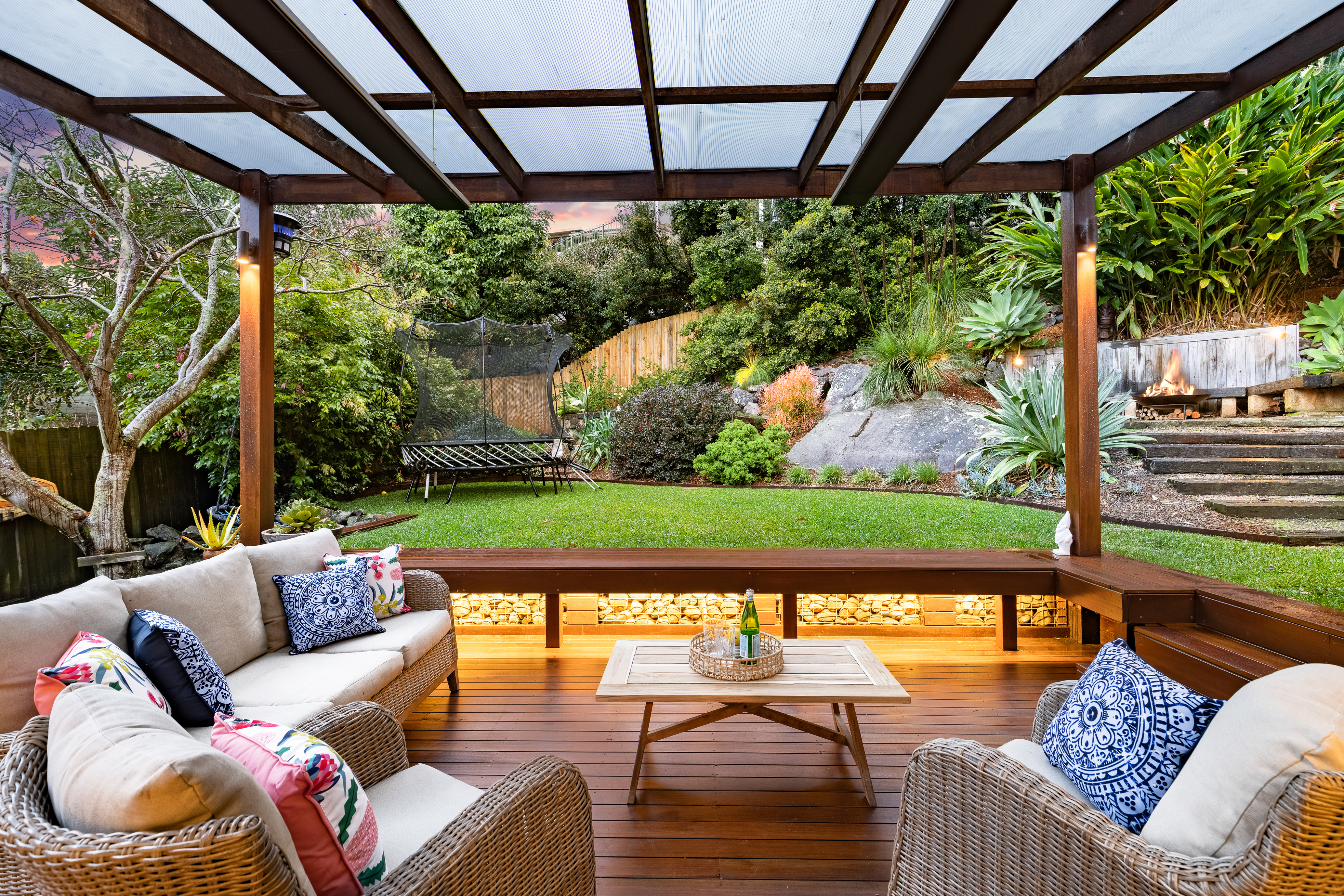 – Covered spotted gum entertaining deck with heater lamps, child-friendly level lawn, firepit area