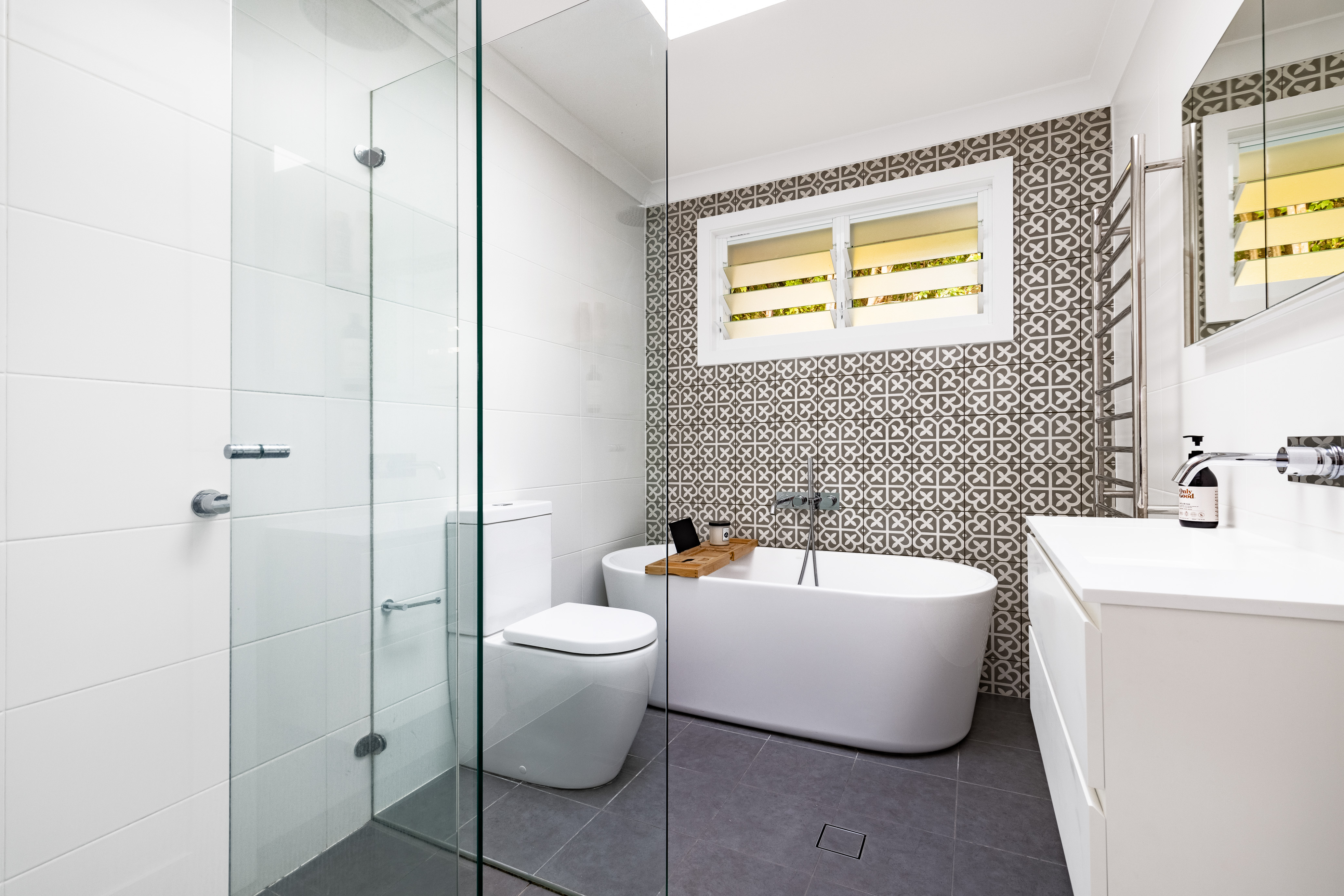 – Chic bathroom with freestanding bath, feature tiles and frameless glass shower