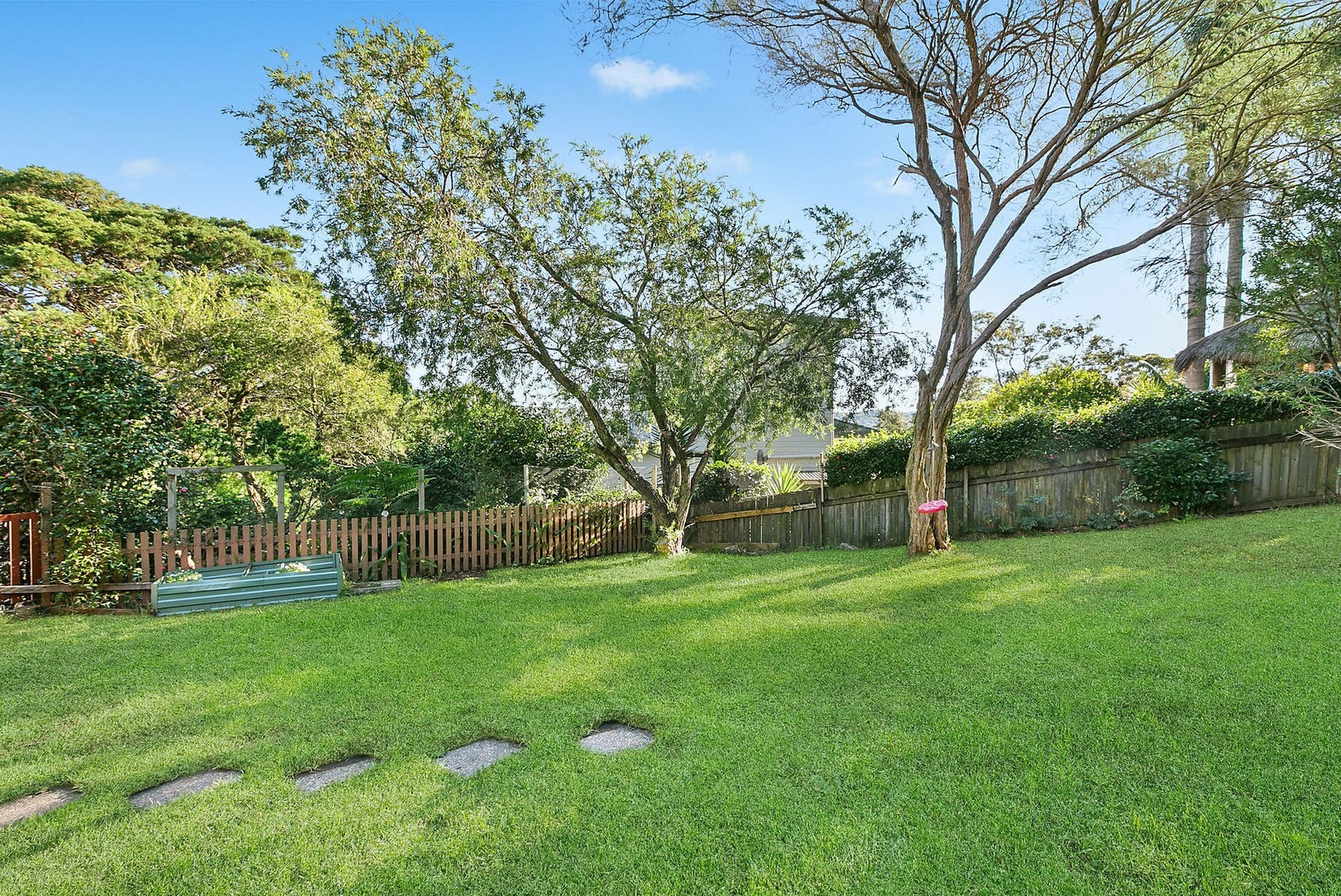 – Child-friendly backyard, terraced gardens with fruit trees and vegetable