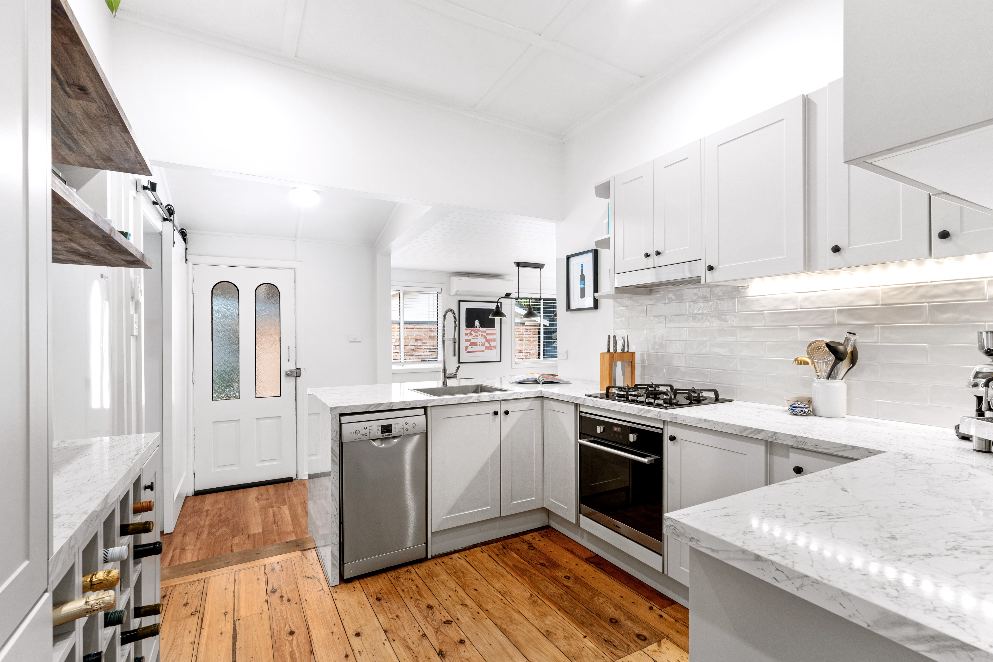 • Sleek open plan gas kitchen with a stainless steel Bosch dishwasher