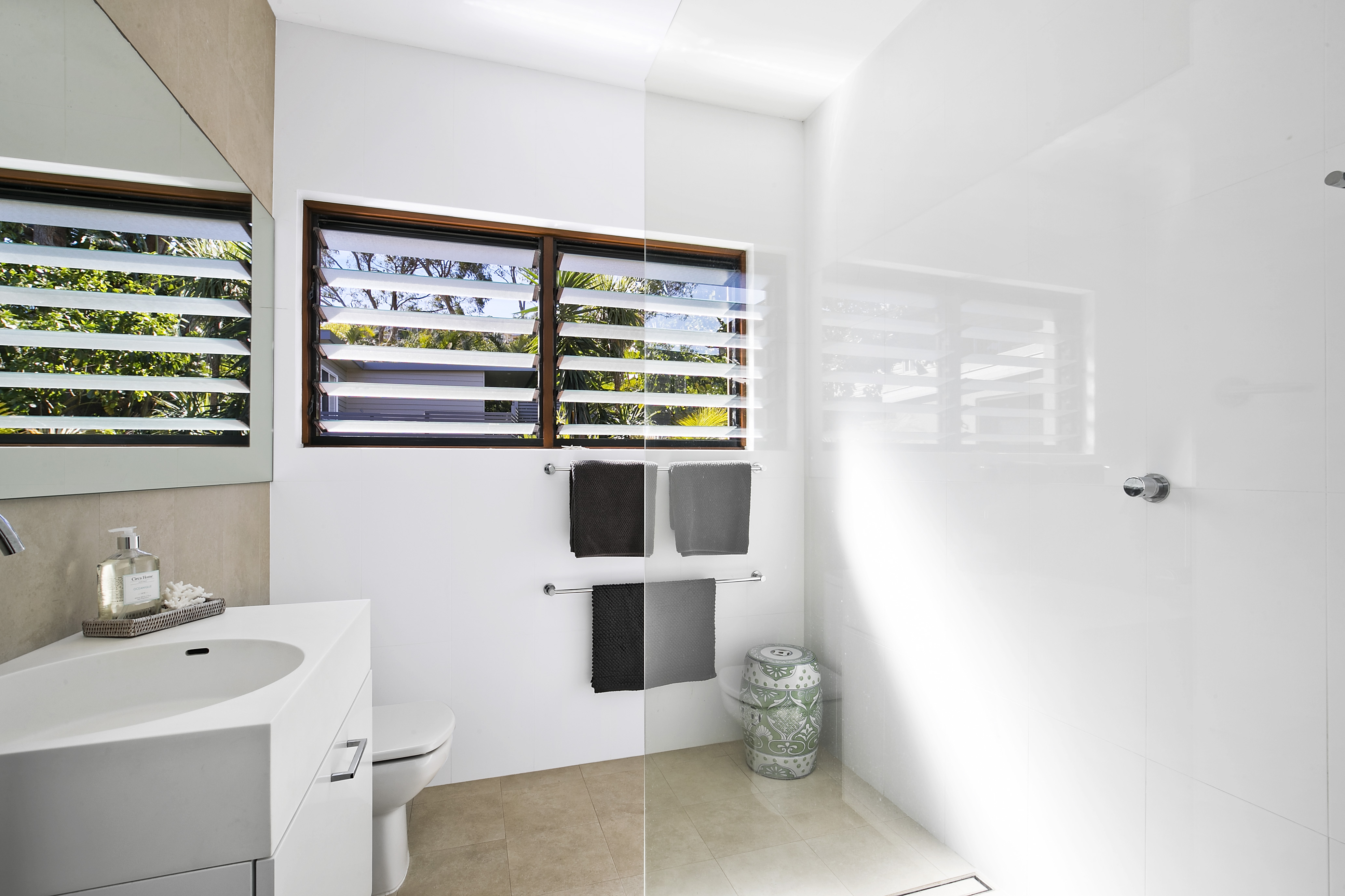 – Bright bathroom dressed in coastal themes, separate w/c, outdoor functional laundry