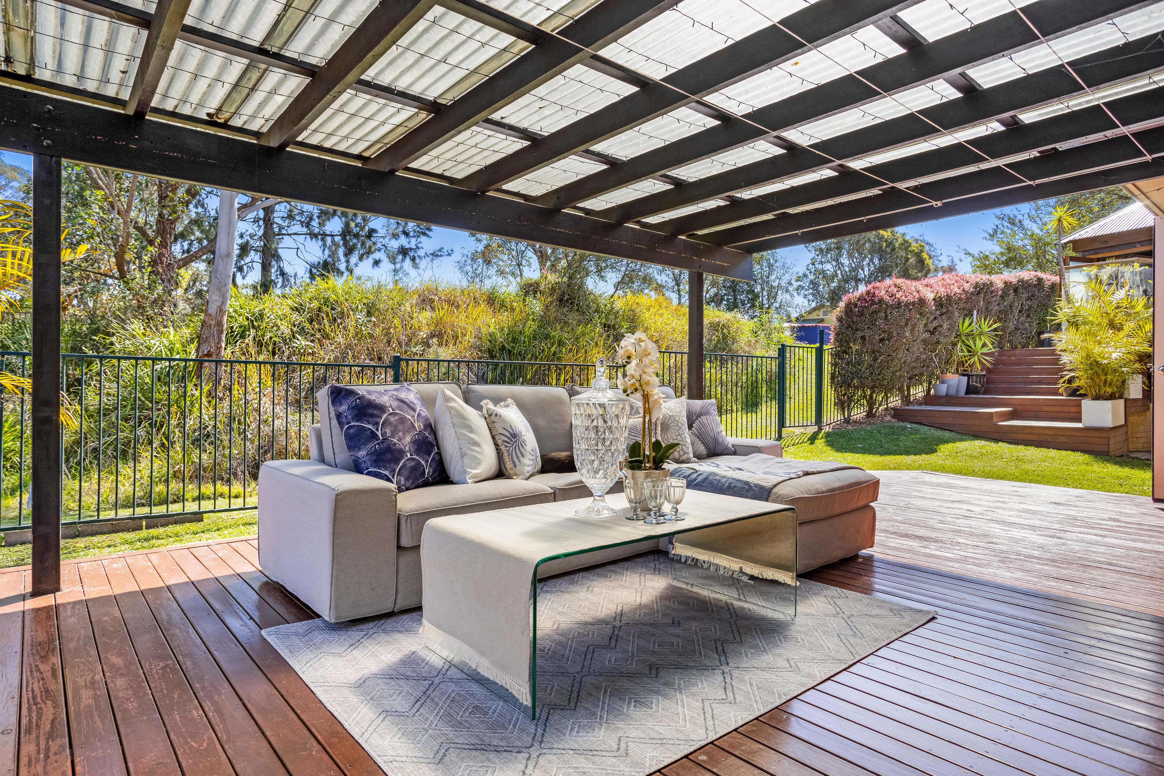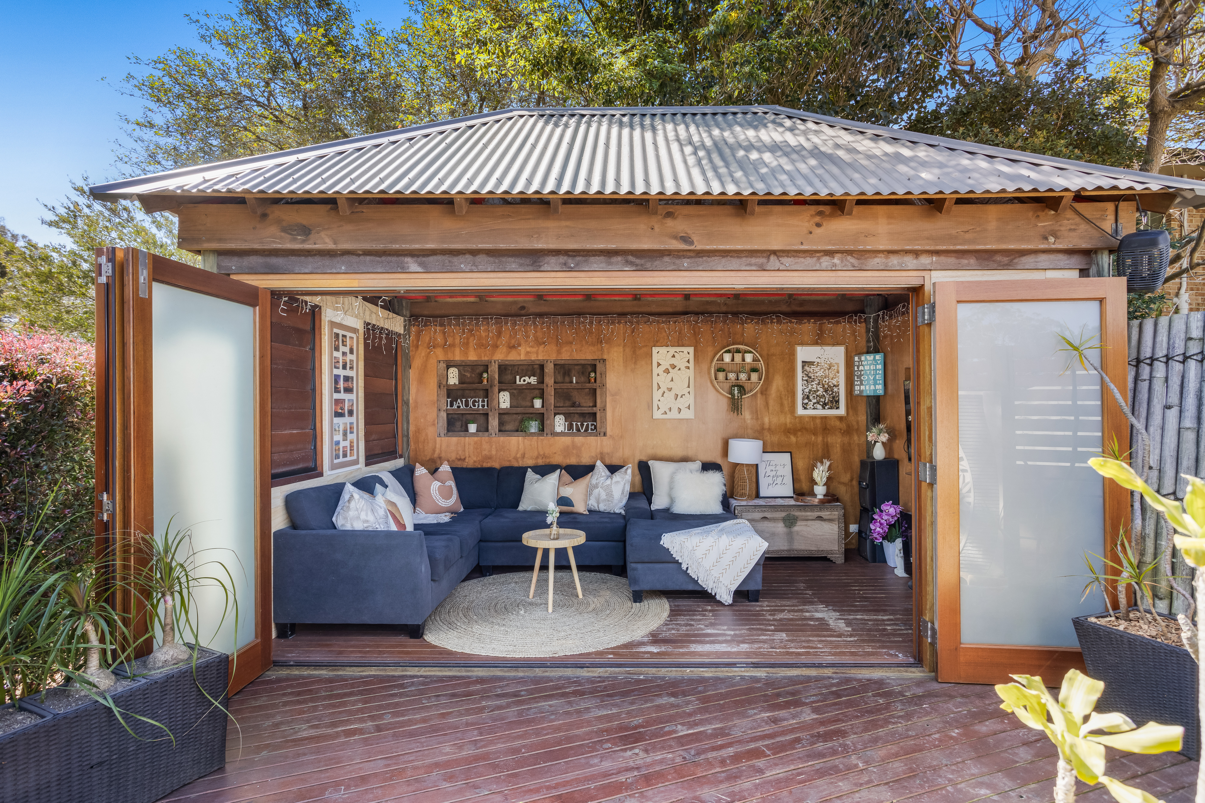 – Balinese inspired cabana/retreat, level lawn merges with nature strip