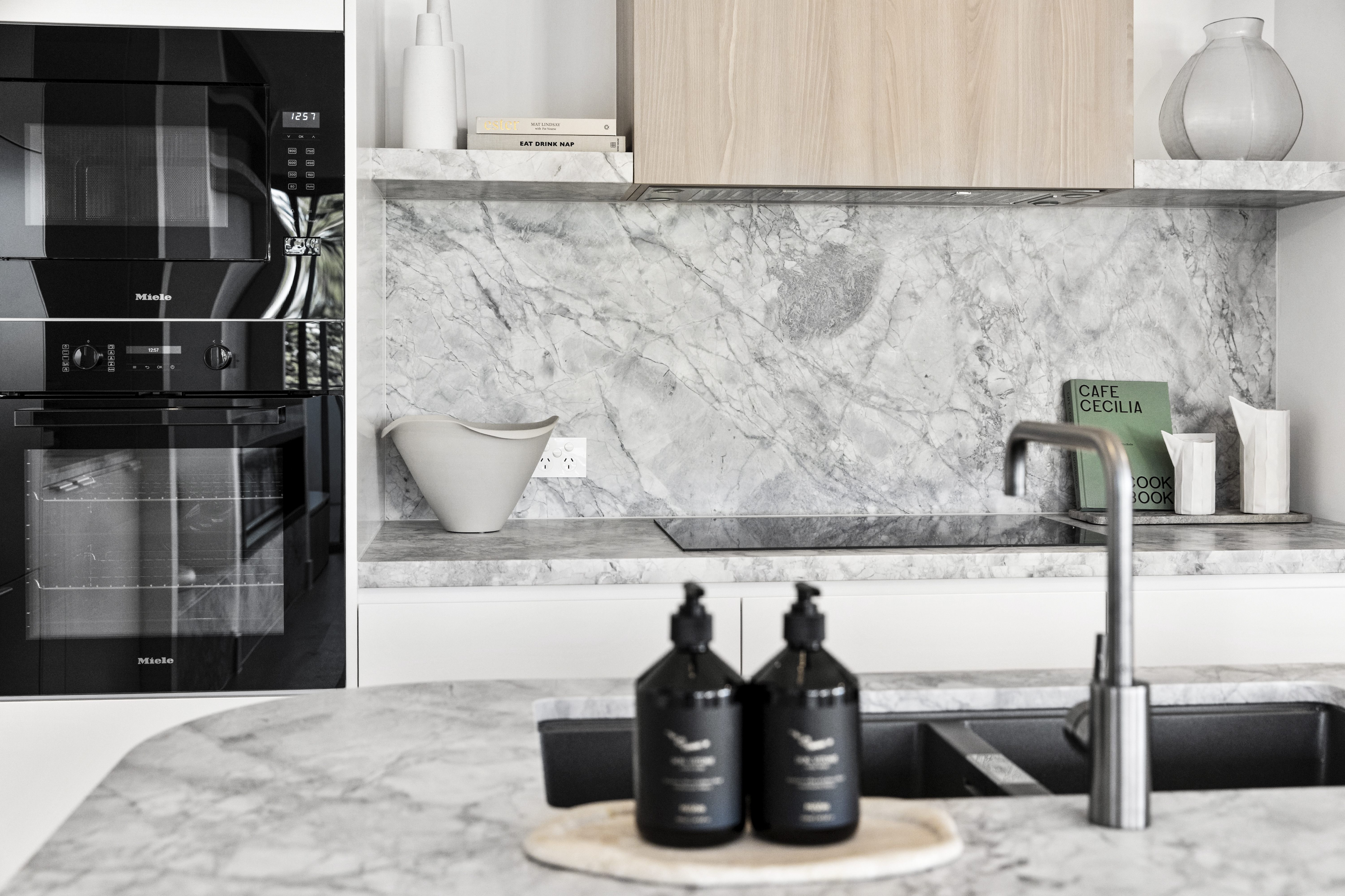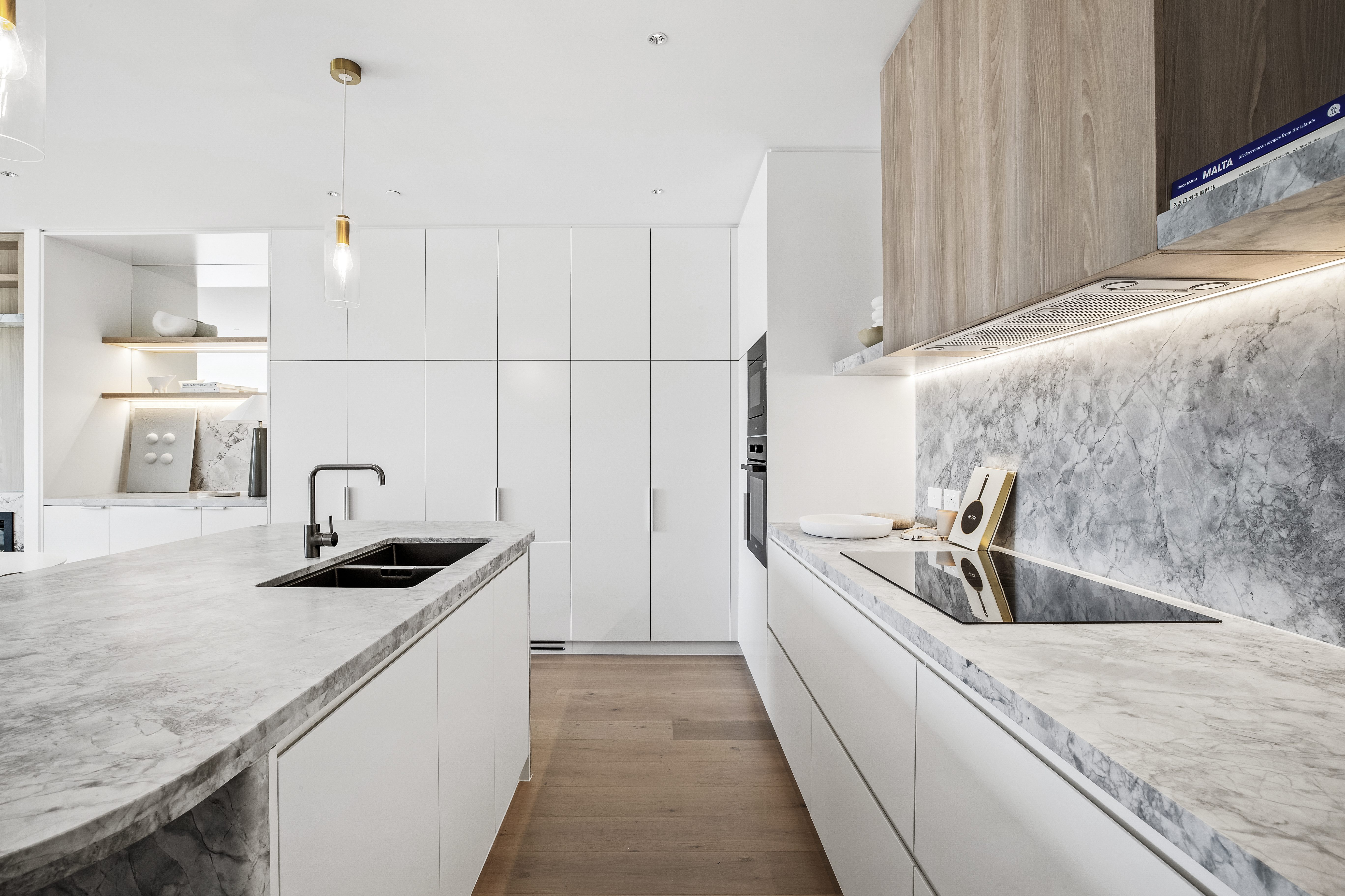 Thoughtfully curated interiors blend marble, bespoke joinery and warm timber tones to create a sophisticated yet relaxed atmosphere. The generous open-plan living and dining area flows effortlessly to a sun-drenched terrace, perfect for entertaining against a backdrop of blue skies and ocean glimpses. A gourmet kitchen with premium appliances and an integrated bar enhances the sense of understated luxury.